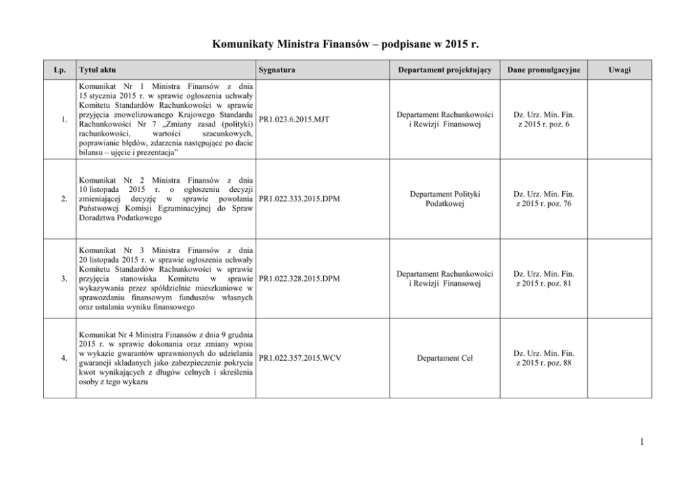 Komunikaty Ministra Finansów – podpisane w 2015 r. Lp. Tytuł aktu Sygnatura Departament projektujący Dane promulgacyjne Departament Rachunkowości i Rewizji Finansowej Dz. Urz. Min. Fin. z 2015 r. poz. 6 1. Komunikat Nr 1 Ministra Finansów z dnia 15 stycznia 2015 r. w sprawie ogłoszenia uchwały Komitetu Standardów Rachunkowości w sprawie przyjęcia znowelizowanego Krajowego Standardu PR1.023.6.2015.MJT Rachunkowości Nr 7 „Zmiany zasad (polityki) rachunkowości, wartości szacunkowych, poprawianie błędów, zdarzenia następujące po dacie bilansu – ujęcie i prezentacja” 2. Komunikat Nr 2 Ministra Finansów z dnia 10 listopada 2015 r. o ogłoszeniu decyzji zmieniającej decyzję w sprawie powołania PR1.022.333.2015.DPM Państwowej Komisji Egzaminacyjnej do Spraw Doradztwa Podatkowego Departament Polityki Podatkowej Dz. Urz. Min. Fin. z 2015 r. poz. 76 3. Komunikat Nr 3 Ministra Finansów z dnia 20 listopada 2015 r. w sprawie ogłoszenia uchwały Komitetu Standardów Rachunkowości w sprawie przyjęcia stanowiska Komitetu w sprawie PR1.022.328.2015.DPM wykazywania przez spółdzielnie mieszkaniowe w sprawozdaniu finansowym funduszów własnych oraz ustalania wyniku finansowego Departament Rachunkowości i Rewizji Finansowej Dz. Urz. Min. Fin. z 2015 r. poz. 81 4. Komunikat Nr 4 Ministra Finansów z dnia 9 grudnia 2015 r. w sprawie dokonania oraz zmiany wpisu w wykazie gwarantów uprawnionych do udzielania PR1.022.357.2015.WCV gwarancji składanych jako zabezpieczenie pokrycia kwot wynikających z długów celnych i skreślenia osoby z tego wykazu Departament Ceł Dz. Urz. Min. Fin. z 2015 r. poz. 88 Uwagi 1 Lp. 5. 6. Tytuł aktu Sygnatura Komunikat Nr 5 Ministra Finansów z dnia 30 grudnia 2015 r. w sprawie ogłoszenia uchwały Komitetu Standardów Rachunkowości w sprawie przyjęcia znowelizowanego Krajowego Standardu Rachunkowości Nr 7 „Zmiany zasad (polityki) PR1.022.375.2015.LAA rachunkowości, wartości szacunkowych, poprawianie błędów, zdarzenia następujące po dniu bilansowym - ujęcie i prezentacja” Komunikat Nr 6 Ministra Finansów z dnia 30 grudnia 2015 w sprawie ogłoszenia uchwały Komitetu Standardów Rachunkowości w sprawie PR1.022.361.2015. DPM przyjęcia znowelizowanego stanowiska Komitetu w sprawie księgowego ujęcia uprawnień do emisji gazów cieplarnianych Departament projektujący Dane promulgacyjne Departament Rachunkowości i Rewizji Finansowej Dz. Urz. Min. Fin z 2016 r. poz. .2 Departament Rachunkowości i Rewizji Finansowej Dz. Urz. Min. Fin z 2016 r. poz. 6 Uwagi 2