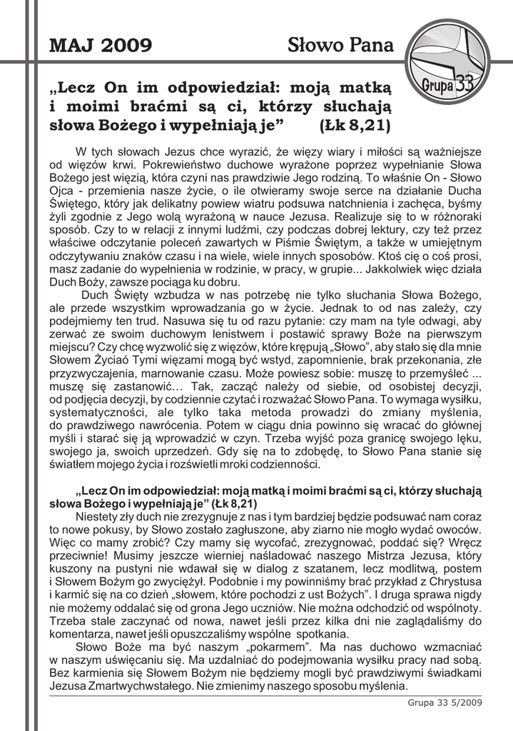 MAJ 2009 „Lecz On im odpowiedział: moją matką i moimi braćmi są ci, którzy słuchają słowa Bożego i wypełniają je” (Łk 8,21) W tych słowach Jezus chce wyrazić, że więzy wiary i miłości są ważniejsze od więzów krwi. Pokrewieństwo duchowe wyrażone poprzez wypełnianie Słowa Bożego jest więzią, która czyni nas prawdziwie Jego rodziną. To właśnie On - Słowo Ojca - przemienia nasze życie, o ile otwieramy swoje serce na działanie Ducha Świętego, który jak delikatny powiew wiatru podsuwa natchnienia i zachęca, byśmy żyli zgodnie z Jego wolą wyrażoną w nauce Jezusa. Realizuje się to w różnoraki sposób. Czy to w relacji z innymi ludźmi, czy podczas dobrej lektury, czy też przez właściwe odczytanie poleceń zawartych w Piśmie Świętym, a także w umiejętnym odczytywaniu znaków czasu i na wiele, wiele innych sposobów. Ktoś cię o coś prosi, masz zadanie do wypełnienia w rodzinie, w pracy, w grupie... Jakkolwiek więc działa Duch Boży, zawsze pociąga ku dobru. Duch Święty wzbudza w nas potrzebę nie tylko słuchania Słowa Bożego, ale przede wszystkim wprowadzania go w życie. Jednak to od nas zależy, czy podejmiemy ten trud. Nasuwa się tu od razu pytanie: czy mam na tyle odwagi, aby zerwać ze swoim duchowym lenistwem i postawić sprawy Boże na pierwszym miejscu? Czy chcę wyzwolić się z więzów, które krępują „Słowo”, aby stało się dla mnie Słowem Życia? Tymi więzami mogą być wstyd, zapomnienie, brak przekonania, złe przyzwyczajenia, marnowanie czasu. Może powiesz sobie: muszę to przemyśleć ... muszę się zastanowić… Tak, zacząć należy od siebie, od osobistej decyzji, od podjęcia decyzji, by codziennie czytać i rozważać Słowo Pana. To wymaga wysiłku, systematyczności, ale tylko taka metoda prowadzi do zmiany myślenia, do prawdziwego nawrócenia. Potem w ciągu dnia powinno się wracać do głównej myśli i starać się ją wprowadzić w czyn. Trzeba wyjść poza granicę swojego lęku, swojego ja, swoich uprzedzeń. Gdy się na to zdobędę, to Słowo Pana stanie się światłem mojego życia i rozświetli mroki codzienności. „Lecz On im odpowiedział: moją matką i moimi braćmi są ci, którzy słuchają słowa Bożego i wypełniają je” (Łk 8,21) Niestety zły duch nie zrezygnuje z nas i tym bardziej będzie podsuwać nam coraz to nowe pokusy, by Słowo zostało zagłuszone, aby ziarno nie mogło wydać owoców. Więc co mamy zrobić? Czy mamy się wycofać, zrezygnować, poddać się? Wręcz przeciwnie! Musimy jeszcze wierniej naśladować naszego Mistrza Jezusa, który kuszony na pustyni nie wdawał się w dialog z szatanem, lecz modlitwą, postem i Słowem Bożym go zwyciężył. Podobnie i my powinniśmy brać przykład z Chrystusa i karmić się na co dzień „słowem, które pochodzi z ust Bożych”. I druga sprawa nigdy nie możemy oddalać się od grona Jego uczniów. Nie można odchodzić od wspólnoty. Trzeba stale zaczynać od nowa, nawet jeśli przez kilka dni nie zaglądaliśmy do komentarza, nawet jeśli opuszczaliśmy wspólne spotkania. Słowo Boże ma być naszym „pokarmem”. Ma nas duchowo wzmacniać w naszym uświęcaniu się. Ma uzdalniać do podejmowania wysiłku pracy nad sobą. Bez karmienia się Słowem Bożym nie będziemy mogli być prawdziwymi świadkami Jezusa Zmartwychwstałego. Nie zmienimy naszego sposobu myślenia. Grupa 33 5/2009 „Lecz On im odpowiedział: moją matką i moimi braćmi są ci, którzy słuchają słowa Bożego i wypełniają je” (Łk 8,21) MAJ 2009 Pismo Święte jest jak tabernakulum, w którym przechowuje sie żywego Jezusa, adoruje się Go i uwielbia. Przez to Słowo, złożone w ręce Kościoła, Bóg chce przemawiać do nas, chce przemawiać do naszego serca. On zawarł w nim Swoją wolę względem nas, dlatego słuchajmy słowa Bożego, które jest jak drogowskaz. Ono wskazuje nam właściwy kierunek, pokazuje, co powinno byś dla nas najważniejsze, a o co nie powinniśmy się zbytnio troskać. Kiedy będziemy codziennie spotykać się z Bogiem w Jego słowie, to będziemy mieć pewność, że nie zbłądzimy. Przestaniemy się bać o naszą przyszłość, bo będziemy szli z Bożym słowem w sercu. Nie pozwólmy, by szatan oderwał nas od wspólnoty, w której Słowo Boże jest głoszone, rozważane i gdzie słyszymy świadectwa tych, którzy nim żyją. Nie pozwólmy, by troski tego świata zagłuszyły Słowa. Gdy tylko jest to możliwe spotykajmy sią wraz z braćmi, by rozważać i dzielić sie doświadczeniem życia Słowem Pana. Wzywajmy w modlitwie Ducha Świętego. Prośmy o pomoc, o oświecenie umysłu i serca, abyśmy mogli pojąć słowo Boże, by nasze serca stały się ziemią żyzną, by Słowo zakiełkowało w sercu każdego z nas i wydało owoce. Szukajmy światła i życia w Słowie Bożym i pozwólmy się prowadzić przez nie w swej ziemskiej pielgrzymce. Niech ono będzie lampą dla twoich kroków i światłem na twojej ścieżce. Grupa XVI Krótki miłosny list od Ojca Moje dziecko, Możesz mnie nie znać, ale Ja wiem o Tobie wszystko (Ps 139,1) Wiem kiedy siedzisz i kiedy wstajesz (Ps 139,2) Znam wszystkie Twoje drogi (Ps 139,3) We mnie żyjesz, poruszasz się i jesteś (Dz 17,28) Znałem Cię zanim zostałeś poczęty (Jr 1,4-5) Nie byłeś pomyłką (Ps 139,15) Wszystkie Twoje dni są zapisane w mojej księdze (Ps 139,16) Określiłem dokładny czas Twojego urodzenia i miejsce zamieszkania (Dz 17,26) Nie jestem odległy i gniewny, jestem pełnią miłości (1 J 4,16) I całym sercem pragnę Cię tą miłością obdarzyć (1 J 3,1) Wszelkie dobro, jakie otrzymujesz, pochodzi z mojej ręki (Jk 1,17) Zaopatruję cię i zaspokajam wszystkie Twoje potrzeby (Mt 6,31-33) Moim planem jest dać ci dobrą przyszłość (Jr 29,11) Ponieważ kocham Cię miłością wieczną i nieskończoną (Jr 31,3) Nigdy nie przestanę czynić Ci dobra (Jr 32,40) Gdyż jesteś moją drogocenną własnością (Wj 19,5