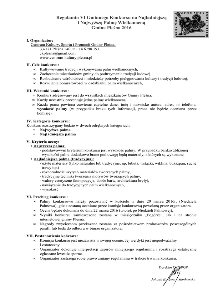 Regulamin VI Gminnego Konkursu na Najładniejszą i Najwyższą Palmę Wielkanocną Gmina Pleśna 2016 I. Organizator: Centrum Kultury, Sportu i Promocji Gminy Pleśna. 33-171 Pleśna 240, tel. 14 6798 191 [email protected] www.centrum-kultury.plesna.pl II. Cele konkursu: • Kultywowanie tradycji wykonywania palm wielkanocnych, • Zachęcenie mieszkańców gminy do podtrzymania tradycji ludowej, • Rozbudzenie wśród dzieci i młodzieży potrzeby pielęgnowania kultury i tradycji ludowej, • Rozwijanie pomysłowości w ozdabianiu palm wielkanocnych, III. Warunki konkursu: • Konkurs adresowany jest do wszystkich mieszkańców Gminy Pleśna. • Każdy uczestnik prezentuje jedną palmę wielkanocną. • Każda praca powinna zawierać czytelne dane: imię i nazwisko autora, adres, nr telefonu, wysokość palmy (w przypadku braku tych informacji, praca nie będzie oceniana przez komisję). IV. Kategorie konkursu: Konkurs rozstrzygany będzie w dwóch odrębnych kategoriach: • Najwyższa palma • Najładniejsza palma V. Kryteria oceny: • najwyższa palma: - podstawowym kryterium konkursu jest wysokość palmy. W przypadku bardzo zbliżonej wysokości palm, dodatkowo brane pod uwagę będą materiały, z których są wykonane. • najładniejsza palma (tradycyjna): - użyte materiały (tylko naturalne lub tradycyjne, np. bibuła, wstążki, wiklina, bukszpan, suche trawy itp.) - różnorodność użytych materiałów tworzących palmy, - tradycyjne techniki tworzenia motywów tworzących palmy, - walory estetyczne (kompozycja, dobór barw, architektura bryły), - nawiązanie do tradycyjnych palm wielkanocnych, - wysokość. VI. Przebieg konkursu: • Palmy konkursowe należy pozostawić w kościele w dniu 20 marca 2016r. (Niedziela Palmowa), gdzie zostaną ocenione przez komisję konkursową powołaną przez organizatora. • Ocena będzie dokonana do dnia 22 marca 2016 (wtorek po Niedzieli Palmowej). • Wyniki konkursu zamieszczone zostaną w miesięczniku „Pogórze”, jak i na stronie internetowej gminy Pleśna. • Nagrody zwycięzcom przekazane zostaną za pośrednictwem proboszczów poszczególnych parafii lub będą do odbioru w biurze organizatora. VII. Postanowienia końcowe: • Komisja konkursu jest niezawisła w swojej ocenie. Jej werdykt jest niepodważalny i ostateczny. • Organizator dokonuje interpretacji zapisów niniejszego regulaminu i rozstrzyga ostatecznie zgłaszane kwestie sporne. • Organizator zastrzega sobie prawo zmiany regulaminu w trakcie trwania konkursu.