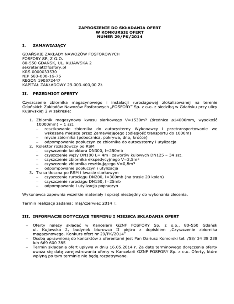 ZAPROSZENIE DO SKŁADANIA OFERT W KONKURSIE OFERT NUMER 29/PK/2014 I. ZAMAWIAJĄCY GDAŃSKIE ZAKŁADY NAWOZÓW FOSFOROWYCH FOSFORY SP. Z O.O. 80-550 GDAŃSK, UL. KUJAWSKA 2 [email protected] KRS 0000033530 NIP 583-000-16-75 REGON 190572447 KAPITAŁ ZAKŁADOWY 29.003.400,00 ZŁ II. PRZEDMIOT OFERTY Czyszczenie zbiornika magazynowego i instalacji rurociągowej zlokalizowanej na terenie Gdańskich Zakładów Nawozów Fosforowych „FOSFORY” Sp. z o.o. z siedzibą w Gdańsku przy ulicy Kujawskiej 2 w zakresie: 1. Zbiornik magazynowy kwasu siarkowego V=1530m³ (średnica ø14000mm, wysokość 10000mm) – 1 szt. − resztkowanie zbiornika do autocysterny Wykonawcy i przetransportowanie we wskazane miejsce przez Zamawiającego (odległość transportu do 1000m) − mycie zbiornika (pobocznica, pokrywa, dno, króćce) − odpompowanie popłuczyn ze zbiornika do autocysterny i utylizacja 2. Kolektor rozładowczy po RSM − czyszczenie kolektora DN300, l=250mb − czyszczenie węŜy DN100 L= 4m i zaworów kulowych DN125 – 34 szt. − czyszczenie zbiornika ekspedycyjnego V=3,5m³ − czyszczenie zbiornika resztkującego V=0,8m³ − odpompowanie popłuczyn i utylizacja 3. Trasa tłoczna po RSM i kwasie siarkowym − czyszczenie rurociągu DN200, l=300mb (na trasie 20 kolan) − czyszczenie rurociągu DN150, l=25mb − odpompowanie i utylizacja popłuczyn Wykonawca zapewnia wszelkie materiały i sprzęt niezbędny do wykonania zlecenia. Termin realizacji zadania: maj/czerwiec 2014 r. III. INFORMACJE DOTYCZĄCE TERMINU I MIEJSCA SKŁADANIA OFERT − − − Oferty naleŜy składać w Kancelarii GZNF FOSFORY Sp. z o.o., 80-550 Gdańsk ul. Kujawska 2, budynek biurowca II piętro z dopiskiem „Czyszczenie zbiornika magazynowego. Konkurs ofert nr 29/PK/2014” Osobą uprawnioną do kontaktów z oferentami jest Pan Dariusz Komorski tel. /58/ 34 38 238 lub 669 600 385 Termin składania ofert upływa w dniu 16.05.2014 r. Za datę terminowego doręczenia oferty uwaŜa się datę zarejestrowania oferty w Kancelarii GZNF FOSFORY Sp. z o.o. Oferty, które wpłyną po tym terminie nie będą rozpatrywane. IV. KRYTERIA OCENY SPEŁNIENIA DOSTAWCÓW/WYKONAWCÓW L.p. 1. 2. 3. 4. V. − − − − − − − VI. − − − − − − WARUNKÓW Kryteria Cena Czas realizacji Referencje Wiarygodność w ocenie członków Komisji WYMAGANYCH OD Znaczenie 70% 10% 10% 10% OFERTA POWINNA ZAWIERAĆ Szczegółowy zakres prac Termin wykonania prac Cenę ofertową za wykonanie kompletnego zakresu prac Warunki płatności Warunki gwarancyjne Informację o kwalifikacjach posiadanej kadry technicznej Referencje lub informacje o wykonanych pracach podobnego typu WYMAGANE ZAŁĄCZNIKI Kserokopia dokumentu rejestrowego oferenta Kserokopia numeru NIP, REGON Dokumenty pozwalające ocenić wiarygodność techniczną i ekonomiczna oferenta (np. kadra techniczna, sprzęt itp.) Oświadczenie o sytuacji finansowej zapewniającej wykonanie zamówienia Oświadczenie o braku wszczęcia w stosunku do oferenta postępowania upadłościowego lub układowego Oświadczenie o nie zaleganiu z uiszczaniem podatków, opłat lub składek na ubezpieczenia społeczne VII. UWAGI KOŃCOWE − − − Wszystkie dokumenty ofertowe muszą być podpisane przez osoby uprawnione do reprezentowania firmy W przypadku zawarcia umowy deklarowane parametry rozliczeń nie będą podlegały zmianie przez cały jej okres działania W przypadku wątpliwości lub koniecznych uzupełnień po otwarciu ofert zastrzega się prawo do przeprowadzenia rozmów uzupełniających i ewentualnych negocjacji lub do zamknięcia konkursu ofert bez dokonania wyboru którejkolwiek z ofert bez podania przyczyn