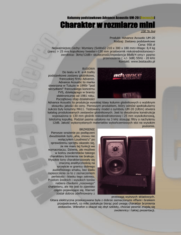 Kolumny podstawkowe Advance Acoustic UM-20 [Recenzja] Charakter w rozmiarze mini 100 % live Produkt: Advance Acoustic UM-20 Rodzaj: Zestawy podstawkowe Cena: 950 zł Najważniejsze Cechy: Wymiary (SxWxG) 210 x 300 x 180 mm>Waga: 8,4 kg (para) > 25 mm kopułkowy tweeter>130 mm przetwornik niskośredniotonowy> zwrotnica: 3kHz/12dB> skuteczność/impedancja 88dB/4 omy> pasmo przenoszenia ( +/- 3dB) 55Hz - 20 kHz Kontakt: www.bestaudio.pl BUDOWA Do testu w R e-A trafiły podstawkowe zestawy głośnikowe, francuskiej firmy Advance. Advance Acoustic to marka stworzona w Tuluzie w 1995r "pod skrzydłami" francuskiego koncernu FVS, działającego w branży elektronicznej od 1981 roku. Początkowy etap działalności Advance Acoustic to produkcja wysokiej klasy kolumn głośnikowych o wybitnym stosunku jakości do ceny. Pierwszym produktem, który odniósł spektakularny sukces były kolumny MA11. Testowany model o symbolu UM-20 (Ultim) otwiera katalog produkowanych zestawów głośnikowych. Jest to dwudrożna konstrukcja wyposażona w 130 mm głośnik niskośredniotonowy i 25 mm wysokotonową, tekstylną kopułkę. Podział pasma ustalono na 3 kHz stosując filtry o nachyleniu 12dB. Jakość wykorzystanych materiałów wykończeniowych stoi na wysokim poziomie. BRZMIENIE Pierwsze wrażenie po podłączeni dwudziestek było „aha, znowu nie wyłączyłem Loudness’u” po sprawdzeniu sprzętu okazało się, że nie mam tej funkcji we wzmacniaczu. Dziwne, ale możliwe w końcu zwolenników takiego charakteru brzmienia nie brakuje. Wysokie tony charakteryzowały się znaczną analitycznością na szczęście w granicy dobrego audiofilskiego smaku, bez śladu zapiaszczenia za to z zaznaczeniem perlistości i blasku tego zakresu. Przełom średnich i wysokich tonów nabiera chwilami „nosowego” charakteru, ale nie jest to zjawisko często pojawiające się. Klarnet został dobrze zdefiniowany z przewagą wyższych składowych. Gitara elektryczna przekazywana była z dobrze zaznaczonymi riffami i brakiem przejaskrawień, co mile zaskakuje biorąc pod uwagę charakter brzmienia zestawów. Wibrafon o okazał się zbyt szklisty, chociaż pewnie znajdą się zwolennicy i takiej prezentacji. Scena rysowana była w linii łączącej zestawy głośnikowe jak również za linią, wprowadzając lekkie uprzestrzennienie przekazu muzycznego. Pozorne źródła dźwięku dobrze rozłożone na scenie z bardzo dobrą stabilnością przekazu, co wymaga zaznaczenia w tym zakresie cenowym. Zestawy bez problemu „znikają” z pomieszczenia odsłuchowego, co tylko potęguje jak najbardziej przyjemne wrażenia podczas słuchania muzyki. Brzmienie perkusji oddane poprawnie z dobrym tempem i stopą zaznaczoną górnym zakresem niskich częstotliwości. Mimo niewielkich gabarytów zakres najniższych częstotliwości oddany został poprawnie. Advance nie silą się na przetwarzanie najniższych składowych, zadowalając się tylko częścią którą są w stanie przekazać a robią to bardzo dobrze. Mimo dość szczupłego sposobu prezentacji tego zakresu, zestawy bardzo dobrze radzą sobie z oddaniem tempa małych składów jazzowych. Kontrabas mimo wszystko ciekawie przekazany, poprawnie spełnia swoje zadanie. Małe Ultimy bardzo dobrze radzą sobie z oddaniem szybkości i gwałtownych zmian w odtwarzanym materiale muzycznym. Przekaz jest jak najbardziej wciągający i co najważniejsze nie ma żadnych męczących cech. Nie jest to jednak przekaz neutralny, co w tym zakresie jest dość często spotykane, ale ma swój charakter, dynamiczny charakter. Advance w sposób sobie tylko znany nadają utworom wiele życia sprawiając, że nie szybko się nudzą. Podsumowanie: Ciekawe zestawy, solidnie wykonane oferujące szybkie, energiczne i charakterystyczne brzmienie. Za: Przyjemny niemęczący przekaz, własny charakter brzmienia. Przeciw: Nie każdemu może odpowiadać sposób prezentacji, może wzbudzać kontrowersje. www.magazynstereo.pl dobra strona audio 21.08.2008