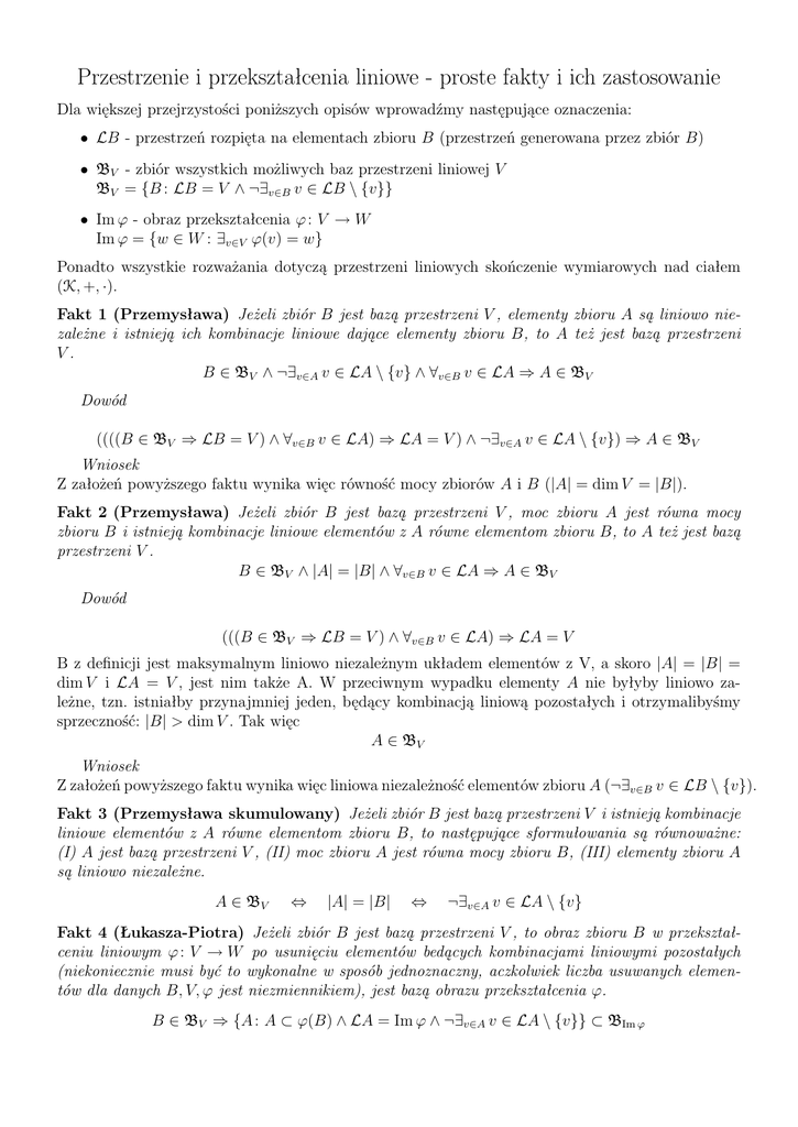 Fakt 4 (Łukasza-Piotra) Jeżeli zbiór B jest bazą przestrzeni V , to obraz zbioru B w przekształceniu liniowym ϕ : V → W po usunięciu elementów bedących kombinacjami liniowymi pozostałych