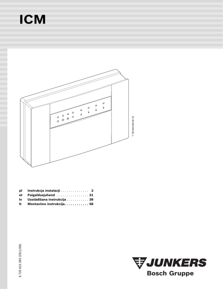 7 746 800 090-00.1O ICM 6 720 615 393 (2011/06) pl et lv lt Instrukcja instalacji . . . . . . . . . Paigaldusjuhend . . . . . . . . . . . Uzstādīšana instrukcija . . . . . . Montavimo instrukcija. . . . . . . ..... ..... ..... ..... 2 21 39 58 Spis treści Spis treści 1 Objaśnienie symboli i wskazówki dotyczące bezpieczeństwa . . . . . . . . . . . . . . . . . . . . . . . . . . 3 1.1 Objaśnienie symboli . . . . . . . . . . . . . . . . . 3 1.2 Wskazówki dotyczące bezpieczeństwa . . . 3 2 Dane modułu ICM . . . . . . . . . . . . . . . . . . . . . . . . 4 2.1 Użytkowanie zgodne z przeznaczeniem . . 4 2.2 Zakres dostawy . . . . . . . . . . . . . . . . . . . . . 4 2.3 Osprzęt . . . . . . . . . . . . . . . . . . . . . . . . . . . 4 2.4 Dane techniczne . . . . . . . . . . . . . . . . . . . . 4 2.4.1 Informacje ogólne . . . . . . . . . . . . . . . . . . . 4 2.4.2 Wartości pomiarowe czujnika temperatury zasilania . . . . . . . . . . . . . . . . . 5 2.4.3 Wartości pomiarowe czujnika temperatury zewnętrznej . . . . . . . . . . . . . . 5 2.4.4 Parametry przyłącza elektrycznego . . . . . . 5 2.5 Integracja systemowa ICM . . . . . . . . . . . . 6 2.5.1 Regulacja ogrzewania przy systemach kaskadowych ICM . . . . . . . . . . . . . . . . . . . 6 2.5.2 Przygotowanie c.w.u. w układzie kaskadowym ICM . . . . . . . . . . . . . . . . . . . . 6 2.5.3 Wewnętrzne funkcja ochrony przed zamarzaniem . . . . . . . . . . . . . . . . . . . . . . . 6 2.5.4 Zasady regulacji kaskadowej . . . . . . . . . . . 7 2.5.5 Sterowanie pompy obiegu grzewczego . . . 7 2.5.6 Przegląd wariantów systemu . . . . . . . . . . 7 2.5.7 Podłączenie kolejnych modułów w przypadku regulatorów ogrzewania ze sterowaniem poprzez magistralę BUS 2-przewodową. . . . . . . . . . . . . . . . . . . 9 2.6 Schemat . . . . . . . . . . . . . . . . . . . . . . . . . 10 3 2 Montaż . . . . . . . . . . . . . . . . . . . . . . . . . . . . . . . 11 3.1 Montaż . . . . . . . . . . . . . . . . . . . . . . . . . . 11 3.1.1 Montaż na ścianie . . . . . . . . . . . . . . . . . . 11 3.1.2 Montaż na szynie montażowej 35 mm (DIN-Rail 46277 lub EN 60 715-TH 35-7.5) . . . . . . . . . . . . . . . . 12 3.1.3 Demontaż z szyny montażowej . . . . . . . . 12 3.2 Podłączenie elektryczne . . . . . . . . . . . . . 12 3.2.1 Podłączenie części niskonapięciowej z połączeniami z magistralą BUS . . . . . . . 12 3.2.2 Przyłącze sieciowe 230 V AC . . . . . . . . . . 13 3.2.3 Podłączenie zdalnego wskaźnika usterek z meldunkiem optycznymi lub akustycznym . . . . . . . . . . . . . . . . . . . . 13 3.2.4 Podłączenie elektryczne zewnętrznego czujnika temperatury . . . . . . . . . . . . . . . . 13 3.2.5 Utylizacja . . . . . . . . . . . . . . . . . . . . . . . . . 13 3.3 Montaż osprzętu dodatkowego . . . . . . . . 13 4 Uruchomienie i wyłączenie . . . . . . . . . . . . . . . . 4.1 Konfiguracja . . . . . . . . . . . . . . . . . . . . . . . 4.2 Uruchomienie . . . . . . . . . . . . . . . . . . . . . . 4.3 Reset konfiguracji . . . . . . . . . . . . . . . . . . 4.4 Wyłączenie instalacji z ruchu . . . . . . . . . . 14 14 14 14 15 5 Wskazania stanów pracy i usterek . . . . . . . . . . 16 5.1 Wskazanie stanu pracy i usterek poprzez wyświetlacze na kotłach . . . . . . .16 5.2 Wskazanie usterek poprzez zdalny wskaźnik usterek . . . . . . . . . . . . . . . . . . .16 5.3 Wskazanie stanu pracy i usterek na regulatorze ogrzewania (FW 500 lub FW 200) . . . . . . . . . . . . . . . . . . . . . . . . . .16 5.4 Wskazanie stanu pracy i usterek przez wskaźniki LED na module ICM . . . . . . . . .17 5.5 Wymiana bezpiecznika dla przyłącza pompy obiegu grzewczego. . . . . . . . . . . .19 6 Ochrona środowiska . . . . . . . . . . . . . . . . . . . . . 20 Informacje dotyczące dokumentacji Wszystkie załączone dokumenty należy przekazać użytkownikowi. Zastrzega się możliwość wprowadzenia zmian w związku z ulepszeniami technicznymi! objaśnienie symboli 6 720 615 393 (2011/06) Objaśnienie symboli i wskazówki dotyczące bezpieczeństwa 1 Objaśnienie symboli i wskazówki dotyczące bezpieczeństwa 1.1 Objaśnienie symboli Wskazówki dotyczące bezpieczeństwa będą oznaczone w tekście trójkątem ostrzegawczym. Słowa wytłuszczone oznaczają możliwe niebezpieczeństwo, jeśli nie będzie się przestrzegało odpowiednich zaleceń. • Uwaga oznacza, że mogą nastąpić lekkie uszkodzenia przedmiotów. • Ostrzeżenie oznacza, że może dojść do lekkiego uszkodzenia ciała lub cięższych uszkodzeń przedmiotów. • Niebezpieczeństwo oznacza, że może dojść do uszkodzenia ciała. W szczególnych przypadkach zagrożone może być życie. Wskazówki w tekście będą oznaczone znajdującym się obok symbolem. Wskazówki zawierają ważne informacje w przypadkach, gdy nie istnieje niebezpieczeństwo dla ludzi i sprzętu. 6 720 615 393 (2011/06) 1.2 Wskazówki dotyczące bezpieczeństwa B Aby zapewnić poprawne funkcjonowanie urządzenia, przestrzegać instrukcji obsługi. B Kocioł oraz pozostałe elementy osprzętu należy montować i uruchamiać zgodnie z odpowiednimi instrukcjami. B Montaż osprzętu należy zlecać tylko wykwalifikowanemu instalatorowi. B Osprzęt wolno instalować jedynie wraz z regulatorami i urządzeniami grzewczymi znajdującymi się w wykazie. Przestrzegać schematu połączeń! B Moduł zasilany jest różnym napięciem. Obwód nieskonapięciowy nie może być podłączany do zasilania 230 V i odwrotnie. B Przed montażem regulatora i modułu magistrali danych: od kotła i wszystkich pozostałych abonentów magistrali danych odłączyć zasilanie elektryczne (230 V AC). B Przy montażu ściennym: nie wolno montować osprzętu w pomieszczeniach zawilgoconych. 3 Dane modułu ICM 2 Dane modułu ICM 2.1 Użytkowanie zgodne z przeznaczeniem 2.3 Tutaj znajduje się lista zawierająca typowy osprzęt. Aby otrzymać całościowe zestawienie wszystkich dostarczanych elementów osprzętu, należy zwrócić się do producen