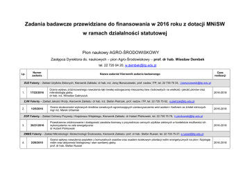 Zadania badawcze przewidziane do finansowania w 2016 roku z dotacji MNiSW w ramach działalności statutowej Pion naukowy AGRO-ŚRODOWISKOWY Zastępca Dyrektora ds. naukowych – pion Agro-Środowiskowy – prof. dr hab. Wiesław Dembek tel. 22 720 04 20, [email protected] Lp. Numer zadania Nazwa zadania/ Kierownik zadania badawczego Czas realizacji ZUZ Falenty – Zakład Użytków Zielonych, Kierownik Zakładu: dr hab. inż. Jerzy Barszczewski, prof. nadzw. ITP, tel. 22 735 75 33, [email protected] 1. 17/22/2016 Ocena wpływu zróżnicowanego nawożenia łąki trwałej wzbogaconej mieszanką traw i bobowatych na wielkość i jakość plonów oraz mikrobiologię gleby. dr hab. inż. Mirosław Gabryszuk 2016-2018 ZJW Falenty – Zakład Jakości Wody, Kierownik Zakładu: dr hab. inż. Stefan Pietrzak, prof. nadzw. ITP, tel. 22 735 75 62, [email protected] 2. 1/25/2016 Ocena skuteczności wybranych środków zaradczych ograniczających zanieczyszczenie wód azotem i fosforem ze źródeł rolniczych. mgr inż. Marek Urbaniak 2016-2018 ZOP Falenty – Zakład Ochrony Przyrody i Krajobrazu Wiejskiego, Kierownik Zakładu: dr Hubert Piórkowski, tel. 22 735 75 79, [email protected] 3. 26/21/2016 Przestrzenne zróżnicowanie i dostępność zasobów biomasy z przyrodniczo cennych użytków zielonych w kontekście możliwości ich wykorzystania na cele energetyczne. dr Hubert Piórkowski 2016-2018 ZMBŚ Falenty – Zakład Mikrobiologii i Biotechnologii Środowiska, Kierownik Zakładu: prof. dr hab. Stefan Russel, tel. 22 735 75 27, [email protected] 4. 2/26/2016 Ocena wpływu nawożenia popiołem z komunalnych osadów oraz osadem ściekowym plantacji roślin energetycznych na plon i fizjologię roślin oraz aktywność biologiczną i stan sanitarny gleby. prof. dr hab. Stefan Russel 2016-2018 ZZW Falenty – Zakład Zasobów Wodnych, Kierownik Zakładu: dr hab. inż. Tomasz Szymczak, prof. nadzw. ITP, tel. 22 735 75 55, [email protected] 5. 3/23/2016 Opracowanie innowacyjnych narzędzi wspomagających procesy decyzyjne w gospodarowaniu wodą na obszarach wiejskich. Etap I – symulacyjne modele prognostyczne. dr hab. inż. Tomasz Szymczak, prof. nadzw. 2016-2018 ZIWM Falenty – Zakład Inżynierii Wodnej i Melioracji, dr hab. inż. Józef Lipiński, prof. nadzw. ITP, tel. 22 735 75 45, [email protected] 6. 4/24/2016 Ekonomiczne, produkcyjne i klimatyczne uwarunkowania rozwoju drenowania gruntów ornych w Polsce. dr hab. inż. Józef Lipiński prof. nadzw. 2016-2018 7. 24/24/2016 Miejscowe odmulanie zbiorników wodnych bez potrzeby ich opróżniania. prof. dr hab. inż. Szczepan Ludwik Dąbkowski 2016-2018 ŻOB Elbląg – Żuławski Ośrodek Badawczy, Dyrektor: dr inż. Marcin Bukowski, tel. 55 232 44 08, [email protected] 8. 5/83/2016 Efekty ekonomiczne i skutki środowiskowe zmian w intensyfikacji produkcji rolnej i użytkowaniu polderowej rolniczej przestrzeni produkcyjnej. dr inż. Marcin Bukowski 2016-2018 MOB Kraków – Małopolski Ośrodek Badawczy, Dyrektor: prof. dr hab. inż. Stanisław Twardy, tel. 12 412 52 08 w.11, [email protected] 9. 19/85/2016 Inteligentne metody zintegrowanego zarządzania górskimi obszarami zlewniowymi w aspekcie ich zrównoważonego rozwoju. dr hab. inż. Marek Kopacz, prof. nadzw. 2016-2018 10. 6/85/2016 Zrównoważone gospodarowanie na intensywnych użytkach rolnych ograniczające zanieczyszczenia azotanami pochodzącymi ze źródeł rolniczych. dr inż. Sylwester Smoroń 2016-2018 KPOB Bydgoszcz – Kujawsko-Pomorski Ośrodek Badawczy, Dyrektor: prof. dr hab. inż. Leszek Łabędzki, tel. 52 370 02 17, [email protected] 11. 7/84/2016 Ocena zagrożenia agroklimatycznym deficytem wody przy zastosowaniu nowej kompleksowej metody standaryzacji warunków agrometeorologicznych. prof. dr hab. inż. Leszek Łabędzki 2016-2018 12. 16/84/2016 Określenie strumieni węgla oraz odpływu azotu w wybranych agroekosystemach na podstawie badań terenowych i analiz modelowych. dr inż. Janusz Turbiak 2016-2018 DOB Wrocław – Dolnośląski Ośrodek Badawczy, Dyrektor: dr hab. inż. Maria Strzelczyk, prof. nadzw. ITP, tel. 71 367 80 92 w.2, [email protected] 13. 25/86/2016 Intensyfikacja efektywności oczyszczania ścieków w środowisku glebowo-roślinnym. dr inż. Aleksandra Steinhoff-Wrześniewska 2016-2018 ZPOB Szczecin – Zachodniopomorski Ośrodek Badawczy, Dyrektor: dr inż. Piotr Burczyk, tel. 91 422 27 15, [email protected] 14. 18/82/2016 Ocena bioróżnorodności małych, polodowcowych zbiorników wodnych, ich klasyfikacja oraz metody rekultywacyjne zapobiegające postępującej biodegradacji na przykładzie wybranych mezoregionów Pobrzeża Szczecińskiego. dr inż. Adam Brysiewicz 2016-2018 15. 22/82/2016 Wpływ na środowisko obiektów inwentarskich (obór), o różnych rozwiązaniach techniczno-funkcjonalnych, zlokalizowanych na obszarze OSN Pomorza Zachodniego. dr inż. Andrzej M. Marciniak 2016-2018 GCB Tylicz – Górskie Centrum Badań i Wdrożeń, Kierownik: dr hab. inż. Andrzej Jucherski, prof. nadzw. ITP, tel./fax: 18 471 13 13, [email protected] 16. 8/81/2016 Badania, rozwój i wdrożenia innowacyjnych metod i środków do usuwania związków biogennych i zanieczyszczeń mikrobiologicznych oraz do renaturyzacji wód pościekowych w pojedynczych systemach oczyszczania ścieków bytowych na terenach wiejskich Karpat. dr hab. inż. Andrzej Jucherski, prof. nadzw. 2016-2018 LBIŚ - Falenty – Laboratorium Badawcze Inżynierii Środowiska, Kierownik: prof. dr hab. inż. Magdalena Borys, tel. 22 735 75 53, [email protected] 17. 9/32/2016 Określenie wpływu zastosowania wybranych spoiw do wzmocnienia gruntów dla celów budowy dróg rolniczych i ziemnych nasypów wodno-melioracyjnych. mgr inż. Konrad Piechowicz 2016-2018 LBCŚ - Falenty – Laboratorium Badawcze Chemii Środowiska, Kierownik: dr hab. inż. Irena Burzyńska, prof. nadzw. ITP, tel. 22 735 75 68, [email protected] 18. 10/31/2016 Specjacja fosforu w glebach użytkowanych rolniczo a ryzy