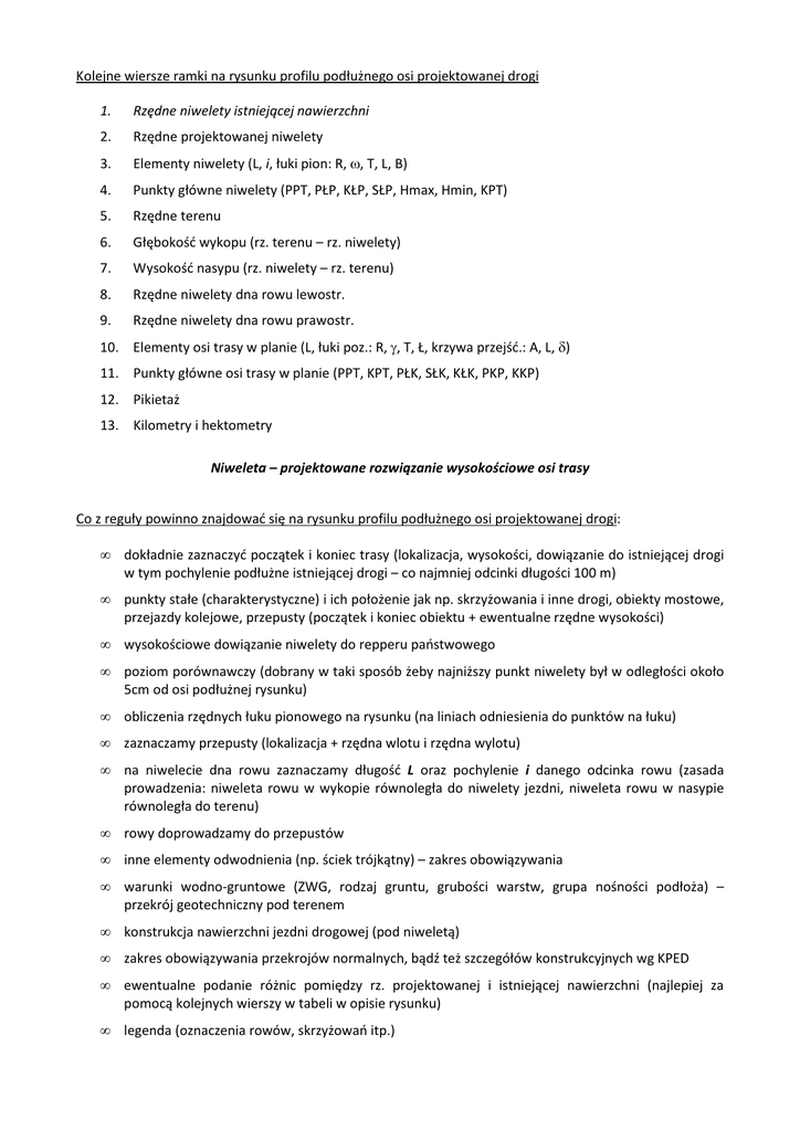 Kolejne wiersze ramki na rysunku profilu podłużnego osi projektowanej drogi 1. Rzędne niwelety istniejącej nawierzchni 2. Rzędne projektowanej niwelety 3. Elementy niwelety (L, i, łuki pion: R, ω, T, L, B) 4. Punkty główne niwelety (PPT, PŁP, KŁP, SŁP, Hmax, Hmin, KPT) 5. Rzędne terenu 6. Głębokość wykopu (rz. terenu – rz. niwelety) 7. Wysokość nasypu (rz. niwelety – rz. terenu) 8. Rzędne niwelety dna rowu lewostr. 9. Rzędne niwelety dna rowu prawostr. 10. Elementy osi trasy w planie (L, łuki poz.: R, γ, T, Ł, krzywa przejść.: A, L, δ) 11. Punkty główne osi trasy w planie (PPT, KPT, PŁK, SŁK, KŁK, PKP, KKP) 12. Pikietaż 13. Kilometry i hektometry Niweleta – projektowane rozwiązanie wysokościowe osi trasy Co z reguły powinno znajdować się na rysunku profilu podłużnego osi projektowanej drogi: • dokładnie zaznaczyć początek i koniec trasy (lokalizacja, wysokości, dowiązanie do istniejącej drogi w tym pochylenie podłużne istniejącej drogi – co najmniej odcinki długości 100 m) • punkty stałe (charakterystyczne) i ich położenie jak np. skrzyżowania i inne drogi, obiekty mostowe, przejazdy kolejowe, przepusty (początek i koniec obiektu + ewentualne rzędne wysokości) • wysokościowe dowiązanie niwelety do repperu państwowego • poziom porównawczy (dobrany w taki sposób żeby najniższy punkt niwelety był w odległości około 5cm od osi podłużnej rysunku) • obliczenia rzędnych łuku pionowego na rysunku (na liniach odniesienia do punktów na łuku) • zaznaczamy przepusty (lokalizacja + rzędna wlotu i rzędna wylotu) • na niwelecie dna rowu zaznaczamy długość L oraz pochylenie i danego odcinka rowu (zasada prowadzenia: niweleta rowu w wykopie równoległa do niwelety jezdni, niweleta rowu w nasypie równoległa do terenu) • rowy doprowadzamy do przepustów • inne elementy odwodnienia (np. ściek trójkątny) – zakres obowiązywania • warunki wodno-gruntowe (ZWG, rodzaj gruntu, grubości warstw, grupa nośności podłoża) – przekrój geotechniczny pod terenem • konstrukcja nawierzchni jezdni drogowej (pod niweletą) • zakres obowiązywania przekrojów normalnych, bądź też szczegółów konstrukcyjnych wg KPED • ewentualne podanie różnic pomiędzy rz. projektowanej i istniejącej nawierzchni (najlepiej za pomocą kolejnych wierszy w tabeli w opisie rysunku) • legenda (oznaczenia rowów, skrzyżowań itp.)