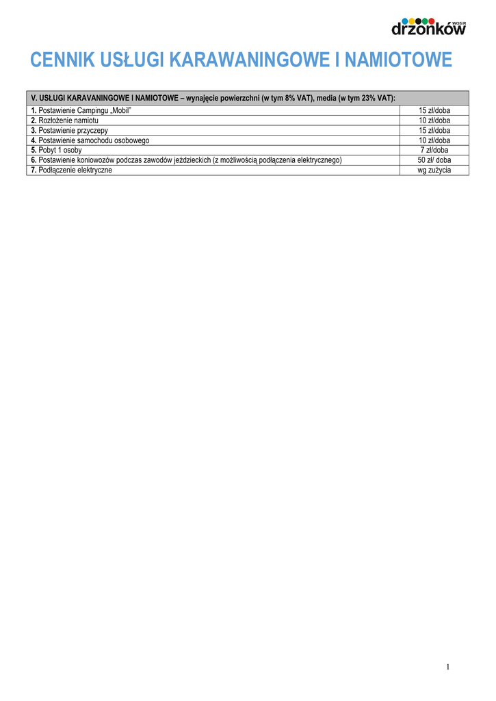 CENNIK USŁUGI KARAWANINGOWE I NAMIOTOWE V. USŁUGI KARAVANINGOWE I NAMIOTOWE – wynajęcie powierzchni (w tym 8% VAT), media (w tym 23% VAT): 1. Postawienie Campingu „Mobil” 2. Rozłożenie namiotu 3. Postawienie przyczepy 4. Postawienie samochodu osobowego 5. Pobyt 1 osoby 6. Postawienie koniowozów podczas zawodów jeździeckich (z możliwością podłączenia elektrycznego) 7. Podłączenie elektryczne 15 zł/doba 10 zł/doba 15 zł/doba 10 zł/doba 7 zł/doba 50 zł/ doba wg zużycia 1