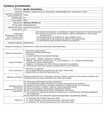 Sylabus przedmiotu Przedmiot: Język starożytny Kierunek: Filozofia, I stopień [6 sem], stacjonarny, ogólnoakademicki, rozpoczęty w: 2012 Tytuł lub szczegółowa Greka nazwa przedmiotu: Rok/Semestr: I/1 Liczba godzin: 30,0 Nauczyciel: Tymura, Dorota, dr Forma zajęć: konwersatorium Rodzaj zaliczenia: zaliczenie na ocenę Punkty ECTS: 2,0 15,0 Godziny kontaktowe z prowadzącym zajęcia realizowane w formie konsultacji 30,0 Godziny kontaktowe z prowadzącym zajęcia realizowane w formie zajęć dydaktycznych 5,0 Przygotowanie się studenta do zajęć dydaktycznych 5,0 Przygotowanie się studenta do zaliczeń i/lub egzaminów 5,0 Studiowanie przez studenta literatury przedmiotu Godzinowe ekwiwalenty punktów ECTS (łączna liczba godzin w semestrze): Poziom trudności: podstawowy Wstępne wymagania: Elementarna znajomość gramatyki języka polskiego. • • Metody dydaktyczne: • • ćwiczenia przedmiotowe klasyczna metoda problemowa konsultacje z użyciem podręcznika programowanego 1. Język grecki - alfabet, wiadomości wstępne. 2. Fleksja - deklinacja rzeczownika ( I, II ), przymiotnika ( I, II ) , zaimka dzierżawczego, Zakres tematów: omówienie czasów teraźniejszych. 3. Składnia - konstrukcje ACI i NCI, funkcje wybranych przypadków. 4. Tłumaczenie wybranych tekstów autorów greckich oraz sentencji. • obecność na zajęciach Forma oceniania: • ocena ciągła (bieżące przygotowanie do zajęć i aktywność) • śródsemestralne pisemne testy kontrolne Warunki zaliczenia: Modułowe efekty kształcenia realizowane w ramach przedmiotu: Podstawą zaliczenia jest: frekwencja, aktywny udział w zajęciach, praca własna studenta oraz uzyskanie minimum oceny dostatecznej z testu końcowego. 01 02 03 04 05 06 07 rozpoznaje podstawowe struktury językowe zna podstawowe pojęcia filozoficzne w języku starogreckim lub łacińskim dysponuje elementarnym zakresem słownictwa starogreckiego lub łacińskiego potrafi pracować w zespole i dokonać analizy językowej tekstu posiada umiejętność interpretacji omawianych tekstów jest w stanie przetłumaczyć prosty tekst grecki lub łaciński ma pozytywne nastawienie do języka starożytnego i ukształtowaną potrzebą pogłębiania jego znajomości 08 ma świadomość roli znajomości języka starożytnego w studiowaniu filozofii 1. M. Borowska,Mormolyke, Warszawa 1996. Literatura: 2. M. Golias,Wstępna nauka języka greckiego, Warszawa 1978. 3. M. Auerbach, M. Golias,Gramatyka grecka, Warszawa 2000.