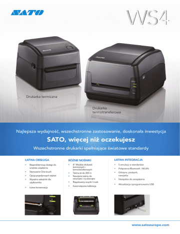 Drukarka termiczna Drukarka termotransferowa Najlepsza wydajność, wszechstronne zastosowanie, doskonała inwestycja SATO, więcej niż oczekujesz Wszechstronne drukarki spełniające światowe standardy ŁATWA OBSŁUGA RÓŻNE NOŚNIKI ŁATWA INTEGRACJA • Bezproblemowy dostęp do wnętrza urządzenia • 4” Modele drukarek termicznych i termotransferowych • Taśma aż do 300 m • Nawijanie taśmy do wewnątrz i na zewnątrz • Regulowany czujnik I-mark • 5 emulacji w standardzie • Sterowanie One-touch • Opcja pojedynczych etykiet • Wyraźne wskaźniki dla użytkownika • Łatwa konserwacja • Automatyczna kalibracja • Połączenia Bluetooth i WLAN • Gilotyna, podajnik, nawijarka • Narzędzia do zarządzania • Aktualizacja oprogramowania USB www.satoeurope.com INFORMACJE TECHNICZNE Seria drukarek WS4 CHARAKTERYSTYKA DRUKU WS408 WS412 Metoda drukowania Bezpośredni druk termiczny i druk termotransferowy Rozdzielczość drukowania, pkt./mm (dpi) 8 pkt./mm (203 dpi) 12 pkt./mm (300 dpi) Maks. Obszar drukowania Szerokość, mm (cal) 104 mm (4,09”) 104 mm (4,09”) Długość, mm (cal) 996 mm (39,33”) 996 mm (39,33”) Prędkość drukowania, mm/sek. (ips) maks. 152,4 mm/sek. (6 ips) maks. 102 mm/sek. (4 ips) CPU 32-bit 9260 RISC Pamięć drukarki Flash ROM: 16 MB, RAM: 32 MB Pamięć użytkownika: 3 MB Pamięć zewnętrzna USB: 16 GB Rodzaj czujnika Regulowany czujnik I-Mark (odblaskowy), czujnik odstępu między etykietami (transmisyjny), czujnik pobranej etykiety, czujnik otwarcia głowicy Rodzaj nośnika Etykiety na rolce lub sztancowane etykiety na papierze harmonijkowym, zwykły papier układany stroną przednią do góry, zapas ciągły i metki Grubość nośnika 0,06–0,19 mm (0,002”–0,007”) Kształt etykiety Średnica Maks. zewnętrzna średnica rolki: Ø 127 mm (5”); Średnica rdzenia: 25,4 mm/ 38 mm (1”/1,5”) Kierunek nawijania Rozmiar etykiety Papier ciągły Strona przednia do wewnątrz/ na zewnątrz Szerokość 22,4–115 mm 22,4–115 mm Długość 8–996 mm 8–996 mm Papier odrywany Szerokość 22,4–115 mm Długość Szerokość 22,4–115 mm 22,4–115 mm Długość DT: 35–993 mm TT: 19,4–993 mm Szerokość 22,4–115 mm 22,4–115 mm Długość DT: 35–150,4 mm TT: 23,4–150,4 mm Gilotyna Podajnik DT: 30 - 996 mm, TT: 8 - 996 mm 22,4–115 mm DT: 35–993 mm TT: 19,4–993 mm DT: 35–150,4 mm TT: 23,4–150,4 mm DT: 30 - 996 mm, TT: 8 - 996 mm Taśma barwiąca Długość Max 300 metrów. Wyrównanie do środka Szerokość 40 mm - 110 mm Średnica rdzenia 12,7 w przypadku taśmy 74/91/100 m; 25 mm w przypadku taśmy 300m Kierunek nawijania Do wewnątrz/ na zewnątrz CZCIONKI/ SYMBOLE Czcionki wewnętrzne Czcionki standardowe Czcionki bitmapowe XS, XU, XM, XB, XL, OCR A, OCR B, Obsługiwany Unicode Czcionki skalowalne CG Times, CG Triumvirate Kod kreskowy 1-wymiarowy UPC-A/E, JAN/EAN-8/13, Code 39, Code 93, Code 128, GS1-128 (UCC /EAN128), Codabar (NW–7), z przeplotem 2 z 5, kod kreskowy MSI, GS1 Databar: Omni, Truncated, Stacked, Stacked Omni, Limited, Expanded, Expanded stacked. UPC Add-on, Postnet, Industrial 2 z 5. Kompozytowe: JAN/EAN-8/13, UPC A/E, GS1 Databar, Truncated i Stacked. 2-wymiarowy kod kreskowy Obrót tekstu Znak Dane/ kod kreskowy PDF417 z Micro pdf, MAXI Code, QR Code, GS1 Data Matrix (ECC200) 0°, 90°, 180°, 270° INTERFEJSY KOMUNIKACYJNE Interfejsy Model LAN: USB + LAN, Model standardowy: USB + RS232C + LAN, Opcje: Bezprzewodowa sieć LAN b/g/n i Bluetooth Protokoły LAN: ARP, IP, ICMP, UDP, TCP, HTTP, DHCP, Socket, LPR, SNMPv2 Języki poleceń Język drukarki do kodów kreskowych SBPL SATO, SZPL, SEPL, SDPL, SIPL (emulacje języka drukarki) CHARAKTERYSTYKA DZIAŁANIA Zasilanie Napięcie wejściowe zasilacza: AC100 V–240 V (auto przełączanie)/ 60 W (szczyt) – Napięcie wejściowe drukarki: 19 V/ 3 A Warunki otoczenia Działanie 5–40ºC/ 25–85% wilgotności względnej (bez kondensacji) Przechowywanie -40–60ºC/ 10–90% wilgotności względnej (bez kondensacji) Wymiary Drukarka DT : 183,8 x 225,9 x 166 mm Drukarka TT: 220,6 x 278,5 x 287,5 mm Szerokość (szer. x dł. x wy.) Drukarka DT 1,74 kg Drukarka TT: 2,48 kg Wskaźniki 2 x 3 kolory LED POZOSTAŁE Atesty Zgodność z FCC, UL, CSA, CCC, CE, TUV GS, EAC, ROHS. Auto diagnostyka Wykrywanie błędów, ochrona przed przegrzaniem głowicy drukarki, kontrola komponentów głowicy drukarki Łatwa konserwacja Głowicę termiczną oraz rolki dociskowe można z łatwością wymienić OPCJE I STEROWANIE Akcesoria Podajnik, pełna gilotyna, bezprzewodowy LAN, interfejs Bluetooth, duża nawijarka rolki nośnika Sterowanie drukarką Narzędzia i ustawienia SATO dla drukarek, sieci i połączeń bezprzewodowych. SNMPv2. Aktualizacja oprogramowania USB. POMOC TECHNICZNA SATO Pełna oferta etykiet, metek i taśm firmy SATO. Pomoc posprzedażowa SATO Value Support www.satoeurope.com Firma SATO nie gwarantuje dostępności powyższych funkcji we wszystkich modelach. Specyfikacje techniczne mogą ulec zmianie bez wcześniejszego powiadomienia. Pomiary są wartościami przybliżonymi. DANE EKSPLOATACYJNE