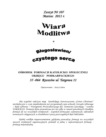 Zeszyt Nr 107 Marzec 2011 r. * OŚRODEK FORMACJI KATOLICKO SPOŁECZNEJ OKRĘGU PODKARPACKIEGO 35 -064 Rzeszów ul. Targowa 11 Opracowanie : Jerzy Łobos Aby wypełnić należycie misję Katolickiego Stowarzyszenia „Civitas Christiana” niezbędna jest o czym niejednokrotnie już przypominały nam uchwały Zarządu Głównego – Rady Głównej – Wystąpienia Przewodniczącego kol. Ziemowita Gawskiego - rzetelna FORMACJA. Formacja która prowadzona jest nie tylko w ramach powołanych Ośrodków formacji ale we wszystkich strukturach : zespołach formacyjno zadaniowych, oddziałach terenowych i okręgowych, w działalności i pracy poszczególnych Rad Oddziałów. Byłoby wielkim nieporozumieniem, gdybyśmy prowadząc formację we wszystkich naszych strukturach organizacyjnych, pominęli tę jedną z najważniejszych formację formację indywidualną. Posynodalna Adhortacja Apostolska Christifideles laici w art. 57 zawiera wezwanie do stałego wzrastania, dojrzewania i przynoszenia obfitszego owocu. Tego wezwania nie może on nie podjąć, nie może się uchylać od swojej osobistej odpowiedzialności. I właśnie do owej trudnej i wzniosłej odpowiedzialności nawiązują te porywające i budzące grozę słowa Jezusa: „Ten, kto we Mnie nie trwa, zostanie wyrzucony jak winna latorośl i uschnie. I zbiera się ją, i wrzuca do ognia, i płonie” (J 15, 6). W art. 58 podkreśla: „To mnie Bóg wzywa, mnie posyła do pracy w swojej winnicy; mnie wzywa i posyła, abym pracował dla przyjścia Jego Królestwa w dziejach. To osobiste powołanie i misja określa godność i odpowiedzialność każdego z katolików świeckich i stanowi środek ciężkości całego dzieła formacji. Warunkami, od których zależy odkrywanie konkretnej woli Pana odnoszącej się do naszego życia są: pełne gotowości i uważne wsłuchiwanie się w Słowo Boże i naukę Kościoła, synowska i wytrwała modlitwa, korzystanie z mądrego i troskliwego kierownictwa duchowego. Nie chodzi jednak tylko o to, byśmy wiedzieli, czego Bóg chce od każdego z nas w różnych sytuacjach życia. Trzeba jeszcze czynić to, czego Bóg chce. Przypominają nam o tym słowa Maryi, Matki Jezusa, „Zróbcie wszystko, cokolwiek Wam powie” Niech nam w realizacji tego zadania pomoże kilka refleksji nt wiary i modlitwy, abyśmy mogli sobie zasłużyć na słowa : „ Błogosławieni czystego serca, albowiem oni Boga oglądać będą”. Czystość serca, umysłu i ciała – jak mówi Katechizm Kościoła Katolickiego – „jest zadaniem długotrwałym. Nigdy nie należy uważać, że zdobyło się ją raz na zawsze. Zakłada ona wysiłek podejmowany we wszystkich okresach życia (por. Tt 2,1-6). Wymagany wysiłek powinien być bardziej intensywny w pewnych okresach – gdy kształtuje się osobowość, w dzieciństwie i w młodości” (KKK 2342). „Człowiek cnotliwy i czysty formuje się dzień po dniu, podejmując liczne i dobrowolne decyzje; dlatego poznaje, miłuje i czyni dobro moralne odpowiednio do etapów swojego rozwoju” (Jan Paweł II, adhortacja apostolska Familiaris consortio, 34). WPROWADZENIE W MISTERIUM WIARY Czy istnieje piękniejsza rzeczywistość i jednocześnie przyszłość dla człowieka niż komunia z Bogiem? Dla człowieka wierzącego z pewnością nie istnieje. Tymi słowami rozpoczyna o. Jerzy Gogola OCD swoją Teologię komunii z Bogiem w podręczniku o życiu duchowym. Musimy zdać sobie na wstępie sprawę z tego, że nie można mówić o życiu duchowym, jeśli ono samo nie jest pierwsze. Bo najpierw jest rzeczywistość, Bóg ze swoim Słowem Chrystusem, najpierw jest przyjaźń Boga z człowiekiem, a refleksja teologiczna powstaje jakby w drugiej kolejności. I dobrze, że jest, bo jest potrzebna, bo uczy prawideł życia, bo pozwala patrzeć w przyszłość oczami Boga. Zacząć trzeba od Miłości, odwiecznej miłości Boga do człowieka. To ona zaprasza do osobowych relacji i do odpowiadania miłością na miłość. To ona skłania, by o tej miłości rozmyślać. Tak więc teologia życia duchowego jako nauka kieruje człowieka ku życiu we wspólnocie z Bogiem, a to jest cel Objawienia. O. Gogola rozpatruje historię Boga z człowiekiem w kategorii przymierza. Kiedy sięgniemy do Pisma św. zobaczymy trzy momenty, w których Bóg zawiera przymierze z człowiekiem. Cóż to jest przymierze? W pierwotnym znaczeniu przymierze oznacza układ między osobami lub grupami. Składano ofiary i obie strony brały na siebie pewne zobowiązania, które posiadały moc przysięgi. W każdym przymierzu zawartym z człowiekiem, Bóg posługiwał się znakami zrozumiałymi dla niego, ale posiadającymi znaczenie dużo głębsze i odnoszące się do rzeczywistości nadprzyrodzonej. Przyjrzymy się teraz tym przełomowym momentom historii zbawienia naszej historii. Wpierw przymierze zawarte z Abrahamem. Abraham przygotował wszystko, tak, jak Bóg mu polecił: trzyletnią jałowicę, trzyletnią kozę i trzyletniego barana oraz synogarlicę i gołębicę, przerąbał je na połowy, a gdy nastał mrok obserwował, jak dym i ogień przesunęły się między tymi połowami zwierząt. To było zawarcie przymierza Boga z Abrahamem, ale przymierze jednostronne. Abraham wszystko przygotował, ale nie brał w tym zawarciu przymierza czynnego udziału nie przeszedł pomiędzy tymi połowami zwierząt. Ze swej strony dał jedynie wiarę. Tymczasem Bóg uczynił mu obietnicę licznego potomstwa i kraju na własność. Zawarcie tego przymierza przekonuje nas, że wspólnota z Bogiem, to dar nie nagroda. Bóg zobowiązuje się do wierności po wszystkie czasy i Boże słowo jest niezmienne. Uczynki Abrahama czy jego potomstwa nie zmienią tego. Inny charakter ma przymierze zawarte na Synaju. Po przeczytaniu tekstu opisującego zawarcie tego przymierza można mieć wrażenie, że Bóg uzależnił swoją wierność i wypełnienie obietnic od postępowania Izraelitów. Świadczy to o tym, że Bóg stopniowo wprowadz