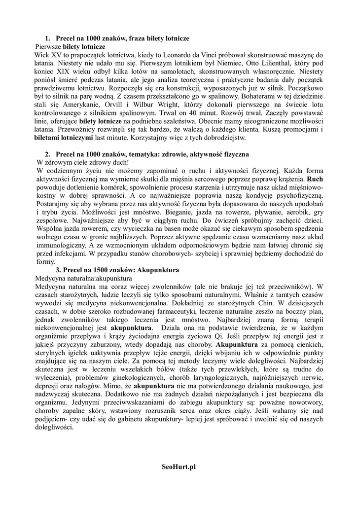 1. Precel na 1000 znaków, fraza bilety lotnicze Pierwsze bilety lotnicze Wiek XV to prapoczątek lotnictwa, kiedy to Leonardo da Vinci próbował skonstruować maszynę do latania. Niestety nie udało mu się. Pierwszym lotnikiem był Niemiec, Otto Lilienthal, który pod koniec XIX wieku odbył kilka lotów na samolotach, skonstruowanych własnoręcznie. Niestety poniósł śmierć podczas latania, ale jego analiza teoretyczna i praktyczne badania dały początek prawdziwemu lotnictwu. Rozpoczęła się era konstrukcji, wyposażonych już w silnik. Początkowo był to silnik na parę wodną. Z czasem przekształcono go w spalinowy. Bohaterami w tej dziedzinie stali się Amerykanie, Orvill i Wilbur Wright, którzy dokonali pierwszego na świecie lotu kontrolowanego z silnikiem spalinowym. Trwał on 40 minut. Rozwój trwał. Zaczęły powstawać linie, oferujące bilety lotnicze na podniebne szaleństwa. Obecnie mamy nieograniczone możliwości latania. Przewoźnicy rozwinęli się tak bardzo, że walczą o każdego klienta. Kuszą promocjami i biletami lotniczymi last minute. Korzystajmy więc z tych dobrodziejstw. 2. Precel na 1000 znaków, tematyka: zdrowie, aktywność fizyczna W zdrowym ciele zdrowy duch! W codziennym życiu nie możemy zapominać o ruchu i aktywności fizycznej. Każda forma aktywności fizycznej ma wymierne skutki dla mięśnia sercowego poprzez poprawę krążenia. Ruch powoduje dotlenienie komórek, spowolnienie procesu starzenia i utrzymuje nasz układ mięśniowokostny w dobrej sprawności. A co najważniejsze poprawia naszą kondycję psychofizyczną. Postarajmy się aby wybrana przez nas aktywność fizyczna była dopasowana do naszych upodobań i trybu życia. Możliwości jest mnóstwo. Bieganie, jazda na rowerze, pływanie, aerobik, gry zespołowe. Najważniejsze aby być w ciągłym ruchu. Do ćwiczeń spróbujmy zachęcić dzieci. Wspólna jazda rowerem, czy wycieczka na basen może okazać się ciekawym sposobem spędzenia wolnego czasu w gronie najbliższych. Poprzez aktywne spędzanie czasu wzmacniamy nasz układ immunologiczny. A ze wzmocnionym układem odpornościowym będzie nam łatwiej chronić się przed infekcjami. W przypadku stanów chorobowych- szybciej i sprawniej będziemy dochodzić do formy. 3. Precel na 1500 znaków: Akupunktura Medycyna naturalna:akupunktura Medycyna naturalna ma coraz więcej zwolenników (ale nie brakuje jej też przeciwników). W czasach starożytnych, ludzie leczyli się tylko sposobami naturalnymi. Właśnie z tamtych czasów wywodzi się medycyna niekonwencjonalna. Dokładniej ze starożytnych Chin. W dzisiejszych czasach, w dobie szeroko rozbudowanej farmaceutyki, leczenie naturalne zeszło na boczny plan, jednak zwolenników takiego leczenia jest mnóstwo. Najbardziej znaną formą terapii niekonwencjonalnej jest akupunktura. Działa ona na podstawie twierdzenia, że w każdym organiźmie przepływa i krąży życiodajna energia życiowa Qi. Jeśli przepływ tej energii jest z jakiejś przyczyny zaburzony, wtedy dopadają nas choroby. Akupunktura za pomocą cienkich, sterylnych igiełek uaktywnia przepływ tejże energii, dzięki wbijaniu ich w odpowiednie punkty znajdujące się na naszym ciele. Za pomocą tej metody leczymy wiele dolegliwości. Najbardziej skuteczna jest w leczeniu wszelakich bólów (także tych przewlekłych, które są trudne do wyleczenia), problemów ginekologicznych, chorób laryngologicznych, najróżniejszych nerwic, depresji oraz nałogów. Mimo, że akupunktura nie ma potwierdzonego działania naukowego, jest nadzwyczaj skuteczna. Dodatkowo nie ma żadnych działań niepożądanych i jest bezpieczna dla organizmu. Jedynymi przeciwwskazaniami do zabiegu akupunktury są: poważne nowotwory, choroby zapalne skóry, wstawiony rozrusznik serca oraz okres ciąży. Jeśli wahamy się nad podjęciem- czy udać się do gabinetu akupunktury- lepiej jest spróbować i uwolnić się od naszych dolegliwości. SeoHurt.pl