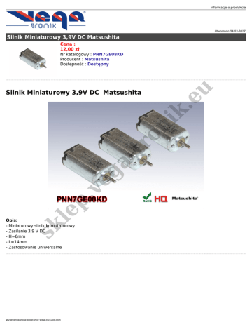 Informacje o produkcie Utworzono 04-03-2017 Silnik Miniaturowy 3,9V DC Matsushita Cena : 12,00 zł sk le p. ve g atr on i k. Silnik Miniaturowy 3,9V DC Matsushita eu Nr katalogowy : PNN7GE08KD Producent : Matsushita Dostępność : Dostępny Opis: - Miniaturowy silnik komutatorowy - Zasilanie 3,9 V DC - H=6mm - L=14mm - Zastosowanie uniwersalne Wygenerowano w programie www.oscGold.com