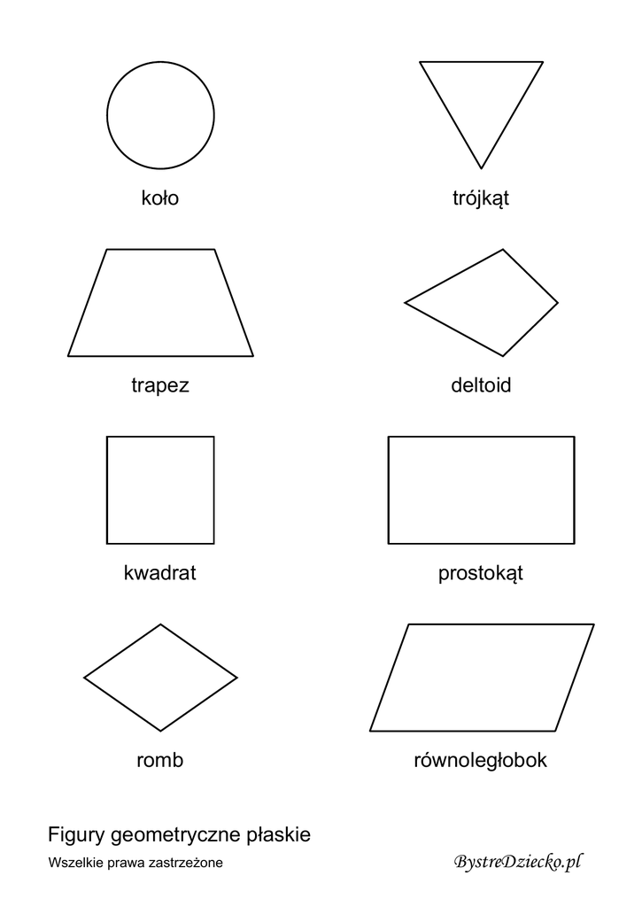 koło trójkąt trapez deltoid kwadrat prostokąt romb równoległobok Figury geometryczne płaskie Wszelkie prawa zastrzeżone BystreDziecko.pl