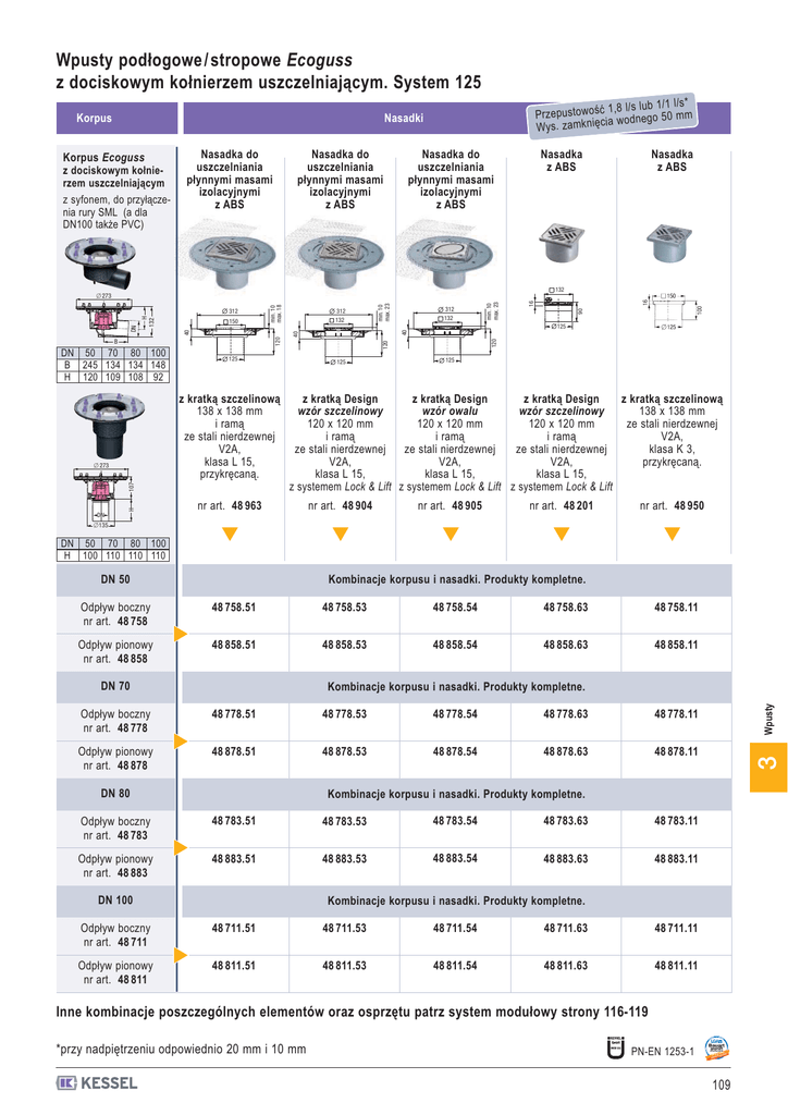 Wpusty podłogowe / stropowe Ecoguss z dociskowym kołnierzem uszczelniającym. System 125 Korpus * 1,8 l/s lub 1/1 l/s Przepustowość wodnego 50 mm cia ię Wys. zamkn Nasadki Korpus Ecoguss z dociskowym kołnierzem uszczelniającym z syfonem, do przyłączenia rury SML (a dla DN100 także PVC) Nasadka do uszczelniania płynnymi masami izolacyjnymi z ABS Nasadka do uszczelniania płynnymi masami izolacyjnymi z ABS Nasadka z ABS Nasadka do uszczelniania płynnymi masami izolacyjnymi z ABS 132 DN 50 70 80 100 B 245 134 134 148 H 120 109 108 92 125 z kratką szczelinową 138 x 138 mm i ramą ze stali nierdzewnej V2A, klasa L 15, przykręcaną. H 107 쏗 273 125 90 16 min. 10 max. 23 min. 10 max. 23 40 125 120 B 312 132 312 132 120 120 40 150 40 H 132 DN 312 min. 10 max. 18 쏗 273 DN Nasadka z ABS 125 z kratką Design z kratką Design z kratką szczelinową z kratką Design wzór szczelinowy wzór owalu 138 x 138 mm wzór szczelinowy 120 x 120 mm 120 x 120 mm ze stali nierdzewnej 120 x 120 mm i ramą i ramą V2A, i ramą ze stali nierdzewnej ze stali nierdzewnej klasa K 3, ze stali nierdzewnej V2A, V2A, przykręcaną. V2A, klasa L 15, klasa L 15, klasa L 15, z systemem Lock & Lift z systemem Lock & Lift z systemem Lock & Lift nr art. 48 963 nr art. 48 904 nr art. 48 905 nr art. 48 201 nr art. 48 950 쏗135 DN 50 70 80 100 H 100 110 110 110 Kombinacje korpusu i nasadki. Produkty kompletne. DN 50 Odpływ boczny nr art. 48 758 48 758.51 48 758.53 48 758.54 48 758.63 48 758.11 Odpływ pionowy nr art. 48 858 48 858.51 48 858.53 48 858.54 48 858.63 48 858.11 DN 70 48 778.51 48 778.53 48 778.54 48 778.63 48 778.11 Odpływ pionowy nr art. 48 878 48 878.51 48 878.53 48 878.54 48 878.63 48 878.11 DN 80 3 Odpływ boczny nr art. 48 778 Wpusty Kombinacje korpusu i nasadki. Produkty kompletne. Kombinacje korpusu i nasadki. Produkty kompletne. Odpływ boczny nr art. 48 783 48 783.51 48 783.53 48 783.54 48 783.63 48 783.11 Odpływ pionowy nr art. 48 883 48 883.51 48 883.53 48 883.54 48 883.63 48 883.11 DN 100 Kombinacje korpusu i nasadki. Produkty kompletne. Odpływ boczny nr art. 48 711 48 711.51 48 711.53 48 711.54 48 711.63 48 711.11 Odpływ pionowy nr art. 48 811 48 811.51 48 811.53 48 811.54 48 811.63 48 811.11 Inne kombinacje poszczególnych elementów oraz osprzętu patrz system modułowy strony 116-119 LGA Landesgewerbeamt Bayern *przy nadpiętrzeniu odpowiednio 20 mm i 10 mm PN-EN 1253-1 Bauart gepr ft geprüft und überwacht berwacht t herhei t mit Sice Qualitä geprüft 109