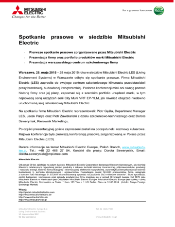 Spotkanie prasowe w siedzibie Mitsubishi Electric - Pierwsze spotkanie prasowe zorganizowane przez Mitsubishi Electric - Prezentacja firmy oraz portfolio produktów marki Mitsubishi Electric - Prezentacja warszawskiego centrum szkoleniowego firmy Warszawa, 28. maja 2015 – 28 maja 2015 roku w siedzibie Mitsubishi Electric LES (Living Environment Systems) w Warszawie odbyło się spotkanie prasowe. Firma Mitsubishi Electric (LES) zaprosiła do swojego centrum szkoleniowego kilkunastu przedstawicieli prasy branżowej, budowlanej i wnętrzarskiej. Podczas konferencji mieli oni okazję poznać historię firmy oraz jej plany, zapoznać się z szerokim portfolio urządzeń marki, w tym najnowszą serią urządzeń serii City Multi VRF EP-YLM, jak również obejrzeć niedawno uruchomioną salę szkoleniową Mitsubishi Electric. Na spotkaniu firmę Mitsubishi Electric reprezentowali: Piotr Gęśla, Department Manager LES, Jacek Parys oraz Piotr Zawiślański z działu szkoleniowo-technicznego oraz Dorota Seweryniak, Kierownik Marketingu. Po części prezentacyjnej goście zaproszeni zostali na poczęstunek i rozmowy kuluarowe. Majowa konferencja była pierwszą konferencją prasową zorganizowaną w Polsce przez Mitsubishi Electric (LES). Dalsze informacje na temat Mitsubishi Electric Europe, Polish Branch, www.mitsubishiles.pl, Tel.: +48 22 468 27 54, Kontakt dla prasy: Dorota Seweryniak, Email: [email protected] Mitsubishi Electric Od ponad 90 lat, działając na całym świecie, Mitsubishi Electric Corporation dostarcza Klientom biznesowym, jak również Klientom ostatecznym najwyższej jakości produkty z zakresu techniki lotniczej i kosmicznej, półprzewodników, produkcji i rozdziału energii, techniki komunikacyjnej i informacyjnej, elektroniki rozrywkowej, automatyki przemysłowej oraz techniki budowlanej, tj. technika klimatyzacyjna i ogrzewnictwo. Posiadająca ponad 124.000 pracowników, firma, osiągnęła z końcem roku fiskalnego 31.03.2014 skonsolidowaną sprzedaż na poziomie 39,3 miliardów dolarów*. Biura sprzedaży, centra badawcze i rozwojowe oraz zakłady produkcyjne firmy znajdują się w ponad 30 krajach świata. Od 1978 roku Mitsubishi Electric w Niemczech jest Oddziałem Mitsubishi Electric Europe. Mitsubishi Electric Europe jest spółką - córką Mitsubishi Electric Corporation w Tokio. * Kurs 103 Yen = 1 US Dollar, Stan na 31.03.2014 (źródło: Tokyo Foreign Exchange Market) Więcej: http://global.mitsubishielectric.com http://www.mitsubishielectric.de http://www.mitsubishi-les.de http://www.mitsubishi-les.pl Mitsubishi Electric Europe B.V. Living Environment Systems Ul. Łopuszańska 38 C 02-232 Warszawa Tel. 22 468 27 00 www.mitsubishi-les.pl Kontakt Dorota Seweryniak [email protected] Kierownik Marketingu Mitsubishi Electric Europe B.V., Polish Branch, Ul. Łopuszańska 38C 02-232 Warszawa 28 maja 2015 roku w siedzibie Mitsubishi Electric LES (Living Environment Systems) w Warszawie odbyło się spotkanie prasowe. Z przybyłymi gośćmi spotkał się m.in. Piotr Gęśla, Department Manager LES. Foto: Mitsubishi Electric Data: 28.05.2015 Mitsubishi Electric Europe B.V. Living Environment Systems Ul. Łopuszańska 38 C 02-232 Warszawa Tel. 22 468 27 00 www.mitsubishi-les.pl