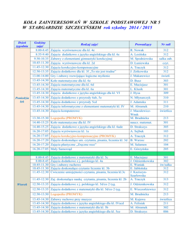 KOŁA ZAINTERESOWAŃ W SZKOLE PODSTAWOWEJ NR 5 W STARGARDZIE SZCZECIŃSKIM rok szkolny 2014 / 2015 Dzień tygodnia Poniedzia łek Wtorek Godziny zajęć 8.00-8.45 8.55-9.40 9.50-10.35 10.45-11.30 11.45-12.30 12.50-13.35 13.00-14.00 13.45-14.30 13.45-14.30 13.45-14.30 13.45-14.30 13.45-14.30 13.45-14.30 13.45-14.30 13.45-14.30 Rodzaj zajęć Prowadzący Nr sali Zajęcia wyrównawcze dla kl. 4e Zajęcia dodatkowe z języka angielskiego dla kl. 6c Zabawy z elementami gimnastyki korekcyjnej Zajęcia wyrównawcze dla kl. 2d Zajęcia korekcyjno-kompensacyjne Zajęcia dodatkowe dla kl. 3f „To nie jest trudne” Gry i zabawy rozwijające logiczne myślenie R. Nowak A. Lesińska M. Spodniewska D. Łuniewska A. Traczyk J. Zetkowska J. Makarewicz 312 312 salka zab. czyt. 312 312 świetl. Koło matematyczne dla kl. 6e Zajęcia matematyczne dla kl. 6d Zajęcia matematyczne dla kl. 6a Zajęcia dodatkowe z języka angielskiego dla kl. VI Zajęcia dodatkowe z przyrody 6ab, 5e Zajęcia dodatkowe z przyrody 5cd Zajęcia informatyczne z elementami matematyki kl. IV Zajęcia komputerowe 303 301 301 309 310 311 210 świetlica 13.30-15.30 14.40-15.25 14.40-15.25 16.20-17.05 16.20-17.05 16.20-17.20 16.20-17.20 16.20-17.05 Logopedia (PROMYK) Koło matematyczne dla kl. IV Zajęcia dodatkowe z języka angielskiego dla kl. 6ade Zajęcia wyrównawcze kl. 1a D. Busz E. Maciejasz L. Klusik J. Hysa N. Młynarczyk J. Adamska M. Abramek J. MaculewiczWnuk M. Brudnicka naucz. matemat. D. Strakszys A. Sejbuk Zajęcia korekcyjno-kompensacyjne (PROMYK) Zajęcia doskonalące um. czytania, pisania, liczenia kl. 3d Zajęcia plastyczne „Zręczne rece” Mały Samorząd A. Traczyk B. Warzec M. Salamon E. Górzyńska 8.00-8.45 8.00-8.45 10.45-11.30 10.45-11.30 11.45-12.30 Zajęcia dodatkowe z matematyki dla kl. 5c Zajęcia dodatkowe z j. polskiego kl. 4a Gry i zabawy ruchowe Zajęcia doskonalące czytanie liczenie kl. 3b Ćwiczenie umiejętności czytania, pisania, liczenia kl.3c 301 302 św/salka 312 312 11.45-12.30 Zaj. doskonalące naukę czytania, pisania, liczenia kl. 2b E. Maciejasz J. Odziemkowska E. Waniak E. Jabłońska J. KaziszynSzarłowska A. Traczyk 12.50-13.35 Zajęcia dodatkowe z j. polskiego kl. 5d/co 2 tyg. J. Odziemkowska 312 12.50-13.35 Zajęcia dodatkowe z matematyki dla kl. 5d/co 2 tyg. E. Wieczorkiewicz 312 12.50-13.50 Logopedia (PROMYK) M. Brudnicka 213 13.45-14.30 13.45-14.30 13.45-14.30 13.45-14.30 M. Kujawa A. Felisiak M. Abramek D. Strakszys świetlica 211 302 006 Zabawy ruchowe przy muzyce Zajęcia dodatkowe z języka angielskiego dla kl. IVacd Zajęcia dodatkowe z matematyki dla kl. 5b Zajęcia dodatkowe z języka angielskiego dla kl. 5ce 213 301 305 103 312 202 104 205 313 13.45-14.30 Zajęcia dodatkowe z historii 14.00-15.00 Gry i zabawy rozwijające sprawności komunikacyjne Środa Czwartek 14.30-16.30 14.40-15.25 15.00-16.00 16.00-17.30 16.20-17.05 Zajęcia rozwijające kompetencje społeczne (PROMYK) Zajęcia dodatkowe z matematyki dla kl. 6b Zajęcia plastyczno-techniczne Koszykówka chłopców Zajęcia korekcyjno-kompensacyjne kl. III i IV 8.00-8.45 8.00-8.45 8.00-8.45 9.00-11.00 9.50-10.35 11.30-12.30 11.45-12.30 11.45-12.30 12.50-13.35 13.00-14.00 13.45-14.30 13.45-14.30 13.45-14.30 13.45-14.30 13.45-14.30 13.45-14.30 13.45-14.30 13.45-14.30 Zajęcia dodatkowe z matematyki dla kl. 5f Zajęcia wyrównawcze z j. angielskiego kl. 5a Zajęcia dodatkowe z kl. 5c Zajęcia socjoterapeutyczne Zajęcia rozwijające logiczne myślenie Gry i zabawy dydaktyczne Zajęcia wyrównawcze kl. 2d Gry logiczne, rebusy kl. 2c „Bezpiecznie i zdrowo” – kl. 3f Zajęcia plastyczno-techniczne Zajęcia dodatkowe z przyrody kl. 4d, 5a, 6c, 6d Zajęcia dodatkowe z j. polskiego kl. 6b Zaj. doskonalące naukę czytania, pisania, liczenia kl. 1a Zajęcia dodatkowe z matematyki dla kl. 6c Zajęcia dodatkowe z j. polskiego kl. 6c Zajęcia dodatkowe z j. polskiego kl. 6d Zajęcia wyrównawcze z j. angielskiego kl. 5a Zajęcia muzyczne 14.00-15.00 14.00-16.00 14.40-15.25 14.40-16.10 Gry i zabawy ruchowe przy muzyce Piłka nożna (PROMYK) Zabawy ruchowe przy muzyce Koło plastyczne J. Adamska M. HospodiukKucio K. Purwińska L. Klusik M. Szwed W. Stankiewicz J. KaziszynSzarłowska 306 świetl. gab ped. 301 świetl. sala gimn. 203 D. Busz 304 M. Harchala 308 E. Kułaga 312 E. Kratiuk gab. ped. I. Waldon świetl. J. Makarewicz świetl. D. Łuniewska Czyt. D. Gromek 312 J. Zetkowska 203 M. Szwed świetl. N. Młynarczyk 310 U. Kościk 305 E. Zięba 313 E. Wieczorkiewicz 302 J. Odziemkowska 306 M. Dereń 304 A. Lesińska 309 E. Ziomko308 Jurkowska N. Łyko świetl. W. Owczarek sala gimn. M. Kujawa świetl. L. Owczarek 211 16.20-17.05Zajęcia wyrównawcze kl. 1i E. Górzyńska 16.20-17.05 Zajęcia korekcyjno-kompensacyjne (PROMYK) A. Traczyk 16.20-17.05 „Od grosika do złotówki”, „Ratujemy i uczymy ratować” B. Warzec kl. 3d 205 206 202 Zajęcia dodatkowe z matematyki kl. 6e Koło matematyczne kl. 6d Czytanie bajek Gry i zabawy ruchowe Zajęcia rozwijające zainteresowania biblijne Zajęcia rozwijające um. czytania, pisania, liczenia kl.2c Zajęcia rozwijające myślenie matematyczne kl. 2b Zajęcia dodatkowe kl. Id 308 301 świetl. św/salka 312 312 gab. ped. 105 8.00-8.45 8.00-8.45 10.45-11.30 10.45-11.30 10.45-11.30 11.45-12.30 11.45-12.30 11.45-12.30 D. Busz E. Maciejasz A. Pawlak E. Waniak K. Piotrowska D. Gromek A. Traczyk E. Baryłka 12.40-13.25 Zajęcia taneczne 12.50-13.35 Zajęcia dodatkowe kl. 2e 13.00-14.00 Gry i zabawy rozwijające sprawności komunikacyjne 13.45-14.30 13.45-14.30 13.45-14.30 13.45-14.30 13.45-14.45 14.30-15.30 14.40-15.25 14.40-15.25 14.40-16.10 14.40-16.10 16.00-18.00 16.20-17.05 16.20-17.05 16.20-17.05 8.00-8.45 8.00-8.45 8.00-8.45 9.50-10.35 11.45-12.30 11.45-12.30 11.45-12.30 11.45-12.45 Piątek Koło matematyczne kl. V Zajęcia wyrównawcze z j. angielskiego kl. 5b Zajęcia dodatkowe z j. polskiego kl. 5a Zajęcia dodatkowe z matematyki kl. 4cd Socjoterapia (PROMYK) Gry i zabawy ru
