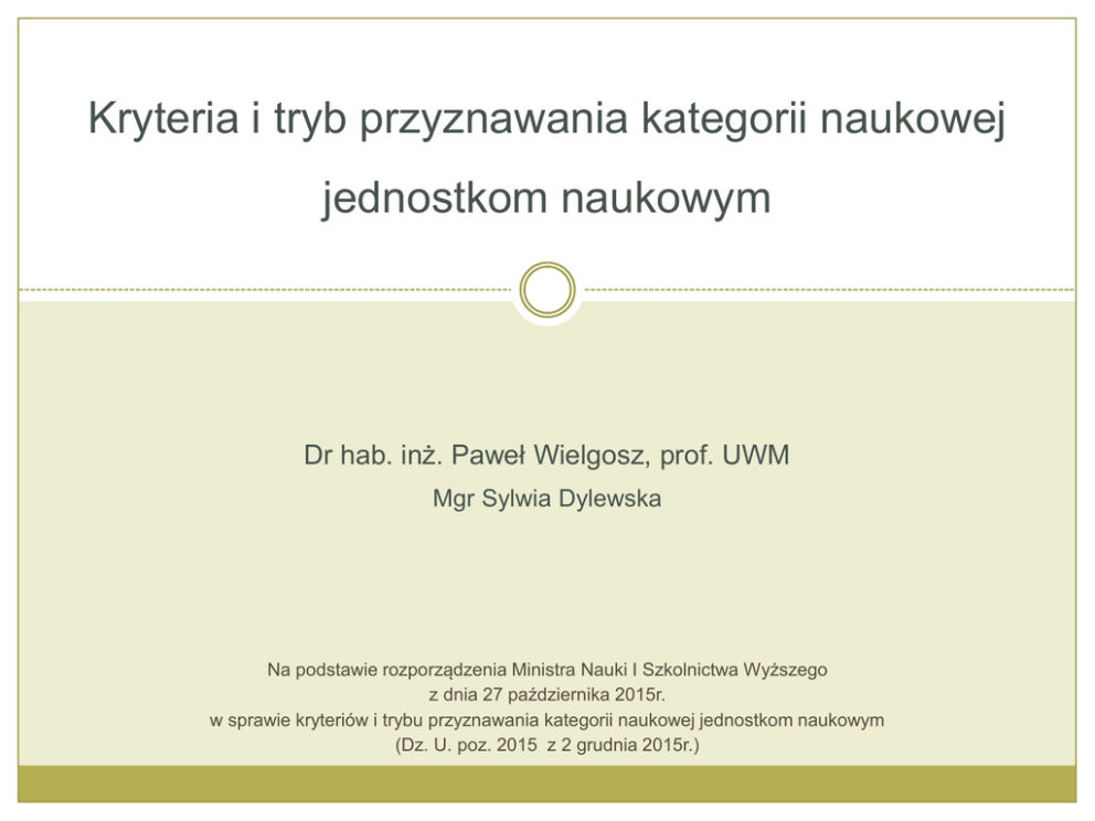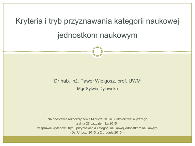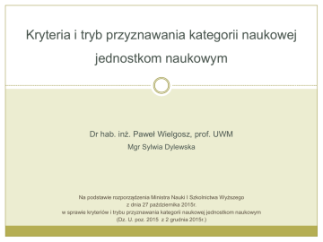 Kryteria i tryb przyznawania kategorii naukowej jednostkom naukowym Dr hab. inż. Paweł Wielgosz, prof. UWM Mgr Sylwia Dylewska Na podstawie rozporządzenia Ministra Nauki I Szkolnictwa Wyższego z dnia 27 października 2015r. w sprawie kryteriów i trybu przyznawania kategorii naukowej jednostkom naukowym (Dz. U. poz. 2015 z 2 grudnia 2015r.) Kryteria oceny Oceny dokonuje się w grupach nauk: humanistycznych i społecznych – obszar nauk humanistycznych i obszar nauk społecznych; ścisłych i inżynierskich – obszar nauk ścisłych i obszar nauk technicznych oraz dyscyplina artystyczna sztuki projektowe; o życiu – obszar nauk przyrodniczych, obszar nauk rolniczych, leśnych i weterynaryjnych, obszar nauk medycznych i nauk o zdrowiu oraz nauk o kulturze fizycznej; o sztuce i twórczości artystycznej – obszar sztuki oraz dyscyplinę naukową nauki o sztuce. Kryteria oceny 1. Osiągnięcia naukowe i twórcze 65% 2. Potencjał naukowy 10% 3. Praktyczne efekty działalności naukowej 15% 4. Pozostałe efekty działalności naukowej 10% 1. Osiągnięcia naukowe i twórcze 1. Osiągnięcia naukowe i twórcze 1.1 Publikacje w czasopismach naukowych Nazwa parametru Liczba punktów Publikacja w czasopismach naukowych (część A wykazu) 15 pkt – 40 pkt Publikacja w czasopismach naukowych (część B wykazu) 1 pkt – 15 pkt Publikacja w recenzowanych materiałach z konferencji międzynarodowych uwzględnionych w uznanej bazie publikacji o zasięgu międzynarodowym (Web of Science/SCOPUS/inna??) 15 pkt Recenzowane publikacje w języku innym niż polski o objętości co najmniej 0,5 arkusza wydawniczego, zamieszczone w zagranicznym czasopiśmie naukowym niewymienionym w części A lub B wykazu. 5 pkt 1. Osiągnięcia naukowe i twórcze 1.1 Publikacje w czasopismach naukowych - uwagi 1. Przez publikację rozumie się recenzowany artykuł naukowy zamieszczony w czasopiśmie naukowym, prezentującym wyniki badań naukowych lub prac rozwojowych o charakterze empirycznym, teoretycznym, technicznym lub analitycznym, przedstawiający metodykę badań naukowych lub prac rozwojowych, przebieg procesu badawczego i jego wyniki, wnioski – z podaniem cytowanej literatury (bibliografię). Do artykułów naukowych zalicza się także opublikowane w czasopismach naukowych recenzowane opracowania o charakterze monograficznym, polemicznym lub przeglądowym oraz glosy lub komentarze prawnicze. 2. Do osiągnięć naukowych i twórczych jednostki zalicza się również publikacje w suplementach lub zeszytach specjalnych czasopism naukowych pod warunkiem, że stanowią kolejne numery czasopisma naukowego umieszczonego w części A lub B wykazu. 3. W przypadku publikacji wieloośrodkowej jednostka naukowa otrzymuje punkty przewidziane dla danej publikacji w zależności od liczby autorów : 1) 2) Do 10 autorów - 100% punktów Powyżej 10 autorów: 100% punktów – gdy co najmniej 20% autorów jest pracownikami jednostki, 75% punktów – gdy co najmniej 10% autorów jest pracownikami jednostki, 50% punktów – gdy mniej niż 10% autorów jest pracownikami jednostki. 1. Osiągnięcia naukowe i twórcze 1.2 Monografie naukowe Nazwa parametru Liczba punktów Monografia naukowa – gdy całkowita liczba autorów monografii naukowej nie przekracza trzech a w jednostce naukowej jest zatrudniony co najmniej jeden autor. 25 pkt / 50 pkt* Monografia naukowa wieloautorska, w której autorstwo poszczególnych rozdziałów jest oznaczone, bez wskazania redaktora naukowego, a liczba autorów monografii naukowej wynosi 4 lub więcej i wszyscy oni są zatrudnieni w ocenianej jednostce naukowej. 15 pkt / 30 pkt* Redakcja naukowa monografii naukowej wieloautorskiej, w której autorstwo poszczególnych rozdziałów jest oznaczone, a liczba autorów monografii naukowej wynosi 4 lub więcej. 5 pkt / 10 pkt* Monografia naukowa wieloautorska w której autorstwo poszczególnych rozdziałów jest oznaczone, a liczba autorów monografii naukowej wynosi 4 lub więcej i łączna objętość rozdziałów autorstwa osób zatrudnionych w jednostce (w której zatrudniony jest redaktor naukowy tomu) obejmuje minimum 6 arkuszy. 15 pkt / 30 pkt* *Monografia wybitna – monografia naukowa, która w okresie objętym oceną uzyskała prestiżową nagrodę: Prezesa Rady Ministrów, ministra, właściwego Wydziału Polskiej Akademii Nauk, Komitetu Naukowego PAN, Fundacji na Rzecz Nauki Polskiej, zagranicznego towarzystwa naukowego, organizacji międzynarodowej lub ogólnopolskiego towarzystwa naukowego o szczególnym prestiżu. 1. Osiągnięcia naukowe i twórcze 1.2 Monografie naukowe - definicje 1. 2. 3. 4. 5. 6. 7. Monografie naukowe, zalicza się do osiągnięć naukowych i twórczych jednostki naukowej, jeżeli spełniają łącznie następujące warunki: Stanowią spójne tematycznie opracowania naukowe. Przedstawiają określone zagadnienia w sposób oryginalny i twórczy. Poddane były procedurze recenzji wydawniczych. Są opatrzone właściwym aparatem naukowym (bibliografia, przypisy), z wyłączeniem map. Posiadają objętość co najmniej 6 arkuszy wydawniczych lub są mapami odpowiadającymi tej objętości tekstu. Są opublikowane jako książki lub odrębne tomy ( z wyłączeniem map), których egzemplarze obowiązkowe zostały przekazane uprawnionym bibliotekom lub są opublikowane w formie elektronicznej w Internecie. Posiadają nadany numer ISBN lub ISMN lub identyfikator DOI (cyfrowy identyfikator dokumentu elektronicznego). Do monografii można zaliczyć skrypty akademickie i podręczniki akademickie, pod warunkiem że spełniają wszystkie warunki monografii naukowej. Do osiągnięć naukowych i twórczych jednostki naukowej zalicza się rozdział w monografii naukowej stanowiący opracowanie naukowe o objętości co najmniej pół arkusza wydawniczego lub odrębne mapy. 1. Osiągnięcia naukowe i twórcze 1.2 Monografie naukowe – sposoby liczenia punktów Monografia naukowa – gdy liczba autorów monografii wynosi cz