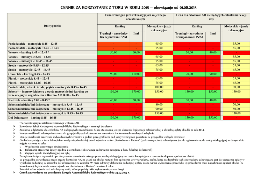CENNIK ZA KORZYSTANIE Z TORU W ROKU 2015 – obowiązuje