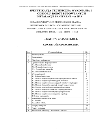 SPECYFIKACJA TECHNICZNA – INST. WENTYLACJI MECHANICZNEJ - PRZEBUDOWA ZAPLECZA SOCJALNEGO –SPNR5- GORLICE SPECYFIKACJA TECHNICZNA WYKONANIA I ODBIORU ROBÓT BUDOWLANYCH INSTALACJE SANITARNE –cz II/ 3 INSTALCJE WENTYLACJI MECHANICZNEJ DLA DLA PRZEBUDOWY ZAPLECZA SOCJALNEGO PRZY SALI GIMNSTYCZNEJ BUDYNKU SZKOŁY PODSTAWOWEJ NR 5 W GORLICACH DZ.NR. 1165/2 , 1166/2 i 1184/1 – kod CPV nr.45.33.12.10-1. ZAWARTOŚĆ OPRACOWANIA PIO L.p. 1 2 3 4 5 6 7 8 Wyszczególnienie Nr. strony 1 2 Określenia podstawowe Ogólne warunki dotyczące robót 3.1. Materiały i elementy 3.2. Zestawienie robocizny 3.3. Zestawienie materiału 3.4 Zestawienie sprzętu Wykonanie robót 4.1 .Roboty budowlane 4.2. Montaż urządzeń wprowadzających powietrze w ruch 4.3. Montaż urządzeń prowadzących powietrze 4.4. Montaż urządzeń zakańczających układy wentylacyjne 4.5. Montaż elementów regulacji przepływu powietrza 4.6. Montaż urządzeń oczyszczających powietrze 4.7. Montaż urządzeń do odróbki cieplnej powietrza 4.8. Montaż urządzeń klimatyzujących powietrze 4.9. Montaż urządzeń automatycznej regulacji 4.10.Inne wymagania Kontrola jakości i odbiór robót 5.1.Badania 5.2.Odbiór robót . 2 Strona tytułowa Dane zadania Przepisy związane Normy związane Zestawienie robocizny , materiałów i sprzętu 1 5 5 8 8 8 8 8 9 10 12 13 13 15 15 16 17 18 18 19 20 21 22 SPECYFIKACJA TECHNICZNA – INST. WENTYLACJI MECHANICZNEJ - PRZEBUDOWA ZAPLECZA SOCJALNEGO –SPNR5- GORLICE 1.0.Dane zadania . W Miejskim Zespole Szkół Nr 5 w Gorlicach projektuje się przebudowę zaplecza sali gimnastycznej oraz przystosowanie części budynku do korzystania przez osoby niepełnosprawne z budynku szkoły podstawowej W części przebudowywanego zaplecza sali znajdują się obecnie: szatnia dla chłopców, szatnia dla dziewcząt , nieużywane ,( z częściowo zdemontowanymi przyborami ) pomieszczenia z natryskami dla chłopców i dziewcząt oraz dwie toalety. Przedmiotem niniejszego opracowania jest specyfikacja instalacji wentylacji mechanicznej w przebudowywanych pomieszczeniach . Wentylacja mechaniczna nawiewna w pomieszczeniach szatni realizowana będzie poprzez aparaty grzewczo-wentylacyjne Neolux natomiast wentylacja wywiewna realizowana będzie poprzez wentylatory osiowe EBB 250 montowane w miejsce kratek wentylacyjnych. Wentylacja mechaniczna nawiewna w pomieszczeniach umywalni realizowana będzie pośrednio poprzez aparaty grzewczo-wentylacyjne Neolux usytuowane w szatni a bezpośrednio poprzez kratki kontaktowe 25 x 15 cm usytuowane w ścianie działowej pomiędzy pomieszczeniem szatni i umywalni ,natomiast wentylacja wywiewna realizowana będzie poprzez wentylatory osiowe EBB 250 montowane w miejsce kratek wentylacyjnych. Dla pozostałych pomieszczeń przewidziano montaż wentylatorów osiowych EDM 160 V = 120 m 3 / h montowanych w miejsce kratek wentylacyjnych . 2.0.Qkreślenia podstawowe Amortyzator – element zmniejszający przenoszenie drgań na usytuuj budowlany Anemostat – nasada zakończająca urządzenie wentylacyjne nawiewne , przeznaczona do przestrzennego i kierunkowego rozpraszania strumienia powietrza nawiewnego do pomieszczenia Chłodnica – przeponowy wymiennik ciepła do chłodzenia Czerpnia wentylacyjna – element , przez który zasysane jest powietrze zewnętrzne Dyfuzor – kształtka wentylacyjna , której przekrój poprzeczny ulega ciągłemu zwiększaniu w kierunku przepływu powietrza Dysza nawiewna – nieuzbrojone zakończenie przewodu wentylacyjnego zmieniające dynamikę strumienia nawiewanego powietrza Ejektor – element wprowadzający powietrze wentylacyjne w ruch , strumieniem powietrza pierwotnego o dużej energii kinetycznej Filtr – element oczyszczający powietrze na zasadzie zatrzymywania pyłu w warstwie materiału filtrującego , przez który przepływa oczyszczane powietrze Infiltracja – samoczynna wymiana powietrza przez nieszczelności w drzwiach i oknach oraz przez pory w przegrodach budowlanych Klimakonwektor – element do nawiewania powietrza do pomieszczenia klimatyzowanego umieszczony bezpośrednio w pomieszczeniu , z ejekcją powodującą mieszanie powietrza doprowadzonego z komory klimatyzacyjnej z powietrzem obiegowym , wyposażony w wymiennik ciepła do ogrzewania lub chłodzenia powietrza Klimatyzator – zespół elementów do klimatyzowania pomieszczenia , umieszczony we wspólnej obudowie 2 SPECYFIKACJA TECHNICZNA – INST. WENTYLACJI MECHANICZNEJ - PRZEBUDOWA ZAPLECZA SOCJALNEGO –SPNR5- GORLICE Klimatyzacja – wentylacja mechaniczna , zapewniająca utrzymanie w pomieszczeniu określonej temperatury i wilgotności powietrza , niezależnie od zewnętrznych warunków klimatycznych oraz zmiennych zysków ciepła i wilgotności w pomieszczeniu . Klimatyzacja jest to proces nadawania powietrzu określonych parametrów wymaganych warunkami przebywania w pomieszczeniu ludzi lub procesem technologicznym. Kolano- kształtka wentylacyjna , której oś jest łukiem o promieniu równym lub mniejszym od średnicy lub szerokości przewodu wentylacyjnego Komora osadowa – odpylacz , w którym następuje wytracanie pyłu z powietrza przez zmniejszenie prędkości i zmianę kierunku strumienia przepływającego powietrza Komora zraszania – element do nawilżania , osuszania i ogrzewania lub chłodzenia powietrza przez bezpośredni kontakt powietrza z wodą o stałej lub zmiennej temperaturze Konfuzor- kształtka wentylacyjna w której przekrój poprzeczny ulega ciągłemu zmniejszaniu w kierunku przepływu powietrza Kratka wentylacyjna – element zakończający urządzenie wentylacyjne od strony pomieszczenia wentylacyjnego , osadzony w ściance przewodu lub w przegrodzie budowlanej , nadający przepływającemu strumieniowi powietrza odpowiedni charakter i kierunek Króciec elastyczny – odcinek przewodu wentylacyjnego wykonany z materiału elastycznego Kształtka wentylacyjna – odcinek przewodu wentylacyjnego o stałym lub zmiennym przekroju i 