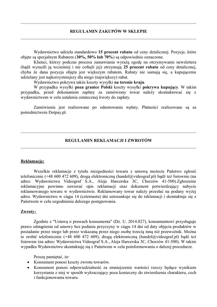 REGULAMIN ZAKUPÓW W SKLEPIE Wydawnictwo udziela standardowo 15 procent rabatu od ceny detalicznej. Pozycje, które objęte są specjalnym Rabatem (30%, 50% lub 70%) są odpowiednio oznaczone. Klienci, którzy podczas procesu zamawiania wyrażą zgodę na otrzymywanie newslettera (bądź wyrazili ją wcześniej i nie cofnęli jej) otrzymują 25 procent rabatu od ceny detalicznej, chyba że dana pozycja objęta jest większym rabatem. Rabaty nie sumują się, a kupującemu udzielany jest najkorzystniejszy dla niego (największy) rabat. Wydawnictwo pokrywa także koszty wysyłki na terenie kraju. W przypadku wysyłki poza granice Polski koszty wysyłki pokrywa kupujący. W takim przypadku, przed dokonaniem zapłaty za zamówiony towar należy skontaktować się z wydawnictwem w celu ustalenia ostatecznej kwoty do zapłaty. Zamówienie jest realizowane po odnotowaniu wpłaty. Płatności realizowane są za pośrednictwem Dotpay.pl. REGULAMIN REKLAMACJI I ZWROTÓW Reklamacje: Wszelkie reklamacje z tytułu niezgodności towaru z umową możecie Państwo zgłosić telefonicznie (+48 600 472 609), drogą elektroniczną ([email protected]) bądź też listownie (na adres: Wydawnictwa Videograf S.A., Aleja Harcerska 3C, Chorzów 41-500).Zgłoszenie reklamacyjne powinno zawierać opis reklamacji oraz dokument potwierdzający nabycie reklamowanego towaru w wydawnictwie. Reklamowany towar należy przesłać na podany wyżej adres. Wydawnictwo w ciągu 14 (czternastu) dni ustosunkuje się do reklamacji i skontaktuje się z Państwem w celu uzgodnienia dalszego postępowania. Zwroty: Zgodnie z "Ustawą o prawach konsumenta" (Dz. U. 2014.827), konsumentowi przysługuje prawo odstąpienia od umowy bez podania przyczyny w ciągu 14 dni od daty objęcia produktów w posiadanie przez niego lub przez wskazaną przez niego osobę trzecią inną niż przewoźnik. Można to zrobić telefonicznie (+48 600 472 609), drogą elektroniczną ([email protected]) bądź też listownie (na adres: Wydawnictwa Videograf S.A., Aleja Harcerska 3C, Chorzów 41-500). W takim wypadku Wydawnictwo skontaktuję sią z Państwem w celu poinformowania o dalszej procedurze. Proszę pamiętać, że: Konsument ponosi koszty zwrotu towarów. Konsument ponosi odpowiedzialność za zmniejszenie wartości rzeczy będące wynikiem korzystania z niej w sposób wykraczający poza konieczny do stwierdzenia charakteru, cech i funkcjonowania towaru. NEWSLETTER Klienci mogą zapisać się na listę newslettera: wpisując swój adres e-mail w odpowiednim okienku na stronie internetowej księgarni; wyrażając zgodę na jego otrzymywanie podczas procesu zamawiania. Klienci zapisani na listę newslettera otrzymują od wydawnictwa specjalny Rabat - patrz „REGULAMIN ZAKUPÓW W SKLEPIE”. Należy pamiętać, aby wpisać prawidłowy i aktualny adres, gdyż błędne adresy skrzynek pocztowych, do których wiadomości wysyłane przez wydawnictwo nie będą docierały, będą usuwane z listy newslettera, a klienci którzy je podali nie będą mogli skorzystać ze specjalnego rabatu. Rezygnacja z otrzymywania newslettera następuje poprzez przesłanie wiadomości o treści: 'Newsletter - rezygnacja' na adres [email protected] Wydawnictwo oświadcza, że podane przez klientów e-maile będą wykorzystane wyłącznie dla celów subskrypcji Newslettera i nie będą przekazywane podmiotom trzecim.