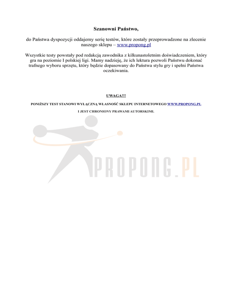 Szanowni Państwo, do Państwa dyspozycji oddajemy serię testów, które zostały przeprowadzone na zlecenie naszego sklepu – www.propong.pl Wszystkie testy powstały pod redakcją zawodnika z kilkunastoletnim doświadczeniem, który gra na poziomie I polskiej ligi. Mamy nadzieję, że ich lektura pozwoli Państwu dokonać trafnego wyboru sprzętu, który będzie dopasowany do Państwa stylu gry i spełni Państwa oczekiwania. UWAGA!!! PONIŻSZY TEST STANOWI WYŁĄCZNĄ WŁASNOŚĆ SKLEPU INTERNETOWEGO WWW.PROPONG.PL I JEST CHRONIONY PRAWAMI AUTORSKIMI. 729 Friendship Faster I 2.0, czarna Jak na chińskie okładziny dość lekka, duża szybkość, dobra kontrola, znakomita rotacja. Posiada zielony podkład TRANSCEND, który z założenia jest lżejszy i bardziej elastyczny niż tradycyjne chińskie podkłady. Z tym się w tym miejscu zgadzam. Ze względu na swoją twardość polecam na miękkie i średnio miękkie deski. Powierzchnia gumy zewnętrznej bardzo klejąca i dlatego polecam przetrzeć przed grą płynem lub wodą. Efekt naprawdę jest dużo lepszy po tym zabiegu. Okładzina nie posiada zbyt dużego katapultu. Przeznaczona raczej do gry bliżej stołu, typowy chiński ping-pong. Wymaga częstego klejenia. Bez kleju gra się nie najlepiej. A żeby otrzymać dobry efekt na kleju trzeba nałożyć go przynajmniej 3 warstwy. Przyrost szybkości i rotacji na świeżym kleju jest bardzo zauważalny, moim zdaniem nawet o ok. 20%. Znakomicie spisuje się w serwisie oraz bloku. Serwis bardzo rotacyjny, za sprawą klejącej powierzchni gumy. Ogromna rotacja, nawet gdy jest czytelna dla przeciwnika, wymusza często jego błędy w odbiorze. Przy bloku, przy braku dużej katapulty, łatwo jest zagrać dokładny i szybki blok. Problem jest natomiast z kontra blokami, w tym elemencie zaczyna trochę brakować elastyczności i katapultu. Na stole gra się znakomicie. Bez problemu można ciągnąć topspiny po bardzo rotacyjnych zagraniach przeciwnika. Przebicie również super. Ale im dalej od stołu, tym gorzej. Kontra topspiny można oczywiście zagrać, ale nie jest to proste i wymaga czasu, żeby je opanować. Zbicie również nie należy do najlepszych. To nie jest okładzina do gry na tzw. „pałę”. Kontrola na zbiciu oczywiście jest, ale brakuje trochę katapultu. PODSUMOWANIE Jest to bardzo dobra okładzina, przede wszystkim dla tych, którzy preferują grę przy stole. Każdy miłośnik typowych chińskich gum będzie na pewno nią zachwycony. Żeby wydobyć cały potencjał tkwiący w tej okładzinie trzeba ją dużo i często kleić. Super kontrola i znakomita rotacja powodują, że na pewno okładzina znajdzie swoich użytkowników. Polecam przede wszystkim do gry rotacyjnej i kontrolowanej. Bardzo wytrzymała, po długim okresie gry nie widać na niej żadnego zużycia. Super ściąga się klej z podkładu. Dosłownie 3 minuty i po kleju, bez żadnej dziurki na podkładzie. 729 Friendship HIGHER I 2.2mm, czarna Posiada większość cech Fastera. Zatem jak na chińskie okładziny również w miarę lekka, średnia szybkość, znakomita rotacja i kontrola. Posiada zielony podkład TRANSCEND, który z założenia jest lżejszy i bardziej elastyczny niż tradycyjne chińskie podkłady. Polecam na miękkie i średnio twarde deski. Powierzchnia gumy zewnętrznej bardzo klejąca i dlatego polecam przetrzeć przed grą płynem lub wodą. Efekt naprawdę jest dużo lepszy po tym zabiegu. Okładzina nie posiada zbyt dużego katapultu. Przeznaczona raczej do gry bliżej stołu, typowy chiński ping-pong. Wymaga częstego klejenia. Bez kleju gra się nie najlepiej. A żeby otrzymać dobry efekt na kleju trzeba nałożyć go przynajmniej 3 warstwy. Przyrost szybkości i rotacji na świeżym kleju jest bardzo zauważalny. Elementy gry gra się bardzo podobnie jak Fasterem. Posiada tylko trochę mniej szybkości, ale za to jeszcze więcej rotacji i kontroli. Zauważyłem jednak, że Higherem gra się też łatwiej dalej od stołu. Jednak brakuje mocy do typowo takiej gry. Ze stołu wszystko leci tam, gdzie się chce. PODSUMOWANIE Wolniejsza wersja Fastera, do bardziej rotacyjnej gry. Żeby z tej okładziny wyciągnąć wszystko, trzeba dużo kleju, minimum 3 warstwy. Warto zauważyć też to, że lepiej się nią gra na deskach zbudowanych w 100% z drewna, na karbonach już gorzej. Bardzo wytrzymała, po długim czasie gry nią nie widać żadnego zużycia. Super ściąga się klej z podkładu. Dosłownie 3 minuty i po kleju bez żadnej dziurki na podkładzie.