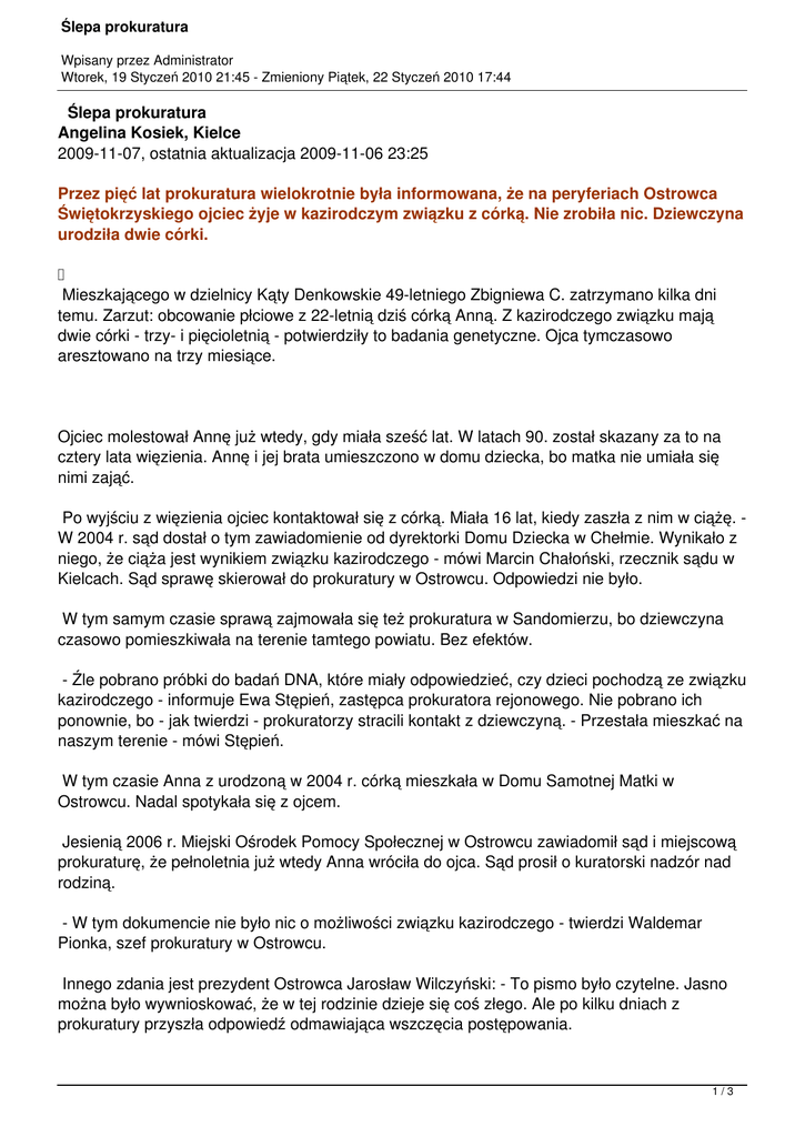 Ślepa prokuratura Wpisany przez Administrator Wtorek, 19 Styczeń 2010 21:45 - Zmieniony Piątek, 22 Styczeń 2010 17:44 Ślepa prokuratura Angelina Kosiek, Kielce 2009-11-07, ostatnia aktualizacja 2009-11-06 23:25 Przez pięć lat prokuratura wielokrotnie była informowana, że na peryferiach Ostrowca Świętokrzyskiego ojciec żyje w kazirodczym związku z córką. Nie zrobiła nic. Dziewczyna urodziła dwie córki. Mieszkającego w dzielnicy Kąty Denkowskie 49-letniego Zbigniewa C. zatrzymano kilka dni temu. Zarzut: obcowanie płciowe z 22-letnią dziś córką Anną. Z kazirodczego związku mają dwie córki - trzy- i pięcioletnią - potwierdziły to badania genetyczne. Ojca tymczasowo aresztowano na trzy miesiące. Ojciec molestował Annę już wtedy, gdy miała sześć lat. W latach 90. został skazany za to na cztery lata więzienia. Annę i jej brata umieszczono w domu dziecka, bo matka nie umiała się nimi zająć. Po wyjściu z więzienia ojciec kontaktował się z córką. Miała 16 lat, kiedy zaszła z nim w ciążę. W 2004 r. sąd dostał o tym zawiadomienie od dyrektorki Domu Dziecka w Chełmie. Wynikało z niego, że ciąża jest wynikiem związku kazirodczego - mówi Marcin Chałoński, rzecznik sądu w Kielcach. Sąd sprawę skierował do prokuratury w Ostrowcu. Odpowiedzi nie było. W tym samym czasie sprawą zajmowała się też prokuratura w Sandomierzu, bo dziewczyna czasowo pomieszkiwała na terenie tamtego powiatu. Bez efektów. - Źle pobrano próbki do badań DNA, które miały odpowiedzieć, czy dzieci pochodzą ze związku kazirodczego - informuje Ewa Stępień, zastępca prokuratora rejonowego. Nie pobrano ich ponownie, bo - jak twierdzi - prokuratorzy stracili kontakt z dziewczyną. - Przestała mieszkać na naszym terenie - mówi Stępień. W tym czasie Anna z urodzoną w 2004 r. córką mieszkała w Domu Samotnej Matki w Ostrowcu. Nadal spotykała się z ojcem. Jesienią 2006 r. Miejski Ośrodek Pomocy Społecznej w Ostrowcu zawiadomił sąd i miejscową prokuraturę, że pełnoletnia już wtedy Anna wróciła do ojca. Sąd prosił o kuratorski nadzór nad rodziną. - W tym dokumencie nie było nic o możliwości związku kazirodczego - twierdzi Waldemar Pionka, szef prokuratury w Ostrowcu. Innego zdania jest prezydent Ostrowca Jarosław Wilczyński: - To pismo było czytelne. Jasno można było wywnioskować, że w tej rodzinie dzieje się coś złego. Ale po kilku dniach z prokuratury przyszła odpowiedź odmawiająca wszczęcia postępowania. 1/3 Ślepa prokuratura Wpisany przez Administrator Wtorek, 19 Styczeń 2010 21:45 - Zmieniony Piątek, 22 Styczeń 2010 17:44 Kuratora nad rodziną ustanowił więc sąd. I rok później, gdy Anna urodziła drugą córkę, to on zawiadomił prokuraturę w Ostrowcu. - Znów odmówili wszczęcia śledztwa. Ich zdaniem zgromadzone materiały i przesłuchani świadkowie nie potwierdzali faktu obcowania płciowego ojca z córką - mówi sędzia Chałoński. Prok. Pionka nie potrafi potwierdzić, że tak było: - Zbadam te doniesienia i wtedy odpowiem. Wiosną tego roku sprawą zajęli się rada osiedla, dzielnicowy i mieszkańcy. - Wysłaliśmy do prokuratury pismo, że ojcem dzieci może być Zbigniew C. W końcu zaczęło się postępowanie opowiada ostrowiecki radny Stanisław Choinka. Prok. Pionka mówi, że ostatnie kilka miesięcy zajęło im gromadzenie materiałów: - Musieliśmy udokumentować relacje ludzi. W dzielnicy Kąty Denkowskie mieszkańcy od dawna mówili o kazirodczym związku ojca z córką. - Nie wiem, dlaczego ktoś tego wcześniej nie zgłosił - zastanawia się mieszkająca nieopodal kobieta. A dlaczego pani tego nie zrobiła? - Myślałam, że ktoś się już tym zajął. Źródło: Gazeta Wyborcza Komentarz CPOID 2/3 Ślepa prokuratura Wpisany przez Administrator Wtorek, 19 Styczeń 2010 21:45 - Zmieniony Piątek, 22 Styczeń 2010 17:44 Co z tego, że będzie Euro 2012, powstają nowe obiekty, na świecie kryzys, a u nas nawet wzrost gospodarczy i wiele, wiele innych wspaniałości o których słyszymy, skoro jeden z filarów naszego państwa – prokuratura i sądownictwo kulej e. Nie pierwszy to raz, kiedy zgłaszamy poważne przestępstwa popełniane przeciwko dzieciom, a ludzie w togach nie reagują, nie prowadzą rzetelnych dochodzeń, śledztw, procesów, kryją sprawców, współpracują z nimi i robią wszystko, by zataić ich występki, a nawet działają przeciwko ludziom zgłaszającym te rzeczy. Choć nie częste to przypadki, ale są i rażą w oczy. Państwo niesprawiedliwe, to państwo złe, niewydolne i niedemokratyczne. Coraz mniej już w Polsce obywateli i rodzin, którzy w taki czy inny sposób nie doświadczyli niesprawiedliwości sądów i nierzetelnego działania prokuratury. Są też i tacy, którzy głośno mówią NIE! To także nasz głos, jako organizacji pozarządowej, która codziennie boryka się z „ślepotą” wymiaru sprawiedliwości. Ireneusz Dzierżęga Centrum Praw Ojca i Dziecka 3/3