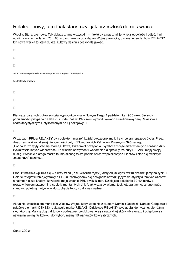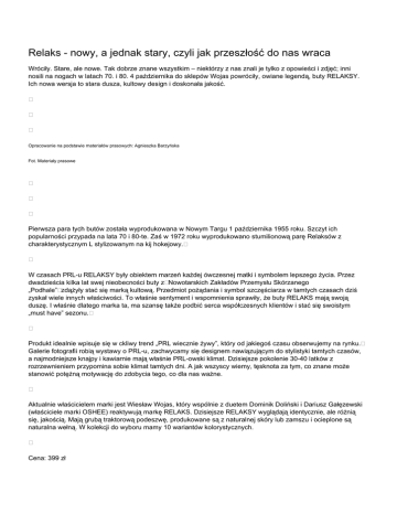 Relaks - nowy, a jednak stary, czyli jak przeszłość do nas wraca Wróciły. Stare, ale nowe. Tak dobrze znane wszystkim – niektórzy z nas znali je tylko z opowieści i zdjęć; inni nosili na nogach w latach 70. i 80. 4 października do sklepów Wojas powróciły, owiane legendą, buty RELAKSY. Ich nowa wersja to stara dusza, kultowy design i doskonała jakość. Opracowanie na podstawie materiałów prasowych: Agnieszka Barzyńska Fot. Materiały prasowe Pierwsza para tych butów została wyprodukowana w Nowym Targu 1 października 1955 roku. Szczyt ich popularności przypada na lata 70 i 80-te. Zaś w 1972 roku wyprodukowano stumilionową parę Relaksów z charakterystycznym L stylizowanym na kij hokejowy. W czasach PRL-u RELAKSY były obiektem marzeń każdej ówczesnej matki i symbolem lepszego życia. Przez dwadzieścia kilka lat swej nieobecności buty z Nowotarskich Zakładów Przemysłu Skórzanego „Podhale” zdążyły stać się marką kultową. Przedmiot pożądania i symbol szczęściarza w tamtych czasach dziś zyskał wiele innych właściwości. To właśnie sentyment i wspomnienia sprawiły, że buty RELAKS mają swoją duszę. I właśnie dlatego marka ta, ma szansę także podbić serca współczesnych klientów i stać się swoistym „must have” sezonu. Produkt idealnie wpisuje się w ckliwy trend „PRL wiecznie żywy”, który od jakiegoś czasu obserwujemy na rynku. Galerie fotografii robią wystawy o PRL-u, zachwycamy się designem nawiązującym do stylistyki tamtych czasów, a najmodniejsze knajpy i kawiarnie mają właśnie PRL-owski klimat. Dzisiejsze pokolenie 30-40 latków z rozrzewnieniem przypomina sobie klimat tamtych dni. A jak wszyscy wiemy, tęsknota za tym, co znane może stanowić potężną motywację do zdobycia tego, co dla nas ważne. Aktualnie właścicielem marki jest Wiesław Wojas, który wspólnie z duetem Dominik Doliński i Dariusz Gałęzewski (właściciele marki OSHEE) reaktywują markę RELAKS. Dzisiejsze RELAKSY wyglądają identycznie, ale różnią się, jakością. Mają grubą traktorową podeszwę, produkowane są z naturalnej skóry lub zamszu i ocieplone są naturalna wełną. W kolekcji do wyboru mamy 10 wariantów kolorystycznych. Cena: 399 zł