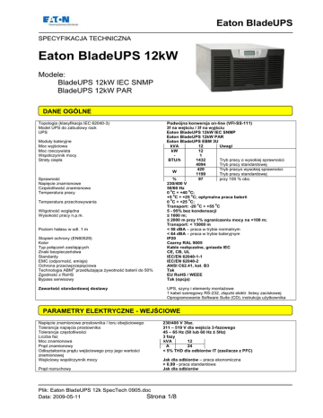 Eaton BladeUPS SPECYFIKACJA TECHNICZNA Eaton BladeUPS 12kW Modele: BladeUPS 12kW IEC SNMP BladeUPS 12kW PAR DANE OGÓLNE Topologia (klasyfikacja IEC 62040-3) Model UPS do zabudowy rack UPS Moduły bateryjne Moc wyjściowa Moc rzeczywista Współczynnik mocy Straty ciepła Sprawność Napięcie znamionowe Częstotliwość znamionowa Temperatura pracy Temperatura przechowywania Wilgotność względna Wysokość pracy n.p.m. Poziom hałasu w odl. 1 m Stopień ochrony (EN60529) Kolor Typ połączeń zasilających Znaki bezpieczeństwa Standardy EMC (odporność, emisja) Ochrona przeciwprzepięciowa ® Technologia ABM przedłużająca żywotność baterii do 50% Zgodność z RoHS Bypass serwisowy Zawartość standardowej dostawy Podwójna konwersja on-line (VFI-SS-111) 3f na wejściu / 3f na wyjściu Eaton BladeUPS 12kW IEC SNMP Eaton BladeUPS 12kW PAR Eaton BladeUPS EBM 3U kVA 12 Uwagi kW 12 1 BTU/h 1432 Tryb pracy o wysokiej sprawności 4094 Tryb pracy standardowej 420 Tryb pracyo wysokiej sprawności W 1199 Tryb pracy standardowej % 97 przy 100 % obc. 230/400 V 50/60 Hz 0 0 0 C ÷ +40 C; 0 0 +5 C ÷ +25 C; optymalna praca baterii 0 0 0 C ÷ +25 C; 0 0 Transport: -20 C ÷ +55 C 5 - 95% bez kondensacji ≤ 1000 m; ≤ 2000 m przy 1% ograniczeniu mocy na +100 m; Transport: < 15000 m < 58 dBA – praca w trybie normalnym < 64 dBA – praca w trybie bateryjnym IP20 Czarny RAL 9005 Kable rozłączalne, gniazda IEC CE, CB, UL IEC/EN 62040-1-1 IEC/EN 62040-2 ANSI C62.41, kat. B3 Tak EU RoHS / WEEE Tak (opcja) UPS, szyny i elementy montażowe 1 kabel szeregowy RS-232, złączki elektr. listwy zaciskowej Oprogramowanie Software Suite (CD), instrukcja użytkownika PARAMETRY ELEKTRYCZNE - WEJŚCIOWE Napięcie znamionowe prostownika / toru obejściowego Tolerancja napięcia prostownika Tolerancja częstotliwości Liczba faz Moc znamionowa Prąd znamionowy Odkształcenia prądu wejściowego przy jego wartości znamionowej Wejściowy współczynnik mocy Prąd rozruchowy 230/400 V 3faz. 311 – 519 V dla wejścia 3-fazowego 45 – 65 Hz (50 lub 60 Hz ± 5Hz) 3 fazy kVA 12 A 24 < 5% THD dla odbiorów IT (zasilacze z PFC) Jak dla odbiorów – praca ekonomiczna > 0,99 - praca standardowa Jak dla odbiorów Plik: Eaton BladeUPS 12k SpecTech 0905.doc Data: 2009-05-11 Strona 1/8 Eaton BladeUPS PARAMETRY ELEKTRYCZNE – WYJŚCIOWE Kształt napięcia (praca normalna) Kształt napięcia (praca autonomiczna) Czas przełączenia z trybu normalnego na bateryjny Czas przerywania / czas załączania Liczba faz PRACA NORMALNA Napięcie znamionowe Zakres zmian napięcia Częstotliwość znamionowa Wahania częstotliwości Moc pozorna Moc rzeczywista w trybie pracy o wys. sprawności Moc rzeczywista w trybie pracy standardowej Całkowite odkształcenia napięcia (obciążenie liniowe) Całkowite odkształcenia napięcia (odbiory IT z zasilaczami PFC) Całkowite odkształcenia napięcia (obciążenie nieliniowe lub bez zasilaczy PFC) Napięcia poszczególnych harmonicznych Zdolność zwarciowa Zdolność przeciążeniowa (bez dostępnego bypassu) Dopuszczalny zakres współczynnika mocy przy obciążeniu liniowym Liczba faz wyjściowych Asymetria napięcia wyjściowego przy wzorcowym obciążeniu asymetrycznym Maksymalna zmiana kąta fazowego Zmiana napięcia wyjściowego podczas przełączania z pracy normalnej na pracę z energii zmagazynowanej i vice versa Zmiana napięcia wyjściowego przy zmianach obciążenia Maksymalna szybkość zmian częstotliwości wyjściowej PRACA AUTONOMICZNA Napięcie znamionowe Zakres zmian napięcia Wartość szczytowa napięcia znamionowego Zmiana wartości szczytowej napięcia znamionowego Częstotliwość znamionowa Wahania częstotliwości Moc pozorna Moc rzeczywista Całkowite odkształcenia napięcia (obciążenie liniowe) Całkowite odkształcenia napięcia (odbiory IT z zasilaczami PFC) Całkowite odkształcenia napięcia (obciążenie nieliniowe lub bez zasilaczy PFC) Zdolność zwarciowa Zdolność przeciążeniowa Dopuszczalny zakres wsp. mocy przy obciążeniu liniowym Liczba faz wyjściowych Zmiana napięcia wyjściowego podczas przełączania z pracy normalnej na pracę z energii zmagazynowanej i vice versa Zmiana napięcia wyjściowego przy zmianach obciążenia Najdłuższy czas trwania pracy z energii zmagazynowanej przy obciążeniu znamionowym Czas pracy ze źródła energii zmagazynowanej Sinusoidalny Sinusoidalny Bez przerwy (0 ms) Bez przerwy (0 ms) 3 fazy 230/400 V 180-255 V / 311-441 V (standardowe) 207-253 V / 358-438 V (ograniczone) 50 Hz(domyślnie) lub 60 Hz Praca zsynchronizowana (tryb pracy normalnej) kVA 12 kW 12 kW 12 2% 3% 5% Patrz oddzielna deklaracja 30 A ograniczona wyłącznikiem wejściowym > 100…110 % obciążenie przez 10 min. > 110…125 % obciążenia przez 1 min. > 125…150 % obciążenia przez 5 s. > 150 % obciążenie przez 300ms W trybie o wysokiej sprawności ograniczone zabezp. 30 A 0,7 ind. ÷ 0,9 poj. 3 Fazy (L1, L2, L3, N, PE) 0% b/d b/d 230/400 V 207-253 V / 358-438 V (ograniczone) b/d b/d 50 Hz (domyślnie) lub 60 Hz < ± 0,1 % kVA 12 kW 12 2% 3% 5% 44 A, <300 ms > 100…110% po 10 min. przełączenie na bypass > 110…130% po 1 min. przełączenie na bypass > 130…150% po 5 s przełączenie na bypass > 150% po 300 ms przełączenie na bypass 0,7 ind. ÷ 0,9 poj. 3 Fazy (L1, L2, L3, N, PE) 0% b/d Bez ograniczeń Patrz ‘Baterie akumulatorów’ Plik: Eaton BladeUPS 12k SpecTech 0905.doc Data: 2009-05-11 Strona 2/8 Eaton BladeUPS TOR OBEJŚCIOWY – BYPASS ELEKTRONICZNY Rodzaj toru obejściowego Mechaniczny / statyczny Przełączanie bezprzerwowe / z przerywaniem Czas przerywania / czas załączania Obwód obejściowy serwisowy Napięcie wejściowe bypassu Automatyczny i mechaniczny (standardowo) Tak / Tak Bezprzerwowe Bezprzerwowe Opcja, zewnętrzny 230/400 V 180-255 V / 311-441 V (standardowe) 207-253 V / 358-438 V (ograniczone) Tolerancja napięcia wejściowego Dane znamionowe bezpiecznika albo wyłącznika zabezpieczającego tor 