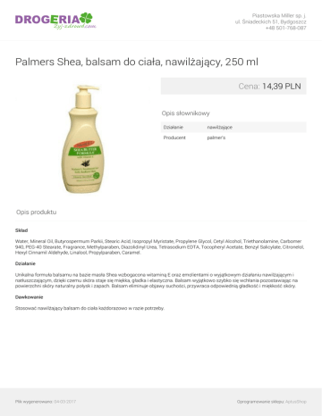 Piastowska Miller sp. j. ul. Śniadeckich 51, Bydgoszcz +48 501-768-087 Palmers Shea, balsam do ciała, nawilżający, 250 ml Cena: 14,39 PLN Opis słownikowy Działanie nawilżające Producent palmer's Opis produktu Skład Water, Mineral Oil, Butyrospermum Parkii, Stearic Acid, Isopropyl Myristate, Propylene Glycol, Cetyl Alcohol, Triethanolamine, Carbomer 940, PEG-40 Stearate, Fragrance, Methylparaben, Diazolidinyl Urea, Tetrasodium EDTA, Tocopheryl Acetate, Benzyl Salicylate, Citronelol, Hexyl Cinnamil Aldehyde, Linalool, Propylparaben, Caramel. Działanie Unikalna formuła balsamu na bazie masła Shea wzbogacona witaminą E oraz emolientami o wyjątkowym działaniu nawilżającym i natłuszczającym, dzięki czemu skóra staje się miękka, gładka i elastyczna. Balsam wyjątkowo szybko się wchłania pozostawiając na powierzchni skóry naturalny połysk i zapach. Balsam eliminuje objawy suchości, przywraca odpowiednią gładkość i miękkość skóry. Dawkowanie Stosować nawilżający balsam do ciała każdorazowo w razie potrzeby. Plik wygenerowano: 04-03-2017 Powered by TCPDF (www.tcpdf.org) Oprogramowanie sklepu: AptusShop