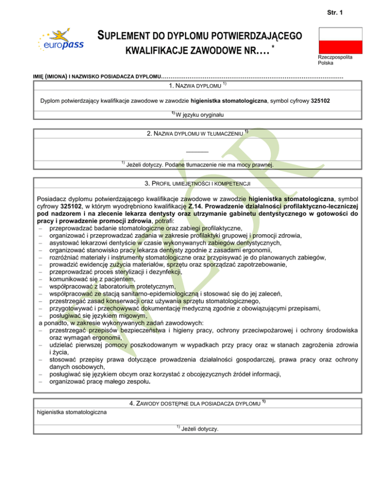 Str. 1 SUPLEMENT DO DYPLOMU POTWIERDZAJĄCEGO KWALIFIKACJE ZAWODOWE NR…. * Rzeczpospolita Polska IMIĘ (IMIONA) I NAZWISKO POSIADACZA DYPLOMU…………………………………………………………………………………… 1. NAZWA DYPLOMU 1) Dyplom potwierdzający kwalifikacje zawodowe w zawodzie higienistka stomatologiczna, symbol cyfrowy 325102 1) W języku oryginału 2. NAZWA DYPLOMU W TŁUMACZENIU 1) _______ 1) Jeżeli dotyczy. Podane tłumaczenie nie ma mocy prawnej. 3. PROFIL UMIEJĘTNOŚCI I KOMPETENCJI Posiadacz dyplomu potwierdzającego kwalifikacje zawodowe w zawodzie higienistka stomatologiczna, symbol cyfrowy 325102, w którym wyodrębniono kwalifikację Z.14. Prowadzenie działalności profilaktyczno-leczniczej pod nadzorem i na zlecenie lekarza dentysty oraz utrzymanie gabinetu dentystycznego w gotowości do pracy i prowadzenie promocji zdrowia, potrafi: – przeprowadzać badanie stomatologiczne oraz zabiegi profilaktyczne, – organizować i przeprowadzać zadania w zakresie profilaktyki grupowej i promocji zdrowia, – asystować lekarzowi dentyście w czasie wykonywanych zabiegów dentystycznych, – organizować stanowisko pracy lekarza dentysty zgodnie z zasadami ergonomii, – rozróżniać materiały i instrumenty stomatologiczne oraz przypisywać je do planowanych zabiegów, – prowadzić ewidencję zużycia materiałów, sprzętu oraz sporządzać zapotrzebowanie, – przeprowadzać proces sterylizacji i dezynfekcji, – komunikować się z pacjentem, – współpracować z laboratorium protetycznym, – współpracować ze stacją sanitarno-epidemiologiczną i stosować się do jej zaleceń, – przestrzegać zasad konserwacji oraz używania sprzętu stomatologicznego, – przygotowywać i przechowywać dokumentację medyczną zgodnie z obowiązującymi przepisami, – posługiwać się językiem migowym, a ponadto, w zakresie wykonywanych zadań zawodowych: – przestrzegać przepisów bezpieczeństwa i higieny pracy, ochrony przeciwpożarowej i ochrony środowiska oraz wymagań ergonomii, – udzielać pierwszej pomocy poszkodowanym w wypadkach przy pracy oraz w stanach zagrożenia zdrowia i życia, – stosować przepisy prawa dotyczące prowadzenia działalności gospodarczej, prawa pracy oraz ochrony danych osobowych, – posługiwać się językiem obcym oraz korzystać z obcojęzycznych źródeł informacji, – organizować pracę małego zespołu. 4. ZAWODY DOSTĘPNE DLA POSIADACZA DYPLOMU higienistka stomatologiczna 1) Jeżeli dotyczy. 1) Str. 2 5.PODSTAWA WYDANIA DYPLOMU Nazwa podmiotu wydającego dyplom Okręgowa Komisja Egzaminacyjna w …………………………. Nazwa władz sprawujących nadzór nad podmiotem wydającym dyplom Minister Edukacji Narodowej Poziom wykształcenia (krajowy lub międzynarodowy) ISCED 4 Warunki zdania egzaminu potwierdzającego kwalifikacje w zawodzie Egzamin przeprowadzany jest z każdej kwalifikacji wyodrębnionej w zawodzie. Warunkiem zdania egzaminu zawodowego, złożonego z dwóch części, jest uzyskanie: 1) z części pisemnej - co najmniej 50% punktów możliwych do uzyskania, 2) z części praktycznej - co najmniej 75% punktów możliwych do uzyskania. Dostęp do następnego poziomu kształcenia Jeżeli posiadacz dyplomu uzyskał świadectwo dojrzałości, może kontynuować kształcenie w szkole wyższej. Umowy międzynarodowe _______ Podstawa prawna wydania dyplomu stosowne rozporządzenie 6. OFICJALNIE UZNANE SPOSOBY UZYSKANIA DYPLOMU Posiadacz dyplomu uzyskał wykształcenie średnie oraz zdał egzamin potwierdzający kwalifikację Z.14. Prowadzenie działalności profilaktyczno-leczniczej pod nadzorem i na zlecenie lekarza dentysty oraz utrzymanie gabinetu dentystycznego w gotowości do pracy i prowadzenie promocji zdrowia w zawodzie higienistka stomatologiczna. Kwalifikacja wyodrębniona w tym zawodzie jest możliwa do uzyskania w ramach poniższych sposobów nabywania kwalifikacji: Możliwe sposoby nabywania kwalifikacji w zawodzie higienistka stomatologiczna Udział kształcenia teoretycznego/praktycznego (%) Kształcenie w szkole (2-letnia szkoła policealna) Kształcenie ustawiczne w formach pozaszkolnych (minimalna liczba godzin kształcenia określona w podstawie programowej kształcenia w zawodach) Potwierdzanie kwalifikacji w trybie egzaminów eksternistycznych dla osób, które ukończyły gimnazjum albo 8-letnią szkołę podstawową oraz: a) co najmniej 2 lata kształciły się w zawodzie lub b) co najmniej 2 lata pracowały w zawodzie 50/50 – – Informacje dodatkowe: Okręgowa Komisja Egzaminacyjna w ………………………, e-mail: Więcej informacji (w tym opis krajowego systemu kwalifikacji) można znaleźć w Internecie pod adresem: www.men.gov.pl, www.koweziu.edu.pl Krajowy punkt informacyjny: www.europass.org.pl *Nota objaśniająca Niniejszy dokument ma na celu dostarczenie dodatkowych informacji na temat dyplomu potwierdzającego kwalifikacje zawodowe i sam w sobie nie ma mocy prawnej. Podstawą opisu są następujące teksty: Rezolucja Rady nr 93/C 49/01 z dnia 3 grudnia 1992 r. dotycząca przejrzystości kwalifikacji, Rezolucja Rady nr 96/C 224/04 z dnia 15 lipca 1996 r. dotycząca przejrzystości dyplomów szkolenia zawodowego, Zalecenie Parlamentu Europejskiego oraz Rady nr 2001/613/EC z dnia 10 lipca 2001 r. w sprawie mobilności w ramach Wspólnoty studentów, osób przechodzących szkolenia, wolontariuszy, nauczycieli i instruktorów. Więcej informacji można uzyskać pod adresem: http://europass.cedefop.eu.int © European Communities 2002