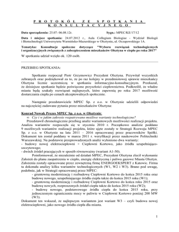 P R O T O K Ó Ł Z E S P O T K A N I A K O N S U L T A C Y J N E G O Data sporządzenia: 25.07- 06.08.12r. Sygn.: MPEC/KE/17/12 Data i miejsce spotkania: 24.07.2012 r., Aula Collegium Biologiae - Wydział Biologii i Biotechnologii Uniwersytetu Warmińsko-Mazurskiego w Olsztynie, ul. Oczapowskiego 1A. Tematyka: Konsultacje społeczne dotyczące "Wyboru rozwiązań technologicznych i organizacyjnych związanych z zabezpieczeniem mieszkańców Olsztyna w ciepło po roku 2017" W spotkaniu udział wzięło ok. 120 osób. PRZEBIEG SPOTKANIA: Spotkanie rozpoczął Piotr Grzymowicz Prezydent Olsztyna. Przywitał wszystkich zebranych oraz podziękował za to, że po raz kolejny w przedmiotowej sprawie mieszkańcy Olsztyna licznie uczestniczą w spotkaniu informacyjno-konsultacyjnym. Przekazał, że dzisiejsze spotkanie będzie poświęcone przyszłości ciepłownictwa. Podkreślił, że władze miasta będą szukały rozwiązań najlepszych, które zapewnią po roku 2017 możliwość dostarczania ciepła po cenach akceptowalnych społecznie. Następnie przedstawiciele MPEC Sp. z o.o. w Olsztynie udzielili odpowiedzi na najczęściej zadawane pytania przez mieszkańców Olsztyna: Konrad Nowak Prezes MPEC Sp. z o.o. w Olsztynie: • Czy i w jakim zakresie rozpatrywano możliwe warianty technologiczne? Przedstawił chronologicznie przebieg analiz wariantowych możliwości realizacji projektu. Analiza wariantów rozpoczęła się w styczniu 2010 r. Początkowo analizie poddano 9 możliwych wariantów realizacji projektu, które ujęte zostały w Strategii Rozwoju MPEC Sp. z o.o. w Olsztynie na lata 2011 – 2016 opracowanej przez pracowników Spółki. Dokument ten został poddany w marcu 2011 r. weryfikacji przez naukowców Politechniki Warszawskiej. Na podstawie przeprowadzonych analiz wyłoniono dwa warianty: - budowy nowej elektrociepłowni + Ciepłowni Kortowo, jako źródła uzupełniającoszczytowego; - dwóch źródeł pracujących w sposób równoważny (wariant A1-50). Poinformował, że niezależnie od działań MPEC, Prezydent Olsztyna zlecił wykonanie Założeń do planu zaopatrzenia w ciepło, energię elektryczną i paliwa gazowe Miasta Olsztyn. Założenia zostały opracowane przez zewnętrzną firmę ENERGOEKSPERT z Katowic. Firma ta dokonała analizy kilku wariantów technologicznych (W1, W2 i W3). Brano pod uwagę, podobnie, jak w Strategii opracowanej przez MPEC: - gruntowną modernizację i rozbudowę Ciepłowni Kortowo do końca 2015 roku oraz budowę nowego, uzupełniającego źródła ciepła także do końca 2015 roku (W1); - gruntowną modernizację i rozbudowę Ciepłowni Kortowo do końca roku 2015 oraz budowę nowych, rozproszonych źródeł ciepła także do końca 2015 roku (W2); - budowę nowego, podstawowego źródła ciepła do końca 2015 roku, przy jednoczesnym ograniczeniu mocy w paliwie w Ciepłowni Kortowo poniżej 200 MW (W3). Dokument ten wskazał, że najlepszym wariantem jest wariant W3 – czyli budowa nowej elektrociepłowni, jako nowego źródła ciepła dla miasta. 1 Z trzech wyżej wymienionych dokumentów wynikało, iż najlepszym rozwiązaniem jest budowa nowej elektrociepłowni dla miasta - na etapie tworzenia studium wykonalności ograniczono liczbę wariantów do takich rozwiązań, które zakładały budowę nowego źródła. Przedstawił w formie multimedialnej kilka wariantów, które różnią się technologią spalania, rodzajem paliw oraz wielkością poszczególnych jednostek. W wyniku opracowania studium wykonalności zostały zaproponowane dwa warianty budowy bloku kogeneracyjnego zasilanego paliwem gazowym w technologii parowo-gazowej, lub zespół dwóch jednostek wytwórczych, składający się z bloku parowo-gazowego zasilanego gazem ziemnym oraz bloku parowego zasilanego paliwem alternatywnym (stabilat, RDF) oraz biomasą. Warianty te zostały przedstawione na spotkaniu informacyjnym w dniu 26 czerwca br. Podkreślił, że jeżeli dojdzie do realizacji koncepcji w formule partnerstwa publicznoprywatnego, to o rozwiązaniu technicznym budowy nowego źródła zdecyduje etap negocjacji z potencjalnymi partnerami, czy inwestorami. • Czy negocjacje z Michelin prowadzono w stopniu wystarczającym i jakie są powody wycofania się fabryki z dostaw? Poinformował, że odnośnie przyszłej współpracy z firmą Michelin Polska S.A. rozpoczęto rozmowy już w 2007 r. Wówczas MPEC podjął próbę renegocjacji warunków umowy w zakresie bezpieczeństwa dostaw ciepła. MPEC zaproponował zmianę zapisów odnośnie terminu wypowiedzenia umowy na okres 10-letni (obecnie jest 24 miesiące). Dopiero w 2010 r. Michelin zawiadomiło o zamiarze obniżenia dostaw ciepła na potrzeby odbiorców ciepła. Informacja ta zainicjowała MPEC do podjęcia prac nad opracowaniem alternatywnych rozwiązań. Wówczas rozpoczął się proces negocjacji z Michelin. W powyższej sprawie, pomiędzy Michelin a MPEC, odbyło się 13 spotkań oraz wymieniono ok. 23 pism (w tym również ze strony Władz Miasta). Przedstawił chronologiczne zestawienie pism oraz spotkań, z których najistotniejsze omówił szerzej: - w listopadzie 2011r. Michelin poinformowało, że nie może udostępnić MPEC części wodnej. Natomiast fabryka zaproponowała odkupienie działki z hałdą popiołu z możliwością jej usunięcia przez MPEC. Jednak po dokonaniu specjalistycznej analizy kosztów, okazało się, że usunięcie hałdy popiołu byłoby zbyt kosztowne, a uzyskane grunty (3 ha) byłyby zbyt małe do wybudowania nowego źródła. - w maju 2012 r. Michelin poinformowało o zamiarze zaprzestania produkcji ciepła dla klientów zewnętrznych po roku 2015. - w marcu 2012 r., po interwencji Prezydenta Olsztyna, Michelin wyraził zgodę na podpisanie listu intencyjnego w zakresie przedłużania dostaw ciepła do roku 2017. Podkreślił, że przez kilka lat czynnie próbowano wynegocjować u Michelin możliwe rozwiązania, które pozwoliłyby na dalszą kontynuację współpracy, al