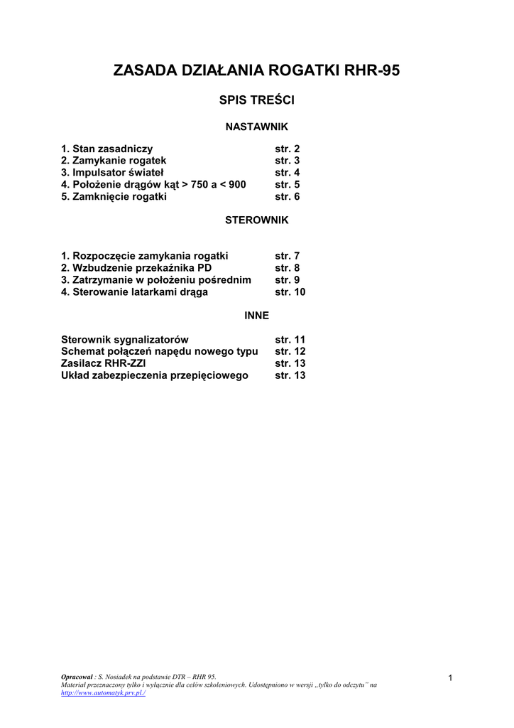 ZASADA DZIAŁANIA ROGATKI RHR-95 SPIS TREŚCI NASTAWNIK 1. Stan zasadniczy 2. Zamykanie rogatek 3. Impulsator świateł 4. PołoŜenie drągów kąt > 750 a < 900 5. Zamknięcie rogatki str. 2 str. 3 str. 4 str. 5 str. 6 STEROWNIK 1. Rozpoczęcie zamykania rogatki 2. Wzbudzenie przekaźnika PD 3. Zatrzymanie w połoŜeniu pośrednim 4. Sterowanie latarkami drąga str. 7 str. 8 str. 9 str. 10 INNE Sterownik sygnalizatorów Schemat połączeń napędu nowego typu Zasilacz RHR-ZZI Układ zabezpieczenia przepięciowego str. 11 str. 12 str. 13 str. 13 Opracował : S. Nosiadek na podstawie DTR – RHR 95. Materiał przeznaczony tylko i wyłącznie dla celów szkoleniowych. Udostępniono w wersji „tylko do odczytu” na http://www.automatyk.prv.pl./ 1 Stan zasadniczy. Układ impulsatora i sterowania światłami drągów Dla rogatek z odległości VCC 12 9 13 PR1 13 PWO Q U5 14541 B A Q 12 10 U1 9 14541 R13 - 10k 8 U2A 1 8 6 R14 - 20k Ukł. opóźnienia zamykania K2 12 13 11 T2 R16 VCC VCC U2C U2B 8 9 4 10 R17 5 6 VCC U2D 3 2 6 10 VCC T1 R1 K7 R31 K8 / IMP IMP 7 K3 8 K4 K6 K5 P75 K1 U3A 4049 VCC D8 2 LZL LZP 13 3 Dz AW OSW ZAŁ 1 Gp WO 4 GP 3 DP 12 8 1 2 11 U4C 6 1 PPZ U4F WO 2 12 GL 4 DL 3 R7 11 U3D L1-0 1 2 3 LSa 1 PPZ 8 6 4049 6 P0 L2 9 2 U3E 3 2 9 10 4 L1-90 R8 P90 P1 5 LX 2k 3 5 D1 9 B 1 4049 4 P1-90 PWO JP-LS U3B 3 4049 P0 P1 4049 7 6 15 14 13 2 U3C P1-0 1 2 3 4 5 2 7 4049 B P_L Gp 1 OPCJE BUZER Dp 1 WYŁ PWO 4 7 A 3 R32 2 3 4 5 7 A UA7812 2 P_P Dp VCC 1 13 8 10 P90 L2 4049 11 12 LSb U4D L2-0 2k 2 Układ sterowania ( przyciski) P0 L1 5 P90 L1 6 P0 P2 9 P90 P2 10 4049 1 U4E 3 4049 L2-90 Dp Gp 1 2 3 4 5 DL GL U4B P2-0 4049 1 Połączenia przycisków przy braku wstępnego ostrzegania i przy uzaleŜnieniu otwarcia rogatek 1 2 3 4 5 2 3 4049 P2-90 VCC KSC 1 R24 LSa 2k 2 LZL A 3 KSD R23 LSb 2k 25 26 27 28 28 27 26 25 OPCJA B Na schematach poziomy niskie ( 0 logiczne czyli ≈ 0 V) zaznaczono kolorem niebieskim natomiast poziom wysoki ( 1 logiczna czyli napięcie 8 ÷ 14V ) kolorem czerwonym. Istotny stan neutralny to kolor fioletowy. Na czarno natomiast oznaczone pozostałe połączenia. W stanie zasadniczym, gdy przyciski sterowania nie są naciśniete to wyjścia GP, DP, GL, DL są w stanie neutralnym tzn. nie występuje na nich Ŝaden potencjał. Na wyjściu Dz jest stan niski. RównieŜ na bazach tranzystorów T1 i T2 jest poziom wysoki, więc tranzystory kluczujące są zatkane ( nie przewodzą). Tym samym nie świecą światła na drągach i sygnalizatorach. Drągi są w połoŜeniu pionowym, więc na wejściach P90 jest poziom niski powodujący świecenie diod LED P1-90,P2-90, L190, L2-90. Opracował : S. Nosiadek na podstawie DTR – RHR 95. Materiał przeznaczony tylko i wyłącznie dla celów szkoleniowych. Udostępniono w wersji „tylko do odczytu” na http://www.automatyk.prv.pl./ 2 Zamykanie rogatki. Układ impulsatora i sterowania światłami drągów Dla rogatek z odległości VCC 12 9 13 PR1 Q U5 14541 U2A 13 PWO B A Q 12 10 U1 9 14541 R13 - 10k 8 1 8 6 R14 - 20k Ukł. opóźnienia zamykania K2 12 13 11 T2 R16 VCC VCC U2C U2B 8 9 4 10 R17 5 6 T1 7 K3 VCC U2D 3 2 6 10 VCC K4 K7 R31 K8 / IMP P75 K1 U3A 4049 VCC D8 2 LZL LZP 13 3 Dz AW OSW ZAŁ 1 Gp WO 4 GP 3 DP 12 8 1 2 11 U4C 6 WO 1 PPZ U4F 2 GL 4 DL 3 11 P90 P1 6 P0 L2 9 5 U3D L1-0 1 2 3 LSa 1 PPZ 8 6 4049 2 U3E 3 2 9 10 4 L1-90 R8 5 LX 2k 3 P0 P1 D1 9 B R7 4049 4 P1-90 PWO 1 2 U3B 3 4049 12 4049 7 6 15 14 JP-LS 2 U3C P1-0 1 13 1 7 4049 B 2 3 4 5 1 OPCJE P_L Gp 7 A WYŁ BUZER Dp 7 A UA7812 2 PWO 4 8 3 R32 2 3 4 5 VCC 1 13 P_P Dp IMP 8 K6 K5 R1 10 P90 L2 4049 11 12 LSb U4D L2-0 2k 2 Układ sterowania ( przyciski) P0 L1 5 P90 L1 6 P0 P2 9 P90 P2 10 4049 1 U4E 3 4049 L2-90 Dp Gp 1 2 3 4 5 DL GL U4B P2-0 4049 1 Połączenia przycisków przy braku wstępnego ostrzegania i przy uzaleŜnieniu otwarcia rogatek 1 2 3 4 5 2 3 4049 P2-90 VCC KSC 1 R24 LSa 2k 2 LZL A 3 KSD R23 LSb 2k 25 26 27 28 28 27 26 25 OPCJA B Po naciśnięciu przycisku DP podany zostanie wysoki poziom na wejście U3A. Tym samym na wyjściu bramki zmieni się stan na niski. Spowoduje on rozpoczęcie cyklu odliczania układu U5 oraz spowoduje zmianę poziomu wyjścia bramki NAND U2c na wysoki. NaleŜy pamiętać, Ŝe niski poziom na wyjściu bramki NAND uzyskujemy tylko wtedy, gdy na obu wejściach jest poziom wysoki. Po czasie zadanym dla układu U4 ( min 8 sek.) wyjście Q zmieni stan wysoki na niski powodując wzbudzenie się przekaźnika PWO. Ten natomiast spowoduje pojawienie się wysokiego poziomu na wyjście sterujące napędami ( DP). RównieŜ naciśnięcie przycisku DL spowoduje takie samo zachowanie się podzespołów ( o ile wcześniej nie był naciśniety przycisk DP) lub rozpocznie się zamykanie lewej rogatki. Układ czasowy bierze udział tylko w rogatkach zamykanych z odległości. Opis pracy układu impulsatora sterowania światłami został opisany poniŜej. Opracował : S. Nosiadek na podstawie DTR – RHR 95. Materiał przeznaczony tylko i wyłącznie dla celów szkoleniowych. Udostępniono w wersji „tylko do odczytu” na http://www.automatyk.prv.pl./ 3 IMPULSATOR Impulsator zbudowany jest z uniwersalnego układu czasowego CD14541. Układ ten moŜe pracować jako generator monostabilny ( układ pojedynczego impulsu) np. jako układ opóźnionego zamykania rogatki (U5) lub jako generator astabilny np. U1 ( ciągłe impulsy). Generator (U1) wytwarza na swoim wyjściu ciąg impulsów prostokątnych o odpowiedniej częstotliwości. Impulsy te wytwarzane są ciągle – niezaleŜnie od tego czy rogatka jest zamknięta czy otwarta. Wyjście impulsów prostokątnych „Imp” uzaleŜnione jest od poziomu logicznego na wejściach bramki U2B ,na nóŜce 13 U2D oraz 9 U2C. W stanie zasadniczym na obu nóŜkach U2B jest stan wysoki a tym samym na wyjściu tej bramki jest stan niski. Zmiana poziomu na niski na którymś z wejść U2B powoduje natychmiastowe przejście na stan wysoki wyjścia bramki. Wyjście bramki U2B ( nóŜka 4) połączona jest z wej