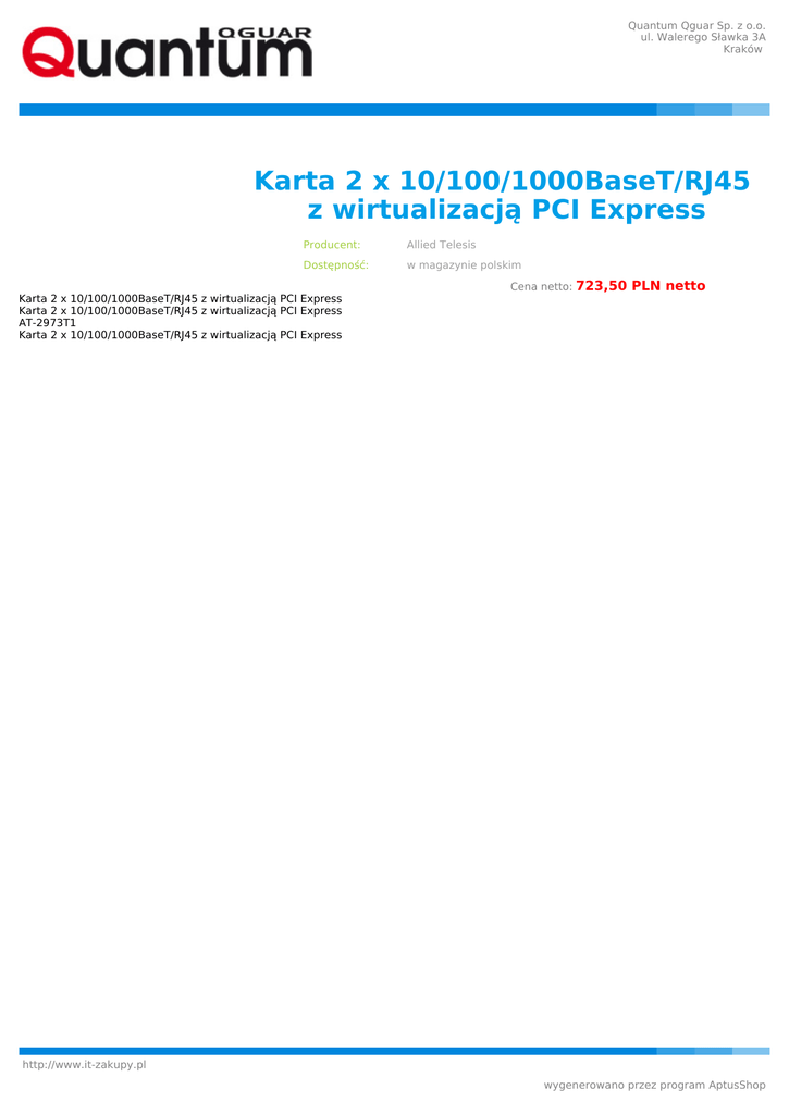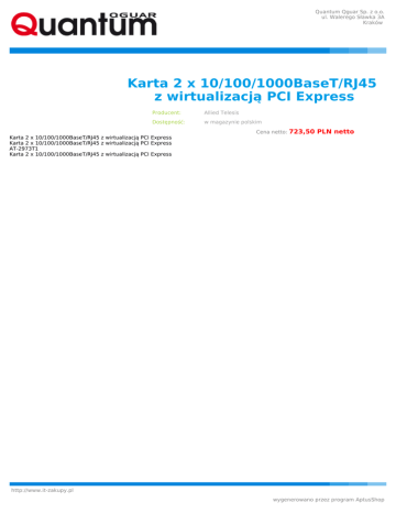 Quantum Qguar Sp. z o.o. ul. Walerego Sławka 3A Kraków Karta 2 x 10/100/1000BaseT/RJ45 z wirtualizacją PCI Express Producent: Allied Telesis Dostępność: w magazynie polskim Cena netto: 723,50 PLN netto Karta 2 x 10/100/1000BaseT/RJ45 z wirtualizacją PCI Express Karta 2 x 10/100/1000BaseT/RJ45 z wirtualizacją PCI Express AT-2973T1 Karta 2 x 10/100/1000BaseT/RJ45 z wirtualizacją PCI Express http://www.it-zakupy.pl wygenerowano przez program AptusShop