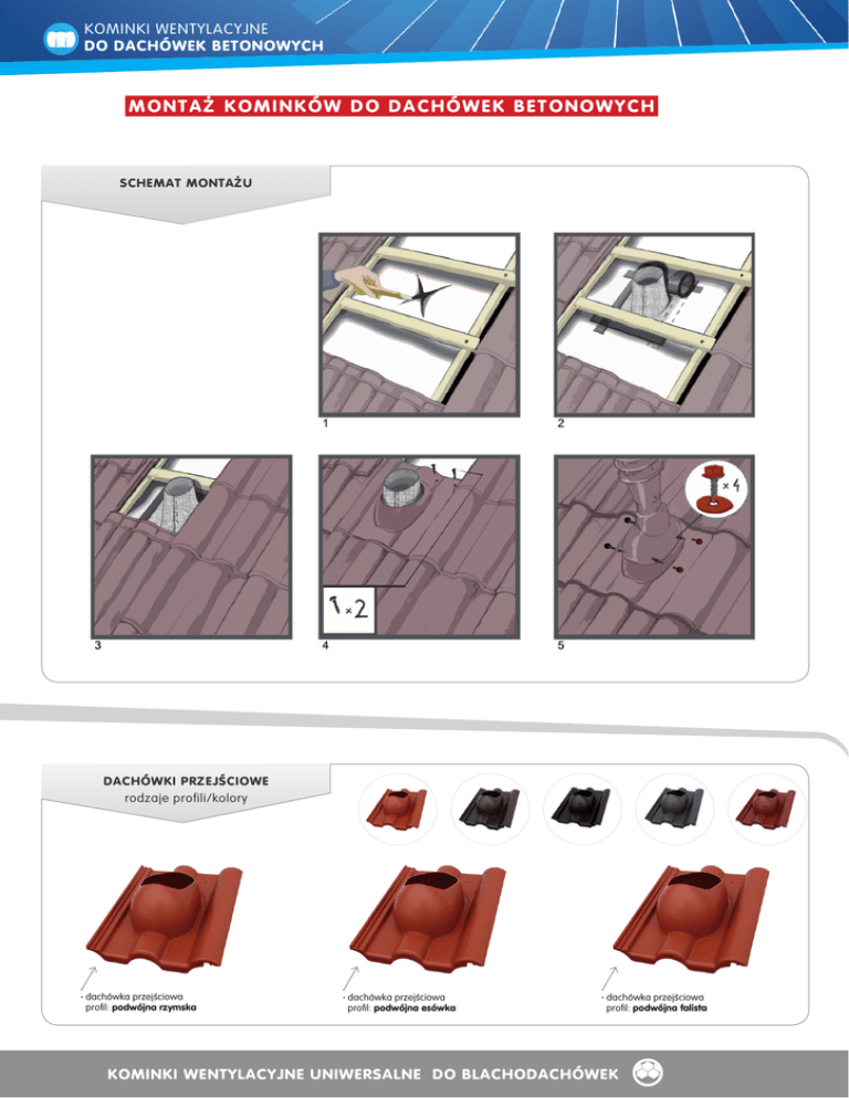 KOMINKI WENTYLACYJNE DO DACHÓWEK BETONOWYCH MONTAŻ KOMINKÓW DO DACHÓWEK BETONOWYCH SCHEMAT MONTAŻU DACHÓWKI PRZEJŚCIOWE rodzaje profili/kolory · dachówka przejściowa profil: podwójna rzymska · dachówka przejściowa profil: podwójna esówka · dachówka przejściowa profil: podwójna falista KOMINKI WENTYLACYJNE UNIWERSALNE DO BLACHODACHÓWEK