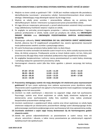 REGULAMIN KORZYSTANIA Z SZATNI ORAZ SYSTEMU KONTROLI WEJŚĆ I WYJŚĆ ZE SZKOŁY 1. Wejście na teren szkoły w godzinach 7.00 – 16.00 jest możliwe wyłącznie dla posiadaczy identyfikatorów (uczniowie i pracownicy szkoły). Gościom/interesantom drzwi otwiera obsługa. Odwiedzający mają obowiązek wpisać się do księgi wizyt. 2. Wyjście ze szkoły przez uczniów i pracowników odbywa się za pomocą kart identyfikacyjnych. Goście i interesanci są wypuszczani przez pracowników szkoły. 3. W ciągu dnia po rozpoczęciu pierwszych, a przed zakończeniem ostatnich lekcji uczniowie mają zablokowaną możliwość wejścia i wyjścia ze szkoły. 4. Ze względu na potrzebę przestrzegania przepisów z zakresu bezpieczeństwa i higieny podczas przebywania w szkole, każdy uczeń po przybyciu do szkoły, ma OBOWIĄZEK ZMIANY OBUWIA oraz OBOWIĄZEK POZOSTAWIENIA OKRYCIA WIERZCHNIEGO W SZATNI. 5. Obowiązuje całkowity ZAKAZ WNOSZENIA DO SAL LEKCYJNYCH OKRYĆ WIERZCHNICH (kurtek, płaszczy itp.) W wyjątkowych przypadkach (np. awaria ogrzewania) nauczyciel może jednorazowo zwolnić uczniów z powyższego zakazu. 6. W szatni funkcjonują zamykane boksy (jeden boks na dwie klasy). 7. Uczniowi nie wolno wchodzić do boksów szatni innych niż te, które zostały wyznaczone dla klasy, do której uczęszcza. Przebywanie ucznia w innym boksie szatni, niż ten, który jest przeznaczony dla jego klasy może wzbudzać podejrzenia chęci popełnienia kradzieży. 8. Ze względów bezpieczeństwa i ochrony rzeczy pozostawianych w szatni boksy otwierają i zamykają wyłącznie upoważnieni pracownicy szkoły. 9. Harmonogram otwarcia szatni (dla klas które zgodnie z planem zaczynają lub kończą lekcje): 07.20 – 07.55 08.20 – 08.45 09.10 – 09.35 10.15 – 10.20 11.05 – 11.20 12.00 – 12.25 13.05 – 13.25 14.00 – 14.20 14.55 – 15.10 15.45 – 16.05 16.40 – 17.00 10. Pracownicy obsługujący szatnie nie mają obowiązku ich otwierania poza wyznaczonymi godzinami! W tym czasie wykonują inne zadania wyznaczone przez dyrektora szkoły. Otworzenie szatni w godzinach nie ujętych w harmonogramie może wyjątkowo nastąpić na prośbę ucznia lub nauczyciela. 11. Uczniom na stałe zwolnionym z obecności na zajęciach religii, etyki lub wychowania fizycznego, szatnia oraz drzwi wyjściowe ze szkoły będą otwierane wyłącznie po dostarczeniu przez wychowawców stałej listy zwolnień. Listę należy przekazać bezpośrednio pracownikom obsługi szatni. 12. Uczniom zwolnionym z pojedynczych lekcji, szatnia oraz drzwi wyjściowe ze szkoły będą otwierane wyłącznie po dostarczeniu pracownikom obsługi szatni obowiązującego druku jednorazowego zwolnienia podpisanego przez wychowawcę lub inną upoważnioną osobę. 13. Uczniowie zwolnieni z części zajęć muszą dostosować się do harmonogramu godzin otwarcia szatni. 14. Szkoła nie ponosi odpowiedzialności za pozostawione w szatni rzeczy inne niż okrycie wierzchnie i obuwie, a także rzeczy pozostawione po zakończonych zajęciach dydaktycznych lub opiekuńczych. Dyrektor Szkoły Łódź 2016-10-28 Wojciech Ulatowski