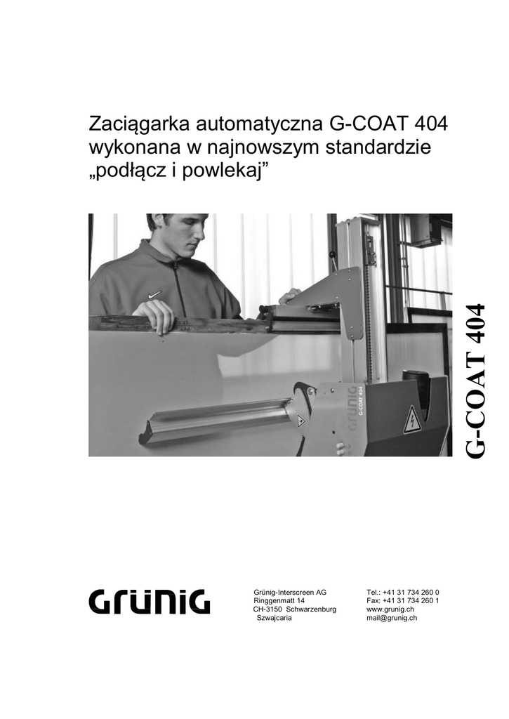 G-COAT 404 Zaciągarka automatyczna G-COAT 404 wykonana w najnowszym standardzie „podłącz i powlekaj” Grünig-Interscreen AG Ringgenmatt 14 CH-3150 Schwarzenburg Szwajcaria Tel.: +41 31 734 260 0 Fax: +41 31 734 260 1 www.grunig.ch [email protected] G-COAT 404 Zaciągarka automatyczna Charakterystyka urządzenia Głowica nanosząca i ustawienia parametrów ■ ■ ■ ■ ■ Stelaż na ramę i ruchomy uchwyt ■ ■ ■ Wymiary ramy sita Szerokość ramy sita Wysokość ramy sita Wysokość profilu ramy Grubość profilu ramy 2” Dostępne opcje K1, K2, K3 Gabaryty Szerokość całk. mm/cal Wysokość całk. mm/cal Głębokość całk. mm/cal Zasilanie Napięcie znam. Bezpiecznik Moc Częstotliwość 540 / 21” 2035 / 80” 540 / 21” V V A kW Hz dB (A) 1250/50“ 1250 / 50” 1500 / 59” 30-100/1,2-4” 20–50 / 0,8- 1 x 230+N+PE 1 x 110+N+PE 1 0,2 50/60 1 1 < 70 540/21“ Stały poziom ciśnienia akustycznego mm/cal mm/cal mm/cal mm/cal Opcja K3 ■ Stojak na sita typu CD 1500/59“ ■ Opcja K2 ■ Stojak na sita profile sit małoformatowych 213/8,3“ ■ ■ Opcja K1 ■ Stojak na sita małoformatowe 100/4“ ■ Standard „PODŁĄCZ I POWLEKAJ”. Urządzenie wystarczy rozpakować, ustawić i można rozpocząć pracę Unikalna konstrukcja z centralnym prowadzeniem głowicy pozwala uzyskać najwyższą jakość przy niezwykle niskiej cenie Automatyczny proces jednostronnego zaciągania Proces zaciągania od strony raklowej lub drukowej Gwarantowana powtarzalność procesu przy zaciąganiu „mokre na mokre” oraz zaciąganiu dodatkowym (tolerancja ± 1 mikrometr) Odpowiednie parametry, np. liczba cykli zaciągania, czas zwłoki i szybkość zaciągania, można ustawić z boku głowicy naciągającej Pojedyncze urządzenie obsługujące ramy o maks. wymiarach: szer. 1250 x wys. 1500 mm (50”x59”) Regulacja wysokości profilu odpowiednio do wymiarów ramy z boku głowicy Siła docisku do sita wywierana przez rynienkę i zaciąganie wykonywane przez bardzo precyzyjne silniki prądu stałego Niezwykle cicha praca głowicy dzięki zastosowaniu specjalnych prowadnic i napędu z pasem zębatym Stelaż na ramę z opatentowanym ruchomym uchwytem od strony raklowej lub drukowej Możliwość łatwej regulacji stelaża na ramę i ustawienia odpowiedniego rozmiaru ramy Niezwykle niskie koszty utrzymania: – zespół napędowy z pasem zębatym – wszystkie napędy z silnikami prądu stałego – żadnych elementów pneumatycznych 2035/80“ ■ Program zaciągania ■ Szybkość zaciągania (od 90 do 270 cm/min), liczba cykli zaciągania (od 1 do 5 cykli) i czas zwłoki (od 0 do 10 sekund) są ustawiane z boku głowicy Urządzenie spełnia wymagania UE dotyczące maszyn. Możliwość wprowadzania zmian w danych technicznych bez uprzedzenia zastrzeżona. Wszystkie wymiary podane w mm / cal 540/21“