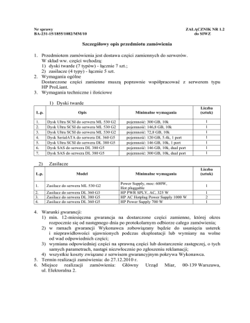 Nr sprawy BA-231-15/1855/1082/MM/10 ZAŁĄCZNIK NR 1.2 do SIWZ Szczegółowy opis przedmiotu zamówienia 1. Przedmiotem zamówienia jest dostawa części zamiennych do serwerów. W skład ww. części wchodzą: 1) dyski twarde (7 typów) - łącznie 7 szt.; 2) zasilacze (4 typy) - łącznie 5 szt. 2. Wymagania ogólne Dostarczone części zamienne muszą poprawnie współpracować z serwerem typu HP ProLiant. 3. Wymagania techniczne i ilościowe 1) Dyski twarde Opis Minimalne wymagania Liczba (sztuk) Dysk Ultra SCSI do serwera ML 530 G2 Dysk Ultra SCSI do serwera ML 530 G2 Dysk Ultra SCSI do serwera ML 530 G2 Dysk SerialATA do serwera DL 360 G5 Dysk Ultra SCSI do serwera DL 380 G5 Dysk SAS do serwera DL 380 G5 Dysk SAS do serwera DL 380 G5 pojemność: 300 GB, 10k pojemność: 146,8 GB, 10k pojemność: 72,8 GB, 10k pojemność: 120 GB, 5.4k, 1 port pojemność: 146 GB, 10k, 1 port pojemność: 146 GB, 10k, dual port pojemność: 300 GB, 10k, dual port 1 1 1 1 1 1 1 Minimalne wymagania Liczba (sztuk) L.p. 1. 2. 3. 4. 5. 6. 7. 2) L.p. Zasilacze Model 1. Zasilacz do serwera ML 530 G2 2. 3. 4. Zasilacz do serwera DL 360 G3 Zasilacz do serwera DL 380 G5 Zasilacz do serwera DL 360 G5 Power Supply, moc: 600W, Hot pluggable HP PWR SPLY, AC, 325 W HP AC Hotplug Power Supply 1000 W HP Power Supply 700 W 1 1 2 1 4. Warunki gwarancji: 1) min. 12-miesięczna gwarancja na dostarczone części zamienne, której okres rozpocznie się od następnego dnia po protokolarnym odbiorze całego zamówienia; 2) w ramach gwarancji Wykonawca zobowiązany będzie do usunięcia usterek i nieprawidłowości ujawnionych podczas eksploatacji lub wymiany na wolne od wad odpowiednich części; 3) wymiana odpowiedniej części na sprawną części lub dostarczenie zastępczej, o tych samych parametrach, nastąpi niezwłocznie po zgłoszeniu reklamacji; 4) wszystkie koszty związane z serwisem gwarancyjnym pokrywa Wykonawca. 5. Termin realizacji zamówienia: do 27.12.2010 r. 6. Miejsce realizacji zamówienia: Główny Urząd Miar, 00-139 Warszawa, ul. Elektoralna 2.