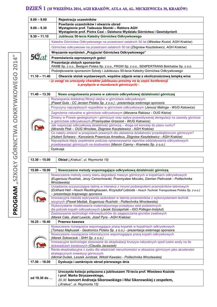 8.00 – 9.00 Rejestracja uczestników Powitanie uczestników i otwarcie obrad Wystąpienie prof. Tadeusza Słomki – Rektora AGH Wystąpienie prof. Piotra Czai – Dziekana Wydziału Górnictwa i Geoinżynierii Jubileusz 50-lecia Katedry Górnictwa Odkrywkowego 9.00 – 9.30 9.30 – 11.10 Katedra Górnictwa Odkrywkowego na przestrzeni ostatnich 50 lat (Wiesław Kozioł, AGH Kraków) PROGRAM „SZKOŁY GÓRNICTWA ODKRYWKOWEGO 2014” Górnictwo odkrywkowe na przestrzeni ostatnich 50 lat (Zbigniew Kasztelewicz, AGH Kraków) Wręczenie wyróżnień „Przyjaciel Górnictwa Odkrywkowego” Przemówienia zaproszonych gości Prezentacje złotych sponsorów RAMB Sp. z o.o., Bestgum Polska Sp. z o.o., PRGW Sp. z o.o., SEMPERTRANS Bełchatów Sp. z o.o. Podziękowanie sponsorom Szkoły i Jubileuszu 50-lecia Katedry Górnictwa Odkrywkowego 11.10 – 11.40 Otwarcie stoisk wystawowych, wspólne zdjęcie wraz z okolicznościową lampką wina - (z uwagi na uroczysty charakter jubileuszu prosimy na tą część konferencji o przybycie w mundurach górniczych) 11.40 – 13.30 Nowe uregulowania prawne w zakresie odkrywkowej działalności górniczej Rozwiązania dokładnej filtracji olejów w górnictwie odkrywkowym (Paweł Gula - CC Jensen Polska Sp. z o.o.) - prezentacja srebrnego sponsora Przyczyny najczęstszych wypadków w górnictwie odkrywkowym (Janusz Malinga - WUG Katowice) Zagrożenia naturalne w górnictwie odkrywkowym (Marzena Rabiasz - OUG Kielce) Zmiany w Prawie geologicznym i górniczym oraz wpływ przewidywanej deregulacji na zawody górnicze w górnictwie odkrywkowym (Przemysław Grzesiok - WUG Katowice) Jak rozpocząć odkrywkową działalność górniczą – droga od koncesji do planu ruchu? (Miranda Ptak – OUG Wrocław, Zbigniew Kasztelewicz - AGH Kraków) Co należy zmienić w przepisach prawnych dla ułatwienia działalności przedsiębiorcom górniczym? (Hubert Schwarz - Kancelaria Prawnicza Amadeus, Zbigniew Kasztelewicz - AGH Kraków) Najczęstsze błędy popełniane podczas opracowywania raportów oddziaływania odkrywkowych przedsięwzięć górniczych na środowisko (Marcin Czerny - Krameko Sp. z o.o.) Dyskusja 13.30 – 15.00 Obiad („Krakus”, ul. Reymonta 15) 15.00 – 18.00 Nowoczesne metody wspomagające odkrywkową działalność górniczą Nowoczesne metody oceny stanu degradacji maszyn górniczych w kopalniach odkrywkowych (Eugeniusz Rusiński, Jerzy Czmochowski, Przemysław Moczko, Damian Pietrusiak - Politechnika Wrocławska) Urządzenia oczyszczające taśmę w interakcji z innymi podzespołami przenośników taśmowych (Eckhard Hell - Hosch Recklinghausen, Krzysztof Lebioda - Hosch Techniki Transportowe Polska Sp. z o.o.) – prezentacja brązowego sponsora Innowacyjna metoda wykrywania uszkodzeń w taśmie przenośników z wykorzystaniem technik wizyjnych (Paweł Maślak, Eugeniusz Rusiński - Politechnika Wrocławska) Wykorzystanie modelowania matematycznego przepływu wód podziemnych dla potrzeb kopalń odkrywkowych (Jacek Szczepiński - IGO Poltegor-Instytut) Zastosowanie technologii mikrowybuchów do zagęszczania gruntów zwałowych (Marek Cała, Józef Lewicki, Józef Pyra - AGH Kraków) 16.25 – 16.40 Przerwa kawowa Nowoczesne rozwiązania wspomagające pracę koparek w kopalniach odkrywkowych (Tomasz Majkusiak - Geotronics Polska Sp. z o.o.) - prezentacja srebrnego sponsora Nowoczesne rozwiązania informatyczne wspomagające pracę kopalń odkrywkowych (Marek Sołowczuk - SHH Sp. z o.o.) Innowacyjne technologie stosowane do eksploatacji kruszyw naturalnych spod lustra wody na tle doświadczeń światowych (Claudia Jacaszek) Renta eksploatacyjna z zysku dla właścicieli nieruchomości w obszarze górniczym jako akcelerator strategicznych inwestycji górniczych (Michał Dudek, Leszek Jurdziak, Witold Kawalec - Politechnika Wrocławska) 17.50 – 18.00 Dyskusja i zamknięcie obrad pierwszego dnia od 19.30 do … Uroczysta kolacja połączona z jubileuszem 70-lecia prof. Wiesława Kozioła i prof. Marka Stryszewskiego, 20.30 koncert Andrzeja Sikorowskiego i Mai Sikorowskiej z zespołem, („Krakus”, ul. Reymonta 15) PROGRAM „SZKOŁY GÓRNICTWA ODKRYWKOWEGO 2014” 9.30 – 11.10 11.10 – 11.25 11.25 – 13.15 13.15 – 14.30 Nowoczesne rozwiązania w kopalniach odkrywkowych węgla brunatnego System szybkiego kartowania terenu oparty na technologii UAV jako nowoczesne narzędzie do monitorowania zmian zachodzących w wyrobisku górniczym (Anna Gawin, Dawid Olczyk - PGE GiEK S.A. Oddział KWB Bełchatów) Zastosowanie cyfrowego modelu jakościowego złoża w procesie uśredniania parametrów kopaliny na przykładzie PGE GiEK S.A. Oddział KWB Turów (Jan Wiśniewski - PGE GiEK S.A. Oddział KWB Turów, Ewa Siata - PRGW Sp. z o.o.) Zastosowanie aplikacji informatycznej Bentley Geo Web Publisher w procesie zarządzania eksploatacją górniczą na przykładzie PGE GiEK S.A. Oddział KWB Turów (Leszek Sondaj - PGE GiEK S.A. Oddział KWB Turów, Grzegorz Bida - PRGW Sp. z o.o.) Zastosowanie narzędzia do projektowania produkcji górniczej SoftMine Eksploatacja ze szczególnym uwzględnieniem integracji z Górniczym Systemem Informatycznym na przykładzie PGE GiEK S.A. Oddział KWB Turów (Marek Praski - PRGW Sp. z o.o.) Zagrożenia osuwiskowe w Zakładzie Górniczym Kopalnia Węgla Brunatnego Bełchatów – system kontroli deformacji dziś i kierunki jego rozwoju (Marek Waldemar Jończyk, Michał Jurczuk - PGE GiEK S.A. Oddział KWB Bełchatów) Technologia prowadzenia robót górniczych w wyrobisku górniczym Pola Szczerców – uwarunkowania geologiczno-górnicze (Edward Sośniak, Damian Kałużny - PGE GiEK S.A. Oddział KWB Bełchatów) Dyskusja Przerwa kawowa Nowoczesne rozwiązania w budowie i eksploatacji maszyn górniczych System monitorowania parametrów i optymalizacji pracy mobilnych maszyn górniczych: ATECHGPS (Andrzej Burda - A-tech s.c.) – prezentacja sponsorska Dobór elementów układu technologicznego w górnictwie surowców skal