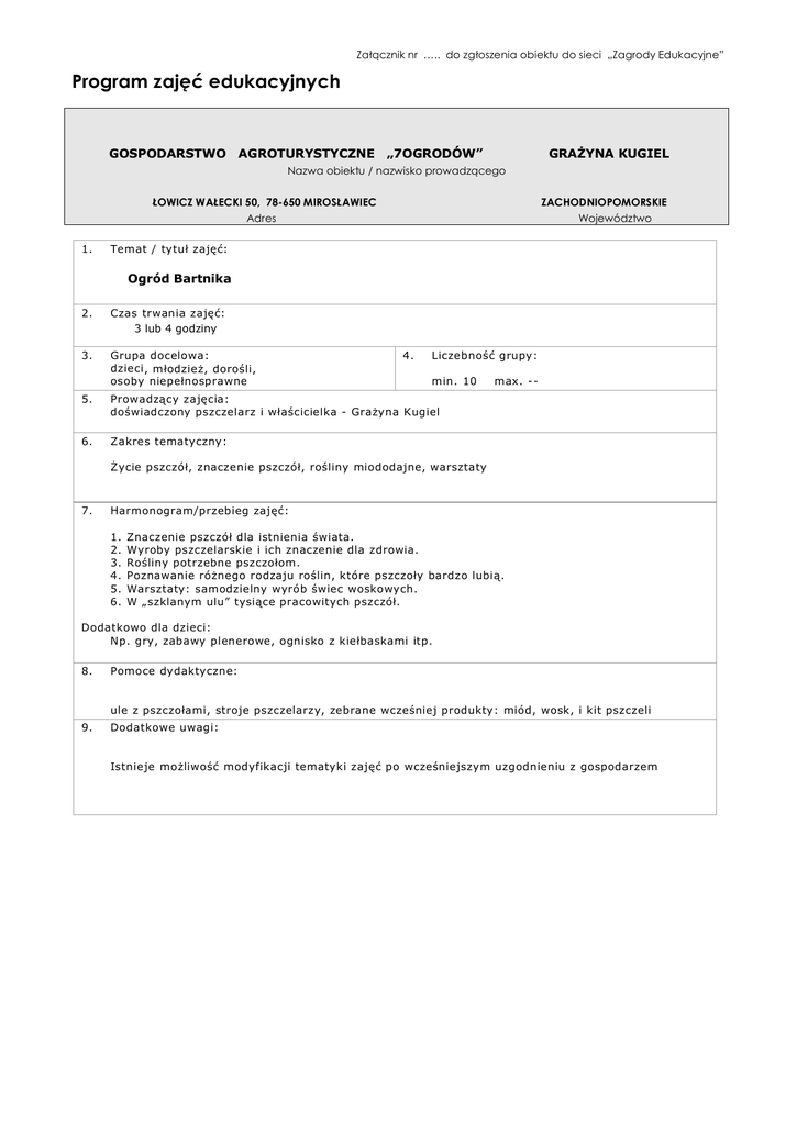 Za cznik nr ….. do zg oszenia obiektu do sieci „Zagrody Edukacyjne” Program zaj edukacyjnych GOSPODARSTWO AGROTURYSTYCZNE „7OGRODÓW” GRA YNA KUGIEL Nazwa obiektu / nazwisko prowadz cego OWICZ WA ECKI 50, 78-650 MIROS AWIEC ZACHODNIOPOMORSKIE Adres 1. Temat / tytu zaj Województwo : Ogród Bartnika 2. Czas trwania zaj : 3 lub 4 godziny 3. Grupa docelowa: dzieci, m odzie , doro li, osoby niepe nosprawne 5. Prowadz cy zaj cia: do wiadczony pszczelarz i w 6. Zakres tematyczny: 4. Liczebno grupy: min. 10 max. -- cicielka - Gra yna Kugiel ycie pszczó , znaczenie pszczó , ro liny miododajne, warsztaty 7. Harmonogram/przebieg zaj 1. 2. 3. 4. 5. 6. : Znaczenie pszczó dla istnienia wiata. Wyroby pszczelarskie i ich znaczenie dla zdrowia. Ro liny potrzebne pszczo om. Poznawanie ró nego rodzaju ro lin, które pszczo y bardzo lubi . Warsztaty: samodzielny wyrób wiec woskowych. W „szklanym ulu” tysi ce pracowitych pszczó . Dodatkowo dla dzieci: Np. gry, zabawy plenerowe, ognisko z kie baskami itp. 8. Pomoce dydaktyczne: ule z pszczo ami, stroje pszczelarzy, zebrane wcze niej produkty: miód, wosk, i kit pszczeli 9. Dodatkowe uwagi: Istnieje mo liwo modyfikacji tematyki zaj po wcze niejszym uzgodnieniu z gospodarzem