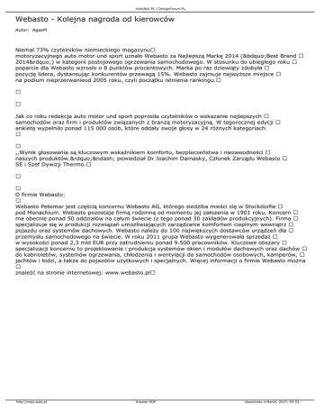 AutoRok.PL / DesignForum.PL Webasto - Kolejna nagroda od kierowców Autor: AgaeM Niemal 73% czytelników niemieckiego magazynu motoryzacyjnego auto motor und sport uznało Webasto za Najlepszą Markę 2014 („Best Brand 2014”) w kategorii postojowego ogrzewania samochodowego. W stosunku do ubiegłego roku poparcie dla Webasto wzrosło o 8 punktów procentowych. Marka po raz dziewiąty zdobyła pozycję lidera, dystansując konkurentów przewagą 15%. Webasto zajmuje najwyższe miejsce na podium nieprzerwanieod 2005 roku, czyli początku istnienia rankingu. Jak co roku redakcja auto motor und sport poprosiła czytelników o wskazanie najlepszych samochodów oraz firm i produktów związanych z branżą motoryzacyjną. W tegorocznej edycji ankietę wypełniło ponad 115 000 osób, które oddały swoje głosy w 24 różnych kategoriach. ,,Wynik głosowania są kluczowym wskaźnikiem komfortu, bezpieczeństwa i niezawodności naszych produktów.”– powiedział Dr Joachim Damasky, Członek Zarządu Webasto SE i Szef Dywizji Thermo. O firmie Webasto: Webasto Petemar jest częścią koncernu Webasto AG, którego siedziba mieści się w Stockdorfie pod Monachium. Webasto pozostaje firmą rodzinną od momentu jej założenia w 1901 roku. Koncern ma obecnie ponad 50 oddziałów na całym świecie (z tego ponad 30 zakładów produkcyjnych). Firma specjalizuje się w produkcji rozwiązań umożliwiających zarządzanie komfortem cieplnym wewnątrz pojazdu oraz systemów dachowych. Webasto należy do 100 największych dostawców urządzeń dla przemysłu samochodowego na świecie. W roku 2011 grupa Webasto wygenerowała sprzedaż w wysokości ponad 2,3 mld EUR przy zatrudnieniu ponad 9.500 pracowników. Kluczowe obszary specjalizacji koncernu to projektowanie i produkcja systemów okien i modułów dachowych oraz dachów do kabrioletów, systemów ogrzewania, chłodzenia i wentylacji do samochodów osobowych, kamperów, jachtów i łodzi, a także do pojazdów użytkowych i specjalnych. Więcej informacji o firmie Webasto można znaleźć na stronie internetowej: www.webasto.pl http://mas.auto.pl Kreator PDF Utworzono 4 March, 2017, 05:53