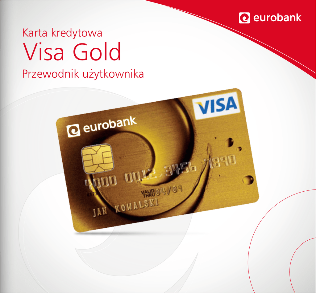 Karta kredytowa Visa Gold Przewodnik użytkownika 1. Aktywacja karty 2. Korzystanie z karty Serdecznie witamy w gronie posiadaczy karty kredytowej Visa Gold eurobanku Udało się, Twoja karta została pomyślnie aktywowana! Aby móc przekonać się o wszystkich zaletach, jakie oferuje nowa karta, najpierw należy ją aktywować. Przed aktywacją sprawdź, czy otrzymałeś kod PIN, ponieważ bez niego nie będziesz mógł korzystać z karty. Aktywuj swoją nową kartę: WWW w serwisie eurobank online, jeśli posiadasz token w placówce eurobanku dzwoniąc do Centrum Obsługi Klienta pod numer 71 799 11 11 – koszt połączenia wg stawki operatora. Gdzie możesz z niej korzystać? Dzięki Visa Gold dokonasz płatności w punktach handlowo-usługowych, sklepach, na stacjach benzynowych, a także zapłacisz za zamówiony przez Internet towar bądź usługę. Wypłaty z bankomatu: Karty możesz także użyć do wypłaty gotówki z bankomatu. Pamiętaj jednak, że okres bezodsetkowy nie obejmuje transakcji gotówkowych, co oznacza, że odsetki od wypłaconej kwoty pobierane są od dnia dokonania transakcji, a dodatkowo zostanie naliczona prowizja za wypłatę z bankomatu. Opłata za kartę: • wystarczy, że w ciągu 3 miesięcy od zawarcia umowy na rachunku zostanie rozliczone co najmniej 5 transakcji bezgotówkowych, a opłata za jej wydanie nie będzie naliczona • jeśli w ciągu 12 miesięcy poprzedzających naliczenie opłaty na rachunku zostanie rozliczone min. 35 transakcji bezgotówkowych lub łączna kwota transakcji bezgotówkowych wyniesie min. 20 000 zł, a opłata roczna za kartę nie zostanie naliczona. Szczegółowe informacje dotyczące kart kredytowych, w tym opłaty i prowizje, znajdziesz na stronie www.eurobank.pl Aby bezpiecznie korzystać z karty, podpisz ją i chroń swój kod PIN. 3. Okres bezodsetkowy 4. Zestawienie transakcji – wyciąg elektroniczny Okres bezodsetkowy, czyli Grace period, jest to okres, za który nie zapłacisz odsetek od transakcji bezgotówkowych pod warunkiem, że całość zadłużenia z ostatniego zestawienia transakcji zostanie spłacona w terminie podanym na tym zestawieniu. W przypadku kart Visa Gold okres bezodsetkowy wynosi d o 52 dni, na który składa się miesięczny cykl rozliczeniowy (od 28 do 31 dni) oraz 21 dni na spłatę zadłużenia. Po zakończeniu okresu rozliczeniowego otrzymasz z Banku wyciąg z karty kredytowej za miniony cykl. Znajdziesz na nim m.in.: informacje o przyznanym limicie, dokonanych kartą transakcjach, całkowitym zadłużeniu, minimalnej kwocie spłaty (która wynosi 5% wykorzystanego limitu, min. 30 zł) oraz terminie płatności i rachunku do spłaty. Termin zakończenia cyklu rozliczeniowego Wybrany termin zakończenia cyklu rozliczeniowego obowiązuje przez cały okres trwania umowy. Jeżeli jako termin zakończenia cyklu rozliczeniowego wybrałeś 26. dzień miesiąca, wówczas termin spłaty będzie wypadał ok. 15.–16. dnia każdego miesiąca. Rysunek poniżej przedstawia przykładowy cykl rozliczeniowy. Sam decydujesz, czy spłacisz całość zadłużenia, czy wymaganą kwotę minimalną. Sam decydujesz, w jakiej formie chcesz otrzymywać zestawienie transakcji. Jeśli otrzymujesz wyciąg pocztą tradycyjną, zachęcamy, byś wybrał wyciąg elektroniczny – wówczas otrzymasz go na swój adres e-mail. Ponadto, wyciąg zawsze udostępniamy w serwisie eurobank online. To znacznie wygodniejszy sposób! Wyciąg elektroniczny – oszczędź czas i środowisko Elektroniczny wyciąg z karty kredytowej w eurobanku to: • wygoda i szybkość – wyciąg w formacie PDF przesyłany jest na Twój adres e-mail w kilka sekund po przygotowaniu go w Banku, • ochrona środowiska, • bezpieczeństwo – nasze wyciągi elektroniczne z karty kredytowej, przesyłane na adres e-mail, podpisane są certyfikatem cyfrowym, gwarantującym autentyczność nadawcy, • elastyczność – w każdej chwili będziesz mógł zmienić opcję wyciągu na inną. Spłata w tym czasie całości zadłużenia (850 zł) gwarantuje, że nie zostaną naliczone odsetki od transakcji bezgotówkowych. Jeśli nie możesz spłacić całości zadłużenia, spłać co najmniej minimalną kwotę spłaty (5% zadłużenia). RRSO na dzień 05.03.2015r. dla przykładu reprezentatywnego przy limicie w wysokości 2500 PLN wykorzystanego w całości poprzez dokonanie jednej transakcji bezgotówkowej z oprocentowaniem 10%, spłacanej w ciągu 24 miesięcy (przez pierwsze 23 miesiące spłaty w wysokości 5% kwoty zadłużenia, w ostatnim, 24 miesiącu spłata pozostałej część zadłużenia), z uwzględnieniem opłaty 100 PLN za wydanie karty i opłaty rocznej za kartę 100 PLN, wynosi 16,41%. Całkowita kwota do zapłaty wynosi: 3 018,64 PLN. Udzielenie kredytu zależne jest od pozytywnej oceny zdolności kredytowej Wnioskodawcy przez Euro Bank S.A. Szczegóły oferty, w tym opłaty i prowizje, Regulamin wydawania i używania kart kredytowych Euro Banku S.A, zakres ubezpieczeń oraz ograniczenia i wyłączenia odpowiedzialności towarzystw ubezpieczeniowych dostępne są w placówkach Euro Banku S.A. i na www.eurobank.pl. Formę udostępniania wyciągu możesz zmienić: • przez Internet – jeśli posiadasz token • w dowolnej placówce eurobanku • przez telefon – jeśli posiadasz Bankowość Telefoniczną. 5. Powiadomienia SMS i Obsługa Automatycznej Spłaty 6. Bankowość Internetowa Nowoczesne usługi pozwalające usprawnić kontrolę salda na rachunku i zarządzać płatnościami Posiadaczowi karty kredytowej Bank umożliwia korzystanie z serwisu eurobank online oraz z aplikacji mobilnej. To szybki, wygodny i bezpieczny internetowy dostęp do informacji o produktach, które posiadasz z dowolnego miejsca i o dowolnej porze. Powiadomienia SMS Masz możliwość ustawienia bezpłatnych powiadomień SMS, dzięki którym otrzymasz na swój telefon informacje o dacie spłaty, wymaganej kwocie i wysokości całkowitego zadłużenia na 7 i 2 