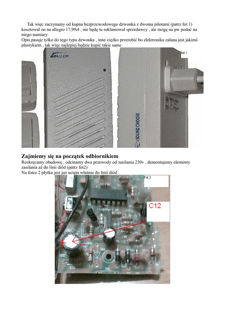 Tak więc zaczynamy od kupna bezprzewodowego dzwonka z dwoma pilotami (patrz fot 1) kosztował on na allegro 17,99zł , nie będę tu reklamował sprzedawcy , ale mogę na pw podać na niego namiary. Opis pasuje tylko do tego typu dzwonka , inne ciężko przerobić bo elektronika zalana jest jakimś plastykiem , tak więc najlepiej będzie kupić takie same Zajmiemy się na początek odbiornikiem Rozkręcamy obudowę , odcinamy dwa przewody od zasilania 230v , demontujemy elementy zasilania aż do linii diód (patrz fot2) Na fotce 2 płytka jest już ucięta właśnie do linii diód . Odnajdujemy na płytce kondensator C12 podłączamy do niego zasilanie z bateri 4,5v (bateria płaska), kondensator ma oznaczenia + i – i tak samo podłączamy zasilanie z bateri. Między plusem bateri a plusem kondensatora montujemy wyłącznik zasilania. Włączamy teraz nasz odbiornik i sprawdzamy czy nadal działa , jeżeli tak to dobrze i możemy działać dalej, zasilanie mamy zrobione . Zajmiemy się teraz sygnalizacją optyczną i pamięcią brania Odnajdujemy przełącznik k1 , na jednym z pinów podczas naciskania przycisku dzwonka pojawia się napięcie dodatnie ok 2v , do tego pinu montujemy rezystor 1kilo , drugą stronę rezystora łączymy z tranzystorem , a resztę podłączamy zgodnie z schematem 3. opis elementów rezystor -1k tranzystor- npn np. bc547b dioda led -np. czerwona rezystor dobrać – dobrać ze względu ograniczenia maksymalnego prądu diody ,im większa rezystancja tym słabiej świeci Teraz pamięć brań , schemat 4 opis schematu 4 t1- pnp np. bc557 t2-npn np. bc547 led- np. zielona r1, r2, r3 -1k c1- 100mikro F (im większa pojemność to dioda świeci dłużej ) R4 dobrać W tym momencie możemy zakończyć przeróbki odbiornika . Dla bardziej wymagających możemy usunąć z odbiornika moduł melodyjek ( ta pionowa płytka ) i głośnik , a zastąpić to przetwornikiem piezo z generatorem , koszt kilka zł ale polecam tą przeróbkę Wtedy podczas brania ryby zamiast tych świątecznych chińskich melodyjek usłyszymy dźwięk podobny do profesjonalnych centralek. Schemat 5 . Podłączenie piezo. I jeszcze kilka ważnych rzeczy na temat odbiornika , na płytce znajduje się cewka L1 po żadnym pozorem nie kręcimy tą śrubką co jest w środku i nie umieszczamy w okolicach jej żadnych przewodów , tranzystorów, itp. Przeróbka nadajnika Nadajniki zasilane są baterią 12v , ale równie dobrze pracują przy 9v , tak więc będą zasilane z naszego sygnalizatora brań schemat 6 Opis schematu 6 . Do plusa i minusa podłączamy wtyczkę cinch Plus dajemy na bolec Tak to powinno wyglądać fot 7 Tak samo postępujemy z drugim nadajnikiem . Przeróbka sygnalizatora. Przeróbka polega na dodaniu wyjścia na nadajnik, czyli w przypadku brania na wyjściu pojawia się 9v. Bedę się wzorował na na najprostszych sygnalizatorach firmy Jaxon , wyprodukowanych przez videotronic fot 8 Jest to najprostszy sygnalizator , w oryginale posiadał tylko jedną diodę sygnalizującą branie ta druga dioda na fot 8 to dorobiona pamięć brania ( ale to już wykracza poza opis centralki). Przeróbkę zaczynamy od rozebrana sygnalizatora i odnalezieniu punktów lutowniczych led 1 resztę podłączamy zgodnie z schematem 9 opis elementów R1 -1k T1 -npn np. bc547 A to już złożony sygnalizator fot 10 Pozostało jeszcze kupić jakieś fajne obudowy(koszt ok 5zł za sztukę ) i jechać na ryby :)