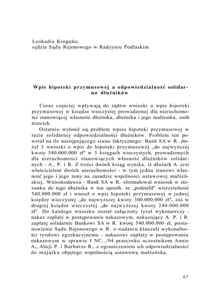 Leokadia Krogulec sędzia Sądu Rejonowego w Radzyniu Podlaskim Wpis hipoteki przymusowej a odpowiedzialność solidarna dłużników Coraz częściej wpływają do sądów wnioski o wpis hipoteki przymusowej w księdze wieczystej prowadzonej dla nieruchomości stanowiącej własność dłużnika, dłużnika i jego małżonka, osób trzecich. Ostatnio wyłonił się problem wpisu hipoteki przymusowej w razie solidarnej odpowiedzialności dłużników. Problem ten powstał na tle następującego stanu faktycznego: Bank SA w R. złożył 3 wnioski o wpis do hipoteki przymusowej „do najwyższej kwoty 540.000.000 zł" w 3 księgach wieczystych, prowadzonych dla nieruchomości stanowiących własność dłużników solidarnych - A., P. i R. Z treści dwóch ksiąg wynika, iż dłużnik A. jest właścicielem dwóch nieruchomości - w tym jedna stanowi własność jego i jego żony na zasadzie wspólności ustawowej małżeńskiej. Wnioskodawca - Bank SA w R. sformułował wniosek w stosunku do tego dłużnika w ten sposób, że „podzielił" wierzytelność 540.000.000 zł i wnosił o wpis hipoteki przymusowej w jednej księdze wieczystej „do najwyższej kwoty 300.000.000 zł", zaś w drugiej księdze wieczystej „do najwyższej kwoty 240.000.000 zł". Do każdego wniosku został załączony tytuł wykonawczy nakaz zapłaty w postępowaniu nakazowym, nakazujący A. P. i R. zapłatę solidarnie Bankowi SA w R. kwotę 540.000.000 zł, postanowienie Sądu Rejonowego w R. o nadaniu klauzuli wykonalności tytułowi egzekucyjnemu - nakazowi zapłaty w postępowaniu nakazowym w sprawie I NC.../94 przeciwko uczestnikom Annie A., Alicji P. i Barbarze R., z ograniczeniem ich odpowiedzialności do majątku objętego wspólnością ustawową małżeńską. 67 REJENT Nr 11 - listopad 1994 r. Dłużnik R. jest właścicielem nieruchomości, dla której prowadzona jest księga wieczysta nr... przez Sąd Rejonowy w R., zaś dłużnik R jest właścicielem nieruchomości wraz z żoną Alicją P. na zasadzie wspólności ustawowej małżeńskiej. Również dla tej nieruchomości prowadzona jest księga wieczysta. Wierzyciel, którego wierzytelność stwierdzona jest tytułem wykonawczym, określonym w przepisach w postępowaniu egzekucyjnym, może na podstawie tego tytułu uzyskać hipotekę na wszystkich nieruchomościach dłużnika (hipoteka przymusowa) 1 . Hipoteka przymusowa powstaje bez względu na wolę właściciela nieruchomości obciążonej, a nawet wbrew jego woli. Podstawą wpisu hipoteki do księgi wieczystej jest wniosek oraz tytuł wykonawczy. Zatem hipotekę przymusową wierzyciel może uzyskać na podstawie tytułu wykonawczego, określonego w przepisach o postępowaniu egzekucyjnym. Tytułami wykonawczymi pochodzącymi od sądu, a stanowiącymi podstawę wpisu hipoteki przymusowej, są: 1) prawomocne orzeczenie sądu zaopatrzone w klauzulę wykonalności, 2) wyrok sądu polubownego lub ugoda zawarta przed takim sądem, 3) inne orzeczenia, ugody i akty, które z mocy ustawy podlegają wykonaniu w drodze egzekucji sądowej, np. tymczasowe zarządzenie sądu, 4) akty notarialne, w których dłużnik poddał się egzekucji. W tym miejscu należy zaznaczyć, iż hipoteka przymusowa może mieć charakter hipoteki zwykłej lub kaucyjnej, w zależności od tego, czy dokument, na podstawie którego dokonany jest wpis, stwierdza ostatecznie istnienie i wysokość wierzytelności, czy też jedynie zabezpiecza jej płatność na czas toczącego się postępowania 2 . Hipoteka przymusowa, wpisana na podstawie dokumentu ustalającego wierzytelność w sposób ostateczny, ma char a k t e r hipoteki zwykłej. Hipoteka przymusowa, wpisana na 1 68 Art. 109 ust. 1 ustawy z dn. 6 VII 1982 r. o księgach wieczystych i hipotece (Dz.U. Nr 19, poz. 147, zm.: Dz.U. z 1991 r. Nr 22, poz. 92 i Nr 115, poz. 496). 2 J. Ignatowicz, Prawo rz 1994, s. 257. Wpis hipoteki przymusowej. podstawie orzeczenia, w którym wierzytelność nie została ustalona w sposób ostateczny, zabezpiecza płatność przez czas toczącego się postępowania albo jej istnienie nie jest pewne - ma charakter hipoteki kaucyjnej 3 . Chodzi tu o takie orzeczenie, jak: tymczasowe zarządzenie sądu, orzeczenie nieprawomocne - zaopatrzone w rygor natychmiastowej wykonalności, postanowienie prokuratora (wydane w sprawie karnej). Hipoteka przymusowa nie ma charakteru generalnego, a użyte w art. 109 ust. 1 ustawy o księgach wieczystych i hipotece sformułowanie, iż można ją uzyskać na wszystkich nieruchomościach dłużnika oznacza, że wierzyciel jest uprawniony do żądania obciążenia hipoteką przymusową każdej nieruchomości znajdującej się w majątku dłużnika. Ustawodawca nie wprowadził tu wyjątku od zasady szczegółowości hipoteki i wierzyciel może żądać wpisu kilku odrębnych hipotek, a nie jednaj hipoteki na kilku nieruchomościach 4 . W myśl art. 65 ust. 1 ustawy o księgach wieczystych i hipotece - w celu zabezpieczenia oznaczonej wierzytelności można nieruchomość obciążyć prawem, na mocy którego wierzyciel może dochodzić zaspokojenia z nieruchomości bez względu na to, czyją stała się własnością, i z pierwszeństwem przed wierzycielami osobistymi właściciela nieruchomości. Dłużnik osobisty i właściciel nieruchomości obciążonej hipoteką mogą być różnymi osobami. Wobec wierzyciela hipotecznego odpowiedzialność ponoszą: dłużnik osobisty oraz właściciel obciążonej nieruchomości. Zatem, wierzyciel hipoteczny ma wówczas dwóch dłużników: osobistego i rzeczowego 5 . Przyczyny rozdwojenia odpowiedzialności są różne. Po pierwsze, właściciel nieruchomości może zgodzić się na ustanowienie hipoteki, która zabezpiecza wówczas cudzy dług. Już w chwili 4 5 3 S. Rudnicki, Komentarz do ustawy o szawa 1993, s. 232. M. Bednarek, M. J a m k a , B. Kordasiewicz. Hipoteka na lokalach spółdzielczych oraz formy zabezpieczeń kredytów, Agencja Informacyjna, Warszawa 1991, s. 60
