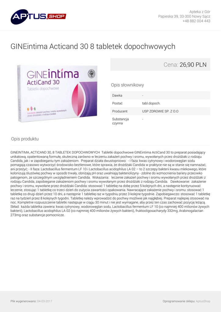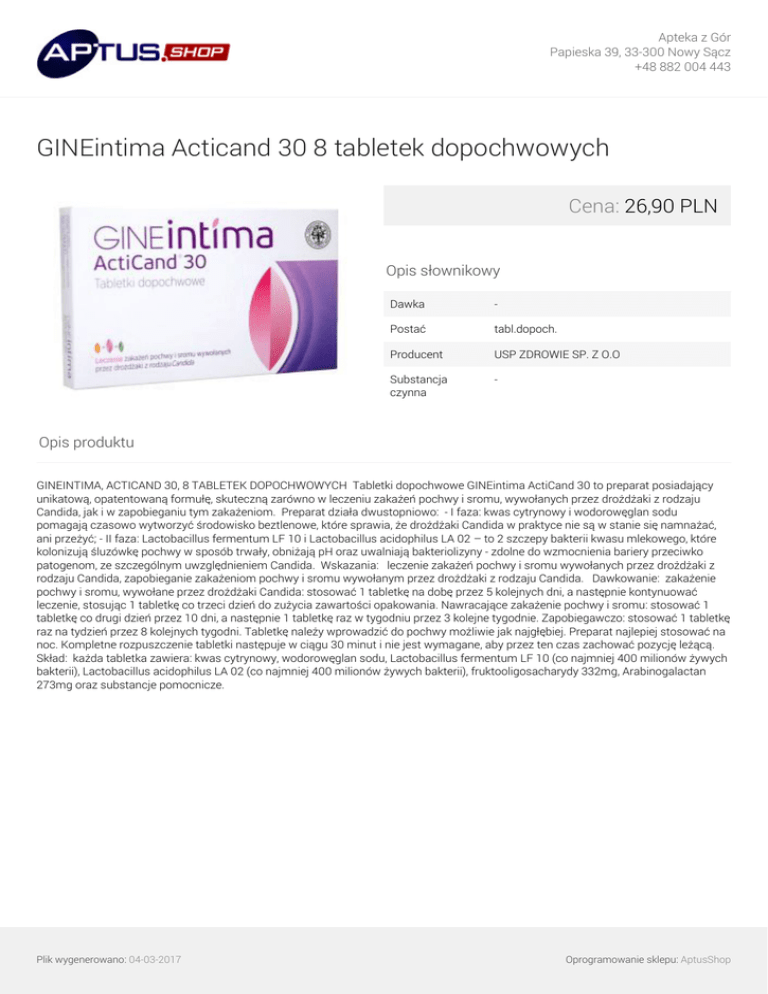 Apteka z Gór Papieska 39, 33-300 Nowy Sącz +48 882 004 443 GINEintima Acticand 30 8 tabletek dopochwowych Cena: 26,90 PLN Opis słownikowy Dawka - Postać tabl.dopoch. Producent USP ZDROWIE SP. Z O.O Substancja czynna - Opis produktu GINEINTIMA, ACTICAND 30, 8 TABLETEK DOPOCHWOWYCH Tabletki dopochwowe GINEintima ActiCand 30 to preparat posiadający unikatową, opatentowaną formułę, skuteczną zarówno w leczeniu zakażeń pochwy i sromu, wywołanych przez drożdżaki z rodzaju Candida, jak i w zapobieganiu tym zakażeniom. Preparat działa dwustopniowo: - I faza: kwas cytrynowy i wodorowęglan sodu pomagają czasowo wytworzyć środowisko beztlenowe, które sprawia, że drożdżaki Candida w praktyce nie są w stanie się namnażać, ani przeżyć; - II faza: Lactobacillus fermentum LF 10 i Lactobacillus acidophilus LA 02 – to 2 szczepy bakterii kwasu mlekowego, które kolonizują śluzówkę pochwy w sposób trwały, obniżają pH oraz uwalniają bakteriolizyny - zdolne do wzmocnienia bariery przeciwko patogenom, ze szczególnym uwzględnieniem Candida. Wskazania: leczenie zakażeń pochwy i sromu wywołanych przez drożdżaki z rodzaju Candida, zapobieganie zakażeniom pochwy i sromu wywołanym przez drożdżaki z rodzaju Candida. Dawkowanie: zakażenie pochwy i sromu, wywołane przez drożdżaki Candida: stosować 1 tabletkę na dobę przez 5 kolejnych dni, a następnie kontynuować leczenie, stosując 1 tabletkę co trzeci dzień do zużycia zawartości opakowania. Nawracające zakażenie pochwy i sromu: stosować 1 tabletkę co drugi dzień przez 10 dni, a następnie 1 tabletkę raz w tygodniu przez 3 kolejne tygodnie. Zapobiegawczo: stosować 1 tabletkę raz na tydzień przez 8 kolejnych tygodni. Tabletkę należy wprowadzić do pochwy możliwie jak najgłębiej. Preparat najlepiej stosować na noc. Kompletne rozpuszczenie tabletki następuje w ciągu 30 minut i nie jest wymagane, aby przez ten czas zachować pozycję leżącą. Skład: każda tabletka zawiera: kwas cytrynowy, wodorowęglan sodu, Lactobacillus fermentum LF 10 (co najmniej 400 milionów żywych bakterii), Lactobacillus acidophilus LA 02 (co najmniej 400 milionów żywych bakterii), fruktooligosacharydy 332mg, Arabinogalactan 273mg oraz substancje pomocnicze. Plik wygenerowano: 04-03-2017 Powered by TCPDF (www.tcpdf.org) Oprogramowanie sklepu: AptusShop