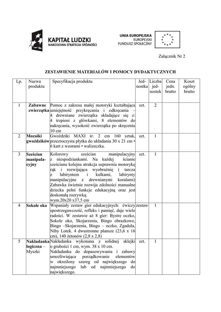 Załącznik Nr 2 ZESTAWIENIE MATERIAŁÓW I POMOCY DYDAKTYCZNYCH Lp. 1 2 3 4 5 Nazwa produktu Specyfikacja produktu Jed- Liczba Cena nostka jedjedn. nostek brutto Zabawne Pomoc z zakresu małej motoryki kształtująca szt. zwierzątka umiejętność przykręcania i odkręcania – 4 drewniane zwierzątka składające się z: 4 trzpieni z główkami, 8 elementów do nakręcania, wysokość zwierzątka po skręceniu 10 cm Gwoździki MAXI śr. 2 cm 160 sztuk, szt. Mozaiki gwoździków przezroczysta płytka do układania 30 x 21 cm • 6 kart z wzorami • walizeczka. 2 Kolorowy sześcian manipulacyjny szt. Sześcian ścianie manipula- z niespodziankami. Na każdej sześcianu kolejna atrakcja usprawnia motorykę cyjny rąk i rozwijająca wyobraźnię ( tarcza z labiryntem i kulkami, labirynty manipulacyjne z drewnianymi koralami) Zabawka świetnie rozwija zdolności manualne dziecka pełni funkcje edukacyjną oraz jest doskonałą rozrywką. wym.20x20 x37,5 cm Sokole oko Wspaniały zestaw gier edukacyjnych: ćwiczy zestaw spostrzegawczość, refleks i pamięć, daje wiele radości. W zestawie aż 8 gier: Bystre oczko, Sokole oko, Skojarzenia, Bingo obrazkowe, Bingo –Skojarzenia, Bingo – oczko, Zgadula, Niby Lotek. 4 dwustronne plansze (23,6 x 16 cm), 140 żetonów (2,8 x 2,8) Nakładanka Nakładanka wykonana z solidnej sklejki szt. logiczna – o grubości 1 cm, wym. 38 x 10 cm. Myszki Nakładanka do dopasowywania i zabawy umożliwiająca porządkowanie elementów w określony szereg od największego do najmniejszego lub od najmniejszego do największego. 1 1 1 1 Koszt ogólny brutto 6 7 8 9 10 11 12 Nakładanka Nakładanka wykonana z solidnej sklejki szt. logiczna – o grubości 1 cm, wym. 38 x 10 cm. Koniki Nakładanka do dopasowywania i zabawy umożliwiająca porządkowanie elementów w określony szereg od największego do najmniejszego lub od najmniejszego do największego. Nakładanka Nakładanka wykonana z solidnej sklejki szt. logiczna – o grubości 1 cm, wym. 38 x 10 cm. Kaczuszki. Nakładanka do dopasowywania i zabawy umożliwiająca porządkowanie elementów w określony szereg od największego do najmniejszego lub od najmniejszego do największego. Magnetycz- dwustronne plansze, 2 arkusze z elementami szt. ne obrazki: magnetycznymi Seria układanek opartych na kolorowej planszy Wieś i i ruchomych elementach magnetycznych. Safari W czasie zabawy dzieci eksperymentują z rozkładaniem elementów na planszy, a w każdej chwili mogą to ułożenie zmienić. Magnetycz- dwustronne plansze, 2 arkusze z elementami szt. ne obrazki: magnetycznymi Ubieranki Seria układanek opartych na kolorowej planszy i ruchomych elementach magnetycznych. W czasie zabawy dzieci eksperymentują z rozkładaniem elementów na planszy, a w każdej chwili mogą to ułożenie zmienić. Karty do .Wzory kart z przykładami do układania zestaw płaskich wzorów z drewnianych kształtów. drewniaPoprzez komponowanie wielu wzorów dziecko nych kształtów – uczy się precyzji, doskonali spostrzegawczość, sortuje i przyporządkowuje figury według Wzory kształtu i koloru. 12 kart o wzrastającym płaskie stopniu trudności. Wym. 21 x 29,5 cm. zestaw drewnianych elementów zestaw Drewniane Duży złożonych z różnorodnych figur kształty geometrycznych oraz małych krążków i cylindrów. Ilość oraz różnorodność elementów pozwala na ułożenie ciekawej mozaiki, układanek geometrycznych w poziomie oraz wieżyczek i konstrukcji w pionie – 100 sztuk. Drewniane kostki domina ukazują dzieciom zestaw Domino w 10 kolorowych motywów i 10 cieni. Zabawa cieni oparta na znanej zasadzie domina, polegająca na dokładaniu cienia do jego barwnego odpowiednika. Prosta i jasna forma obrazka jest czytelna dla dzieci od 2 lat. 12 kostek o wym. 12 x 6 cm w drewnianym pudełku. 1 1 1 1 1 1 1 13 14 15 16 17 18 19 Układanka Drewniana układanka do nauki figur matematycz geometrycznych i liczenia w zakresie 1-6. Układanka zawiera plansze z cyframi na i ilustracją figur geometrycznych. Dodatkowo na drewnianych bolczykach umieszczone są figury geometryczne z ilością dziurek odpowiadającą danej cyfrze. 30x17x5,5cm puzzle nakładanki dla Nakładanka Drewniane ambulans najmłodszych. Wszystkie elementy posiadają wygodne dla ręki dziecka uchwyty. Wprowadzają do zabawy naukę podstawowych słów związanych z otoczeniem człowieka. wym.17,5x17,5x2,1cm Nakładki Nakładanka o obrazkach tak prostych z uchwytem i kolorowych, że małe dzieci nie przejdą 20x20cm - obojętnie. Wyjątkowo duże uchwyty ułatwiające umieszczanie elementów Kolory w podstawie. Podczas dopasowania doskonalona jest także umiejętność kojarzenia - pod elementem kryje się podpowiedź (kolor lub fragment dopasowywanego obrazka). Podstawa o wym. 22 x 22 cm ma grubość 8 mm Nakładki Nakładanka o obrazkach tak prostych z uchwytem i kolorowych, że małe dzieci nie przejdą 20x20cm - obojętnie. Wyjątkowo duże uchwyty umieszczanie elementów Zwierzęta. ułatwiające w podstawie. Podczas dopasowania doskonalona jest także umiejętność kojarzenia - pod elementem kryje się podpowiedź (kolor lub fragment dopasowywanego obrazka). Podstawa o wym. 22 x 22 cm ma grubość 8 mm Nakładanka Nakładanka, dzięki której dziecko odkrywa pojęcia: kształtu, wielkości i kierunku. Domek Poszczególne elementy wyposażone są w kołeczek, który prowokuje dziecko do chwytanie w 3 palce. wym. 23,5x15,5cm, 7 elementów Nakładanka Nakładanka, dzięki której dziecko odkrywa pojęcia: kształtu, wielkości i kierunku. Kwiatek Poszczególne elementy wyposażone są w kołeczek, który prowokuje dziecko do chwytanie w 3 palce. wym. 23,5x15,5cm, 7 elementów Nakładanka Nakładanka, dzięki której dziecko odkrywa Lokomoty- pojęcia: kształtu, wielkości i kierunku. Poszczególne elementy wyposażone są wa w kołeczek, który prowokuje dziecko do chwytanie w 3 palce. szt. 1 szt. 1 szt. 1 szt. 1 szt. 1 szt. 1 szt. 1 wym. 23,5x15,5cm, 8 elemen