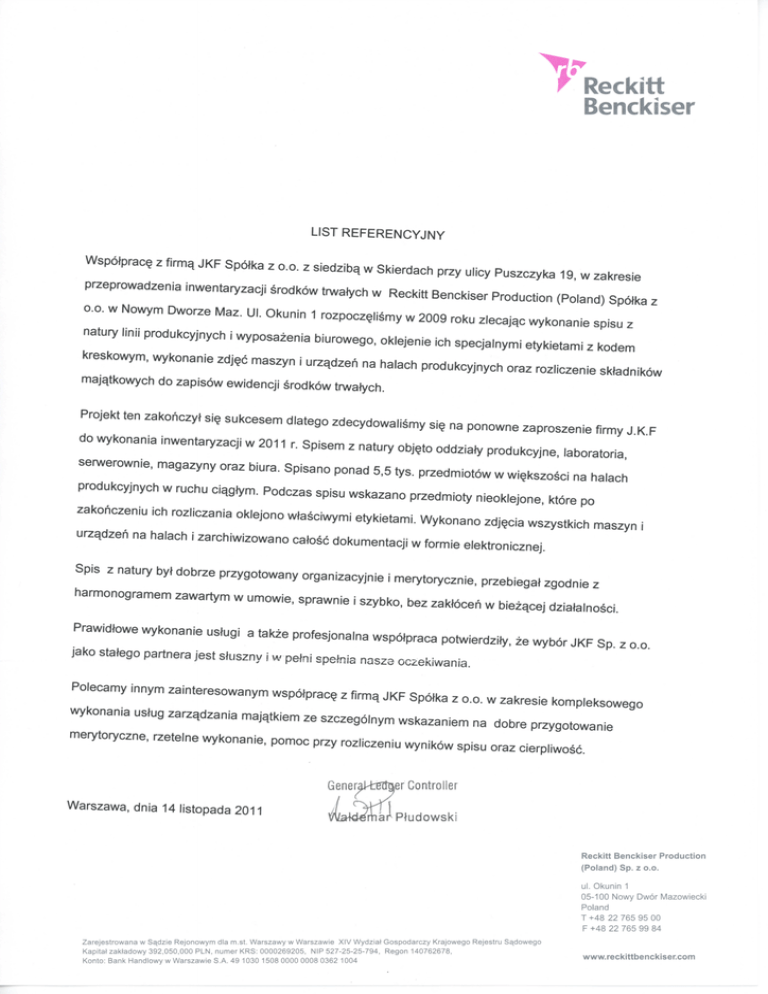 Reckitt Benckiser LIST REFERENCYJNY Wspolprace z firmq JKF Spolka z o.o. z siedzibq w Skierdach przy ulicy Puszczyka 19, w zakresie przeprowadzenia inwentaryzacji srodkow trwatych w Reckitt Benckiser Production (Poland) Spolka z o.o. w Nowym Dworze Maz. Ul. Okunin 1 rozpocz^lismy w 2009 roku zlecajgc wykonanie spisu z natury linii produkcyjnych i wyposazenia biurowego, oklejenie ich specjalnymi etykietami z kodem kreskowym, wykonanie zdj?c maszyn i urzqdzeh na halach produkcyjnych oraz rozliczenie skladnikow majqtkowych do zapisow ewidencji srodkow trwatych. Projekt ten zakohczyl si? sukcesem diatego zdecydowalismy si? na ponowne zaproszenie firmy J.K.F do wykonania inwentaryzacji w 2011 r. Spisem z natury obj?to oddziaty produkcyjne, laboratoria, serwerownie, magazyny oraz biura. Spisano ponad 5,5 tys. przedmiotow w wi?kszosci na halach produkcyjnych w ruchu ciqgtym. Podczas spisu wskazano przedmioty nieoklejone, ktore po zakohczeniu ich rozliczania oklejono wlasciwymi etykietami. Wykonano zdj?cia wszystkich maszyn i urzqdzeh na halach i zarchiwizowano calosc dokumentacji w formie elektronicznej. Spis z natury byl dobrze przygotowany organizacyjnie i merytorycznie, przebiegal zgodnie z harmonogramem zawartym w umowie, sprawnie i szybko, bez zakloceh w biezqcej dzialalnosci. Prawidlowe wykonanie uslugi a takze profesjonalna wspolpraca potwierdzify, ze wybor JKF Sp. z o.o. jako stalego partnera jest sluszny i w pelni spelnia nasza cczekiwania. Polecamy innym zainteresowanym wspolprac? z firmq JKF Spolka z o.o. w zakresie kompleksowego wykonania uslug zarzgdzania majqtkiem ze szczegolnym wskazaniem na dobre przygotowanie merytoryczne, rzetelne wykonanie, pomoc przy rozliczeniu wynikow spisu oraz cierpliwosc. GeneraH^aer Controller Warszawa, dnia 14 listopada 2011 larPludowski Reckitt Benckiser Production (Poland) Sp. z o.o. ul. Okunin 1 05-100 Nowy Dwor Mazowiecki Poland T +48 22 765 95 00 F +48 22 765 99 84 www.reckittbenckiser.com