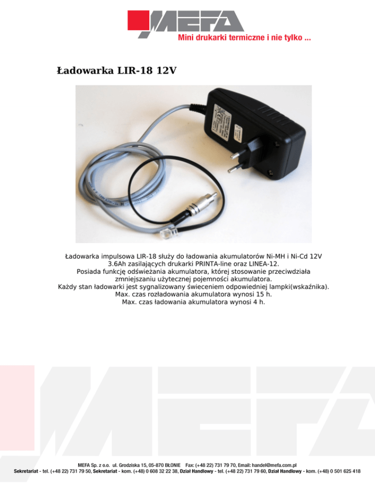 Ładowarka LIR-18 12V Ładowarka impulsowa LIR-18 służy do ładowania akumulatorów Ni-MH i Ni-Cd 12V 3.6Ah zasilających drukarki PRINTA-line oraz LINEA-12. Posiada funkcję odświeżania akumulatora, której stosowanie przeciwdziała zmniejszaniu użytecznej pojemności akumulatora. Każdy stan ładowarki jest sygnalizowany świeceniem odpowiedniej lampki(wskaźnika). Max. czas rozładowania akumulatora wynosi 15 h. Max. czas ładowania akumulatora wynosi 4 h.