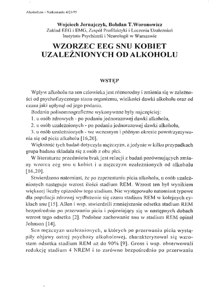 Celem pracy było porównanie wzorca eeg snu kobiet uzależnionych od alkollOlu ze wzorcem snu kobiet zdrowych oraz mężczyzn uzależnionych od