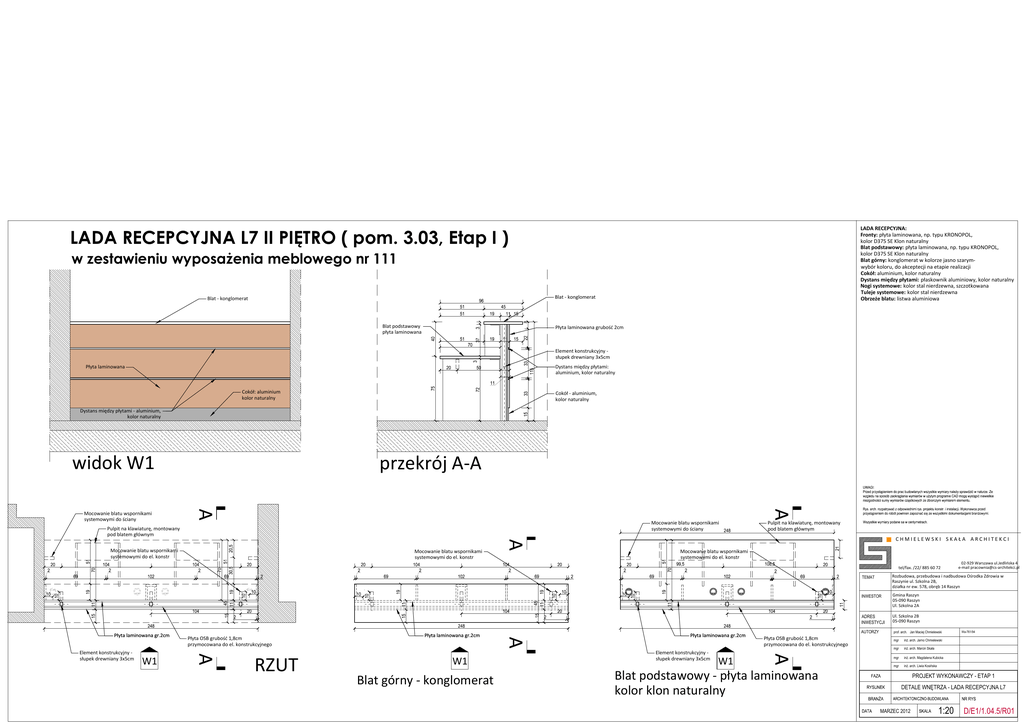 LADA RECEPCYJNA: Fronty: kolor D375 SE Klon naturalny Blat podstawowy: kolor D375 SE Klon naturalny konglomerat w kolorze jasno szarymaluminium, kolor naturalny Nogi systemowe: kolor stal nierdzewna, szczotkowana Tuleje systemowe: kolor stal nierdzewna listwa aluminiowa Blat - konglomerat Blat - konglomerat Blat podstawowy Element konstrukcyjny - aluminium, kolor naturalny kolor naturalny kolor naturalny kolor naturalny widok W1 Mocowanie blatu wspornikami Mocowanie blatu wspornikami systemowymi do el. konstr A Mocowanie blatu wspornikami systemowymi do el. konstr A A Mocowanie blatu wspornikami Mocowanie blatu wspornikami systemowymi do el. konstr tel/fax. /22/ 885 60 72 TEMAT A przymocowana do el. konstrukcyjnego Element konstrukcyjny - RZUT W1 W1 A W1 A Element konstrukcyjny - przymocowana do el. konstrukcyjnego Raszynie ul. Szkolna 2B, INWESTOR Gmina Raszyn 05-090 Raszyn Ul. Szkolna 2A ADRES INWESTYCJI Ul. Szkolna 2B 05-090 Raszyn AUTORZY e-mail [email protected] prof. arch. Jan Maciej Chmielewski Wa-761/94 mgr mgr mgr mgr PROJEKT WYKONAWCZY - ETAP 1 kolor klon naturalny MARZEC 2012 1:20 D/E1/1.04.5/R01