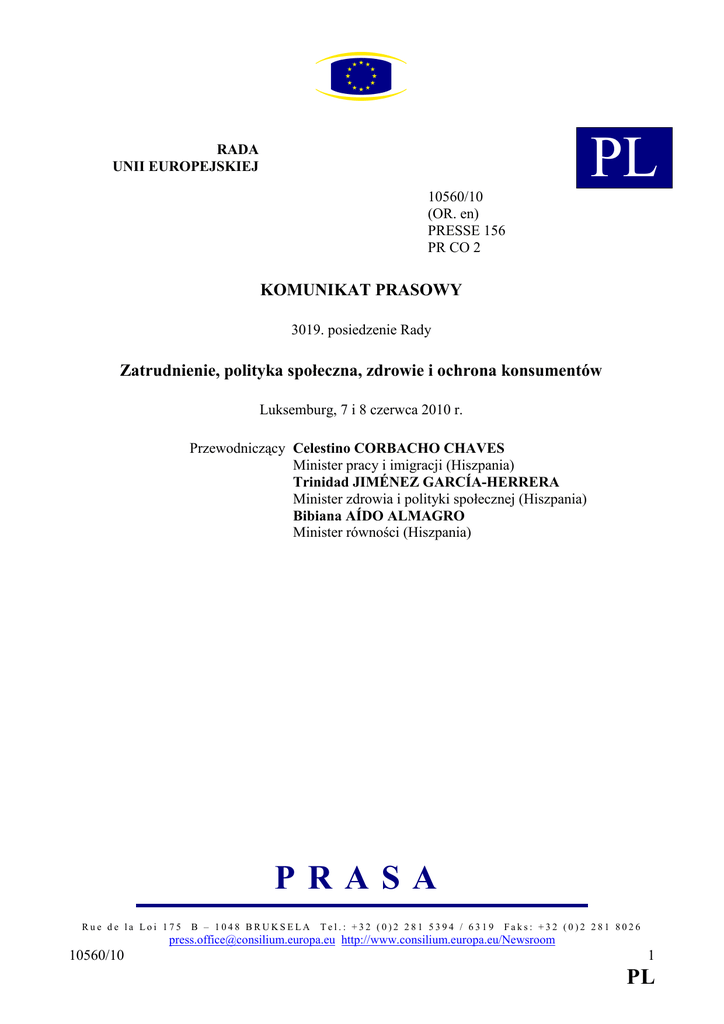 PL RADA UNII EUROPEJSKIEJ 10560/10 (OR. en) PRESSE 156 PR CO 2 KOMUNIKAT PRASOWY 3019. posiedzenie Rady Zatrudnienie, polityka społeczna, zdrowie i ochrona konsumentów Luksemburg, 7 i 8 czerwca 2010 r. Przewodniczący Celestino CORBACHO CHAVES Minister pracy i imigracji (Hiszpania) Trinidad JIMÉNEZ GARCÍA-HERRERA Minister zdrowia i polityki społecznej (Hiszpania) Bibiana AÍDO ALMAGRO Minister równości (Hiszpania) PRASA Rue de la Loi 175 B – 1048 BRUKSELA Tel.: +32 (0)2 281 5394 / 6319 Faks: +32 (0)2 281 8026 [email protected] http://www.consilium.europa.eu/Newsroom 10560/10 1 PL 7-8.VI.2010 Główne wyniki posiedzenia Rady Rada przeprowadziła debatę orientacyjną na temat strategii Europa 2020 i uzgodniła cel UE w zakresie włączenia społecznego, który ma zostać osiągnięty w szczególności dzięki zmniejszaniu ubóstwa, a takŜe odpowiednie wskaźniki, co będzie stanowiło jej wkład w czerwcowe posiedzenie Rady Europejskiej. Wypracowała teŜ podejście ogólne w sprawie wytycznych dotyczących polityki zatrudnienia państw członkowskich, które słuŜyć będą do realizacji strategii Europa 2020. Rada zatwierdziła opinię Komitetu Ochrony Socjalnej pt. „Solidarność w zdrowiu: zmniejszanie nierówności zdrowotnych w UE” oraz z zadowoleniem przyjęła śródokresowe wspólne sprawozdanie Komitetu Polityki Gospodarczej i Komitetu Ochrony Socjalnej na temat świadczeń emerytalnych, które komitety te mają przyjąć jeszcze w tym roku. Ponadto Rada przyjęła konkluzje w sprawie następujących czterech aspektów zatrudnienia i polityki społecznej: • nowe umiejętności w nowych miejscach pracy; • trwałe systemy zabezpieczenia społecznego realizujące cele dotyczące adekwatnych świadczeń emerytalnych i włączenia społecznego; • aktywność osób starszych; • dalsza integracja Romów. Ministrowie uzgodnili stanowiska, jakie zajmie UE w ramach rad (stabilizacji i) stowarzyszenia z sześcioma państwami trzecimi (Tunezja, Maroko, Algieria, Izrael, Chorwacja i Była Jugosłowiańska Republika Macedonii) w odniesieniu do przyjęcia przepisów dotyczących koordynacji systemów zabezpieczenia społecznego. Rada przyjęła takŜe rezolucję w sprawie nowych europejskich ram dotyczących niepełnosprawności na lata 2010–2020. Rada bez debaty zaakceptowała projekt rozporządzenia obejmującego obywateli państw trzecich przepisami UE w zakresie koordynacji uprawnień w ramach systemów zabezpieczenia społecznego. JeŜeli chodzi o zdrowie i ochronę konsumentów, Rada zaakceptowała projekt dyrektywy w sprawie praw pacjenta w transgranicznej opiece zdrowotnej. Ministrowie przeprowadzili debatę orientacyjną dotyczącą projektu rozporządzenia w sprawie przekazywania konsumentom informacji na temat Ŝywności. Rada przyjęła takŜe dwa zestawy konkluzji zatytułowane: • „Równość i zdrowie we wszystkich obszarach polityki: solidarność w zdrowiu” • „Działania na rzecz zmniejszenia spoŜycia soli w celu poprawy stanu zdrowia ludności.” Całe posiedzenie Rady (z wyjątkiem spraw dotyczących zdrowia i ochrony konsumentów omawianych w punkcie „Sprawy róŜne”) było otwarte dla publiczności, a jego nagranie w formie strumieniowej transmisji wideo jest dostępne na stronie internetowej Rady: http://video.consilium.europa.eu. 10560/10 2 PL 7-8.VI.2010 SPIS TREŚCI1 UCZESTNICY....................................................................................................................................5 OMAWIANE PUNKTY ZATRUDNIENIE I POLITYKA SPOŁECZNA .................................................................................8 Dyrektywa w sprawie zasady równego traktowania ............................................................................8 Przygotowanie czerwcowego posiedzenia Rady Europejskiej ............................................................9 Nierówności zdrowotne i świadczenia emerytalne ............................................................................11 Trwałe systemy zabezpieczenia społecznego warunkiem adekwatnych świadczeń emerytalnych ......................................................................................................................................11 Nowe umiejętności w nowych miejscach pracy: dalsze działania .....................................................12 Koordynacja systemów zabezpieczenia społecznego z sześcioma państwami trzecimi....................13 Dalsza integracja Romów...................................................................................................................14 Aktywność osób starszych .................................................................................................................14 Nowe europejskie ramy dotyczące niepełnosprawności ....................................................................15 Rozmowy podczas obiadu ministrów odpowiedzialnych za politykę zatrudnienia i politykę społeczną ............................................................................................................................................15 ZDROWIE I OCHRONA KONSUMENTÓW..................................................................................15 Prawa pacjenta w transgranicznej opiece zdrowotnej........................................................................15 Dostarczanie konsumentom informacji o Ŝywności...........................................................................18 Równość i zdrowie we wszystkich obszarach polityki: solidarność w zdrowiu................................19 Zmniejszenie spoŜycia soli w celu poprawy stanu zdrowia...............................................................19 1 JeŜeli deklaracje, konkluzje lub rezolucje zostały przez Radę formalnie przyjęte, jest to zaznaczone w tytule danego punktu, a tekst jest umieszczony w cudzysłowie. Dokumenty, do których odesłano w tekście, są dostępne na internetowej stroni