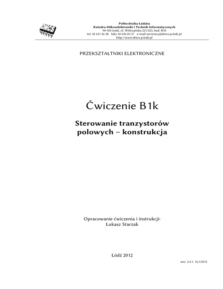 90-924 Łódź, ul. Wólczańska 221/223, bud. B18 tel. 42 631 26 28 faks 42 636 03 27 e-mail [email protected] http://www.dmcs.p.lodz.pl PRZEKSZTAŁTNIKI ELEKTRONICZNE Ćwiczenie B1k Opracowanie ćwiczenia i instrukcji: Łukasz Starzak Łódź 2012 wer. 2.4.1. 16.3.2012 1. Cel i przebieg ćwiczenia......................................................................................................................................5 2. Praktyczne układy sterowania ..........................................................................................................................7 2.1. 2.2. Analogowy obwód kondycjonujący przycisku..................................................................................7 Niesymetryczne sterowanie bramki .....................................................................................................8 3. Konstrukcja układu..............................................................................................................................................9 3.1. Zestaw konstrukcyjny..............................................................................................................................9 Płytka montażowa..............................................................................................................................9 Elementy zamontowane na stałe................................................................................................. 10 3.2. 3.3. Montaż .......................................................................................................................................................13 Uruchomienie i testowanie ...................................................................................................................14 Konfiguracja układu pomiarowego ............................................................................................ 14 Sprawdzenie ogólnej poprawności działania........................................................................... 14 Działanie zaprojektowanego układu sterowania .................................................................... 15 Niesymetryczne sterowanie bramki........................................................................................... 15 Obwód kondycjonujący przycisku ............................................................................................. 15 Zakończenie...................................................................................................................................... 16 4. Opracowanie i analiza wyników ....................................................................................................................17 Odczyt wyników liczbowych ....................................................................................................... 17 Weryfikacja wyników i założeń projektu................................................................................. 17 Niesymetryczne sterowanie bramki........................................................................................... 18 Analogowy obwód kondycjonujący przycisku ....................................................................... 18 5. Literatura ..............................................................................................................................................................19 © 2012 Łukasz Starzak, Katedra Mikroelektroniki i Technik Informatycznych Politechniki Łódzkiej B Wprowadzenie do ćwiczenia 1. Cel i przebieg ćwiczenia Celem niniejszej części ćwiczenia jest konstrukcja układu sterowania dla tranzystora MOSFET mocy oraz doświadczalna weryfikacja założeń i wyników projektu. Przy okazji możliwe będzie zapoznanie się z praktycznym obwodem eliminującym negatywny wpływ drgań styków przycisku na działanie sterowanego układu. © 2012 Łukasz Starzak, Katedra Mikroelektroniki i Technik Informatycznych Politechniki Łódzkiej 2. Praktyczne układy sterowania 2.1. Analogowy obwód kondycjonujący przycisku W układach sterowania zazwyczaj występuje interfejs użytkownika, w którym zadania są definiowane i zmieniane najczęściej za pomocą przycisków. W momentach wciskania i zwalniania przycisku występują drgania jego styków powodujące, że klucz kilkakrotnie zamyka się i otwiera zanim znajdzie się w pozycji ustalonej. W konstruowanym w niniejszym ćwiczeniu układzie przycisk (klucz K1 na rys. 3) zostanie wykorzystany do realizacji funkcji załączania i wyłączania generatora, dzięki czemu nie chłodzony tranzystor nie przegrzeje się. Z powodów podanych wyżej, przycisk ten wymaga obwodu kondycjonującego. Sprawi on, że wciśnięcie i zwolnienie przycisku spowoduje wygenerowanie czystego przebiegu prostokątnego, bez drgań na początku i końcu, który w pewny sposób uaktywni, a następnie wyłączy generator sterujący bramką tranzystora. Jednym z typowych rozwiązań analogowych tego problemu jest obwód oparty na układzie scalonym 4093, przedstawiony na rys. 3. Składają się nań następujące elementy. Obwód RC (opornik R2 i kondensator C4) – spowalnia opadanie potencjału na wejściu H układu U1 w chwili, gdy klucz K1 zostanie zamknięty (wciśnięcie przycisku), oraz jego narastanie, gdy klucz zostanie otwarty. W ten sposób krótkotrwałe przełączenia między potencjałem masy a potencjałem zasilania, wynikające z drgań styków, zostają wygładzone. Dodatkowo opornik R2 ogranicza prąd pobierany z zasilania w czasie, gdy klucz K1 jest zamknięty. Opornik R1 tworzy z kolei połączenie wejścia H układu U1 z potencjałem zasilania (logiczną jedynką) w czasie, gdy klucz K1 jest zamknięty. Jest to konieczne, bowiem kondensator w stanie ustalonym stanowi rozwarcie, a więc wejście H byłoby do niczego nie podłączone. Wystąpiłby więc na nim nieznany stan logiczny, co spowodowałoby nieprzewidywalne działanie układu. Bramka NAND z przerzutnikiem Schmitta na wejściu (ukła